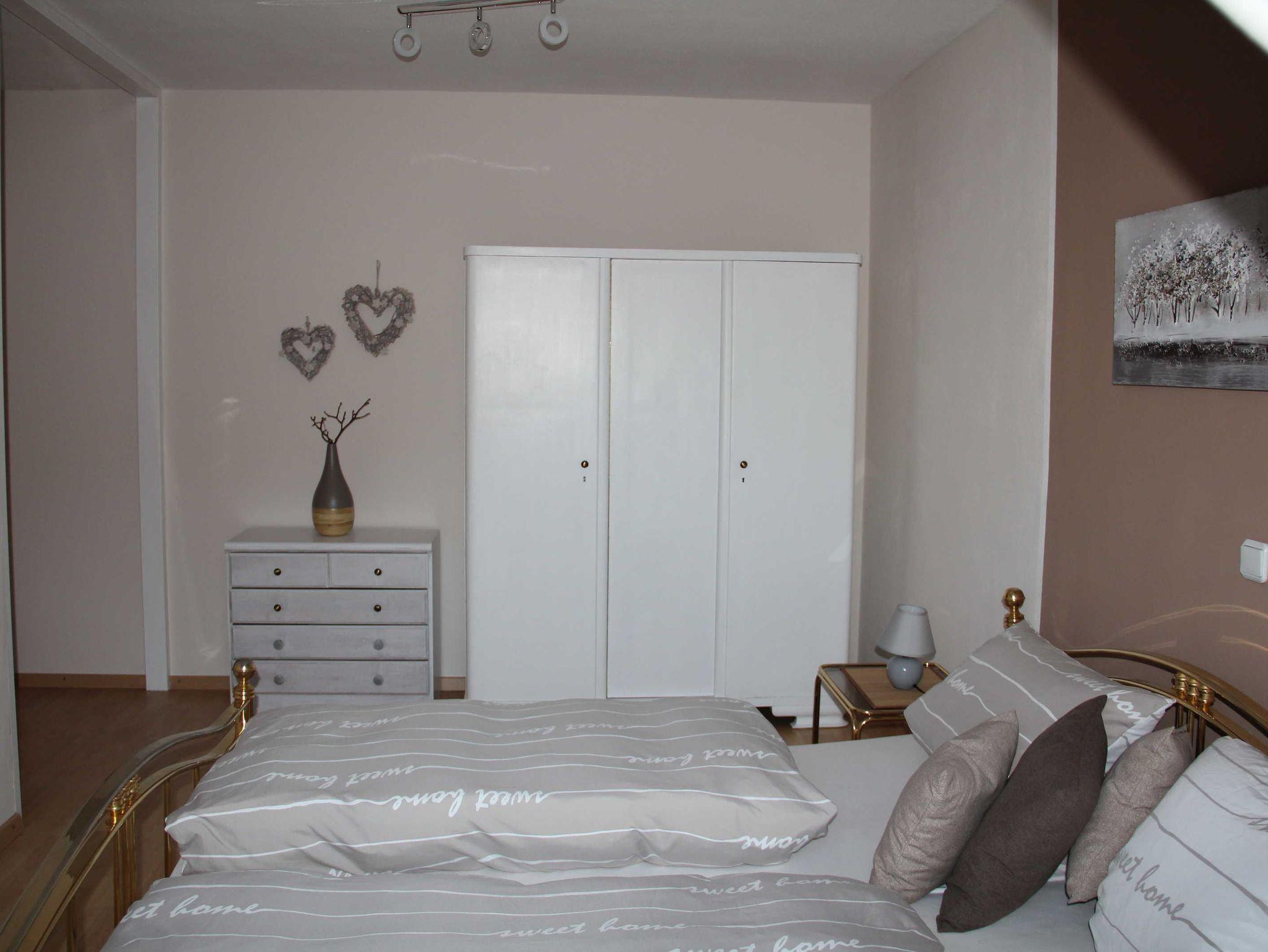 Schlafzimmer 1 (21 m²) ist ausgestattet mit einem Doppelbett (1,80x2m), Bettschränckchen, dreitürigem Schrank mit Spiegel und Chaiselongue.
