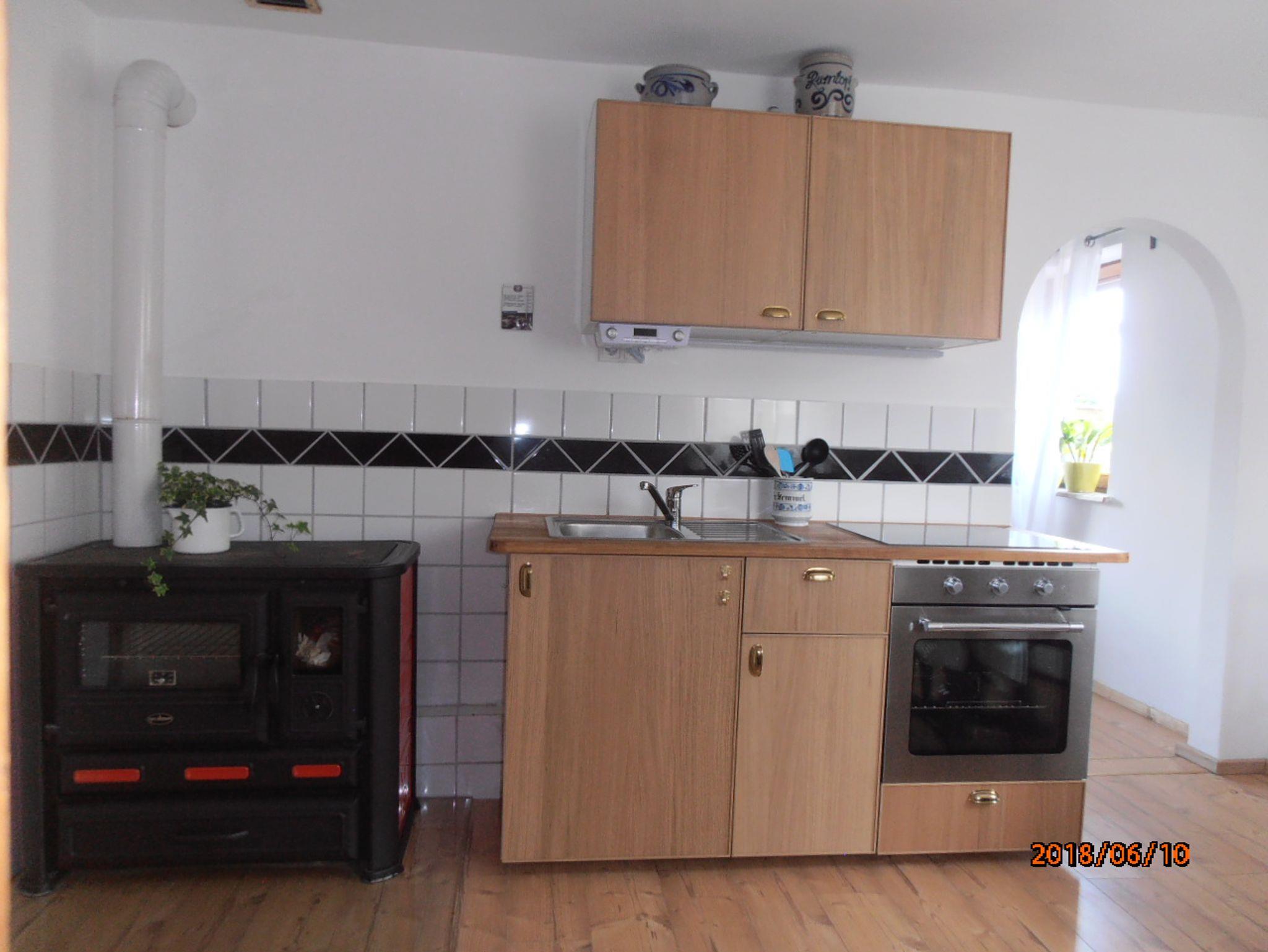 Die Wohnküche bietet Platz für 4 Personen und ist ausgestattet mit einem Backofen mit Ceranfeld, Filterkaffeemaschine, Wasserkocher und Toaster ,sowie Geschirr und Töpfen. Mit dem urigen und rustikalen Holzküchenofen ist es möglich zusätzlich zu heizen und eine romantische, wohlige Wärme zu genießen, oder wie die Großmutter damals darauf zu kochen. Natürlich steht Ihnen ein Kühlschrank mit Gefrierfach zur Verfügung.