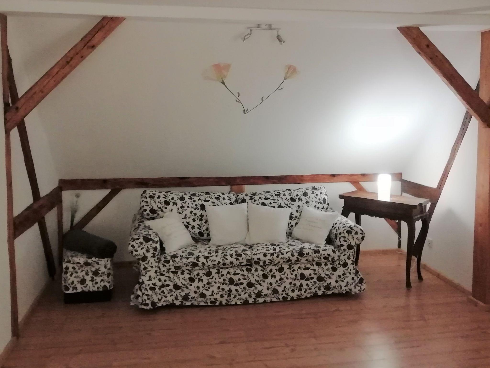 Das großzügige Schlafzimmer mit freigelegten Fachwerk ist mit einem Landhaus-Doppelbett ausgestattet. Ebenso steht hier eine gemütliche Couch,auf der zusätzlich bis zu 2 Personen schlafen können.