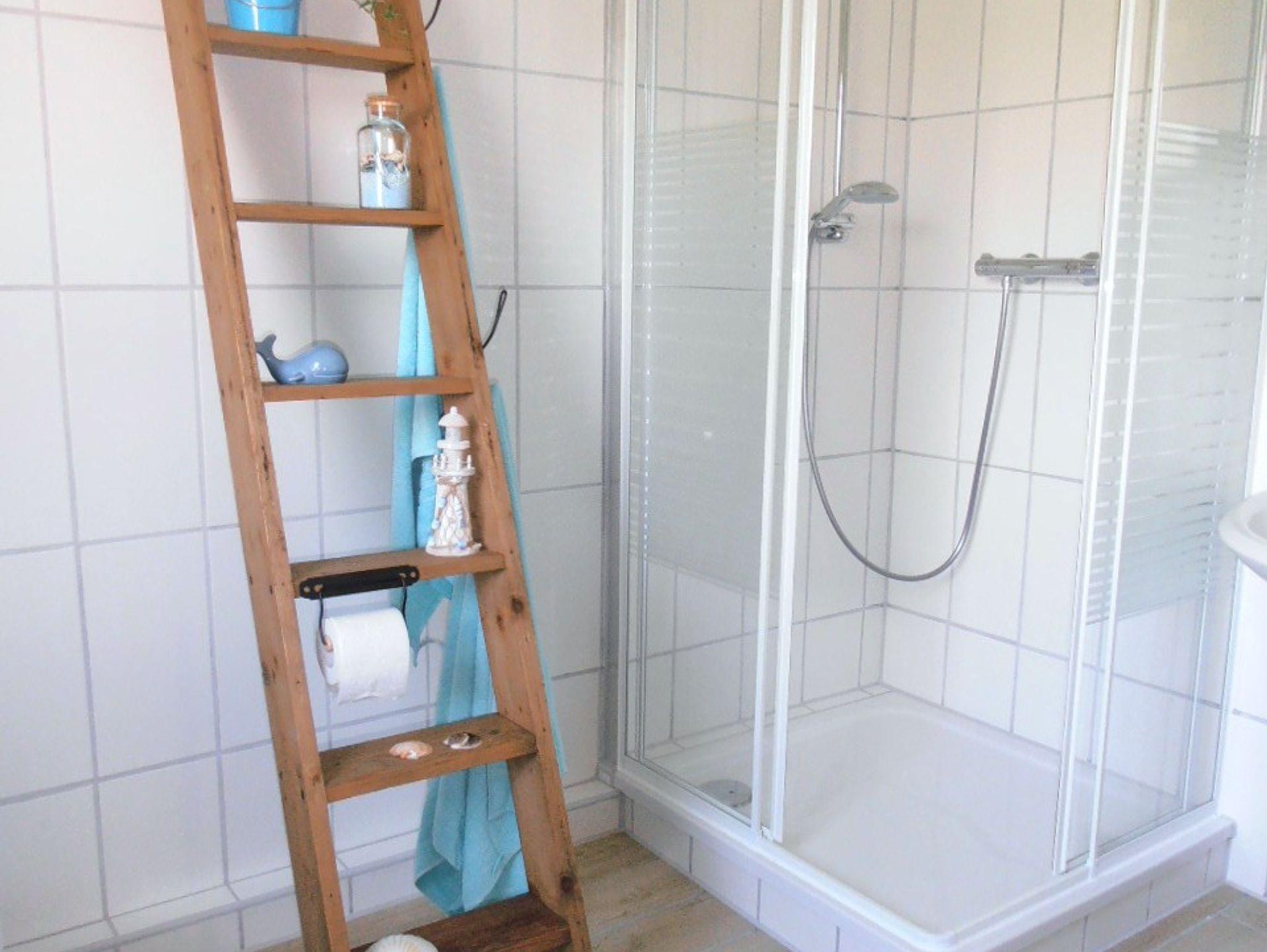 Im geräumigen Bad mit WC befindet sich eine Dusche mit niedrigem Einstieg und eine Waschmaschine. Pro Person finden Sie ein Duschtuch und ein Handtuch zu Ihrer Verfügung.