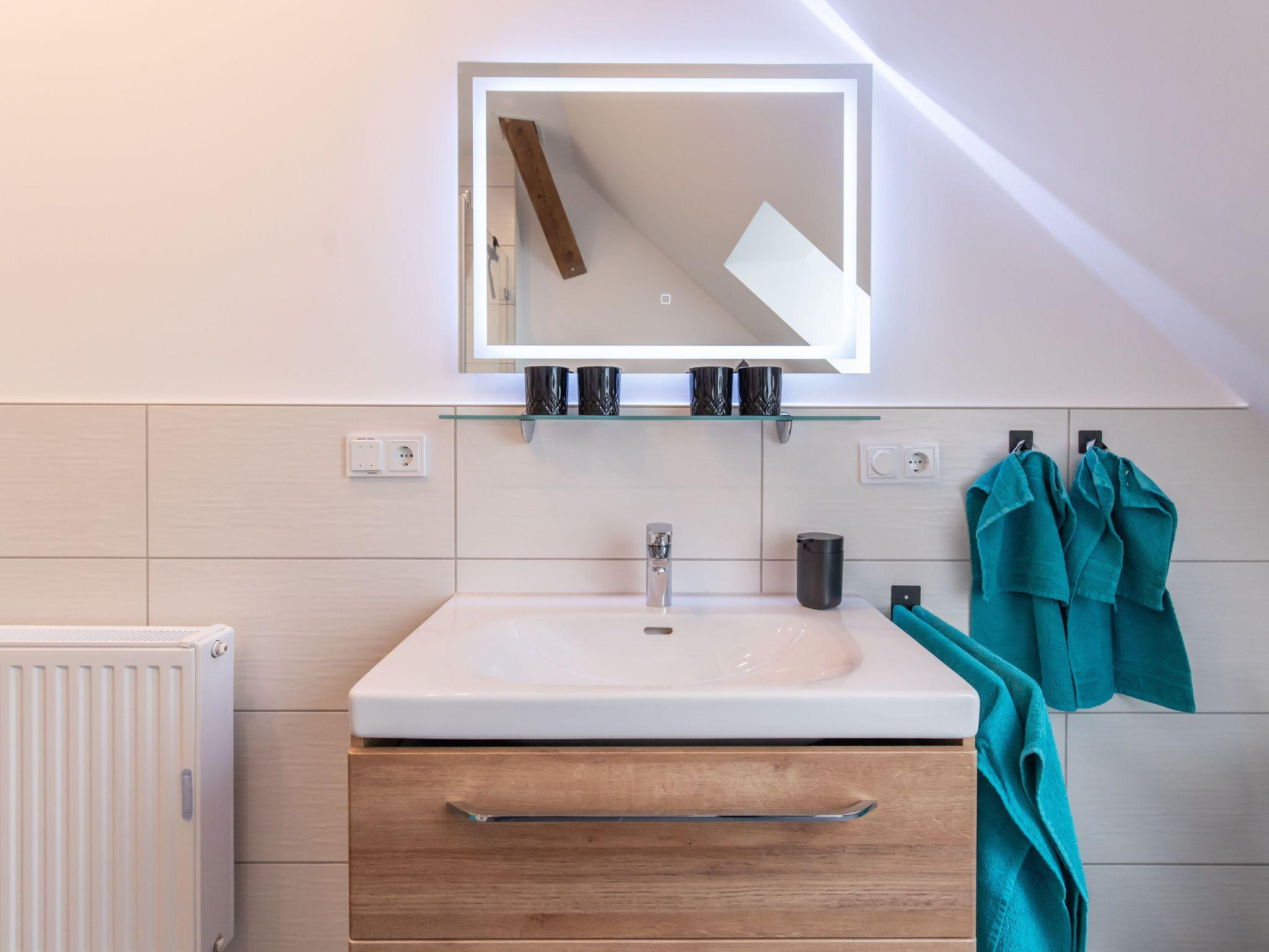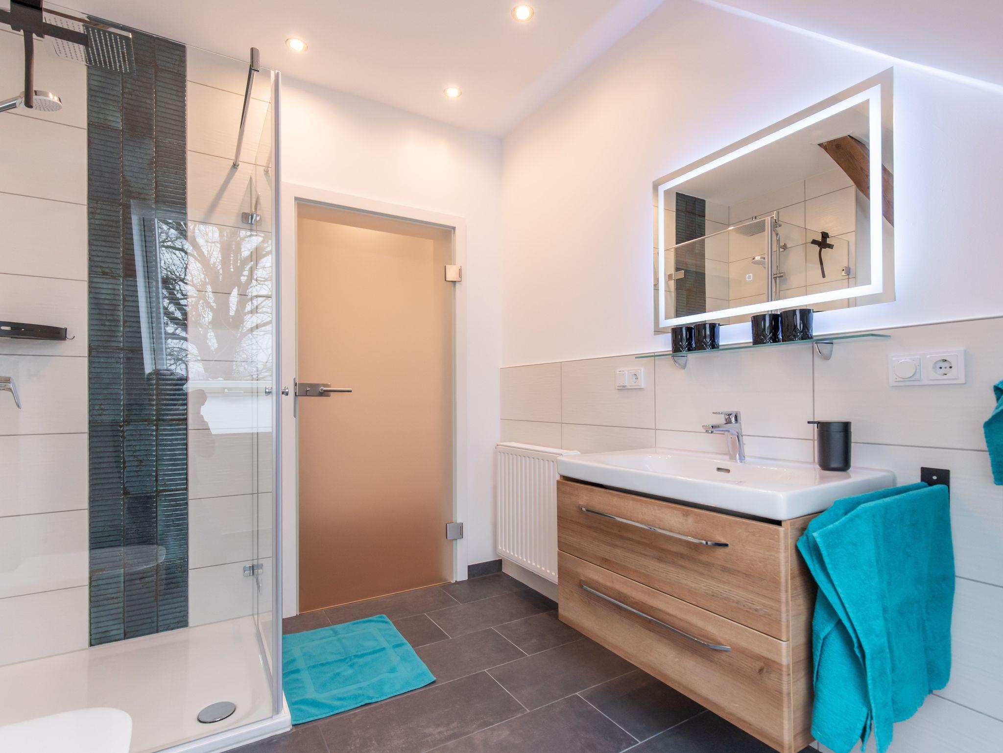 Tageslichtbad mit Regendusche und Handtüchern.