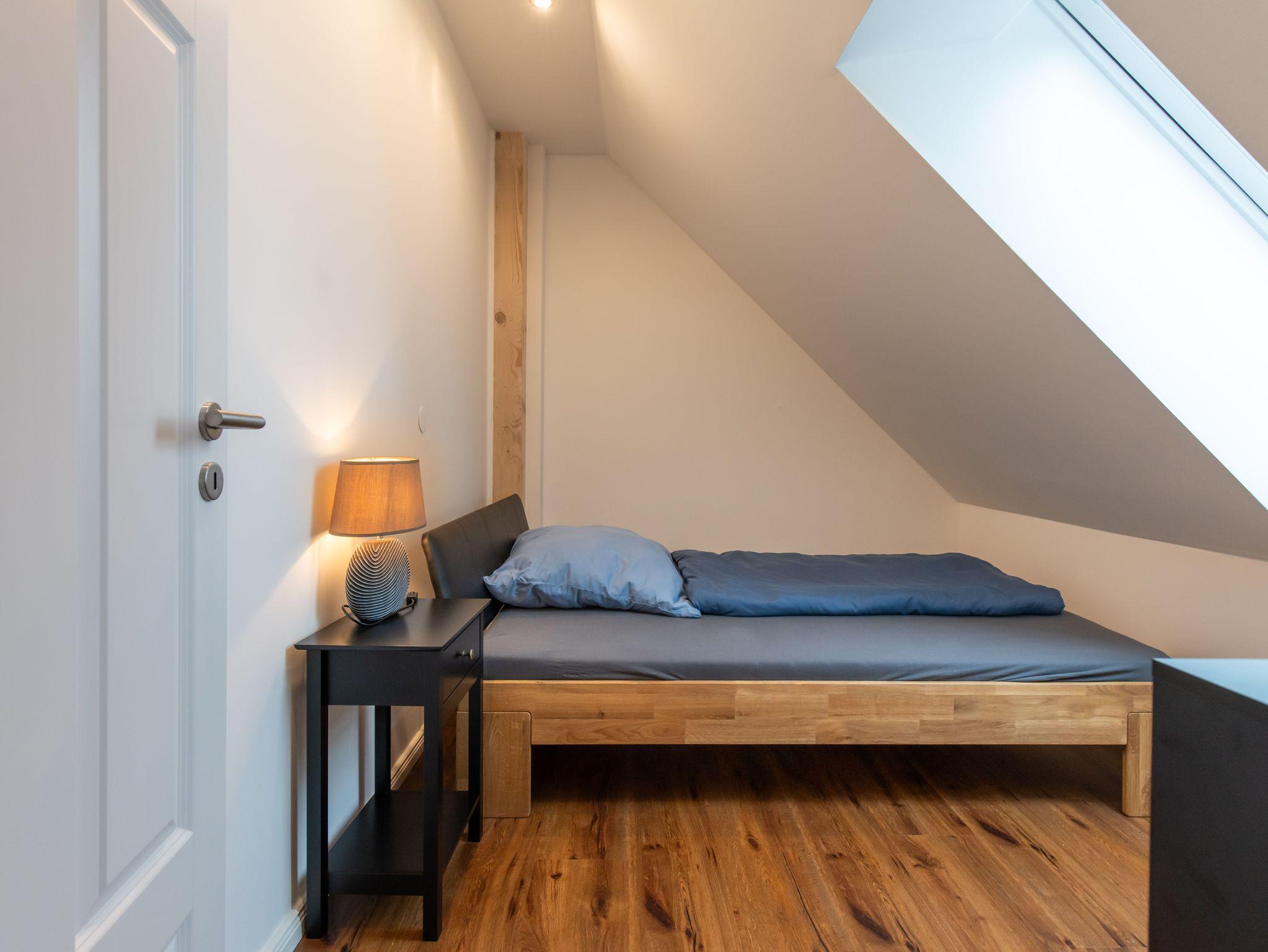 Aus vielen neuen Wänden im Inneren entstanden schließlich 7 helle Appartements. Helle Fliesen und ein farblicher Akzent, ein Boden in Holzoptik, je ein Doppelbett und