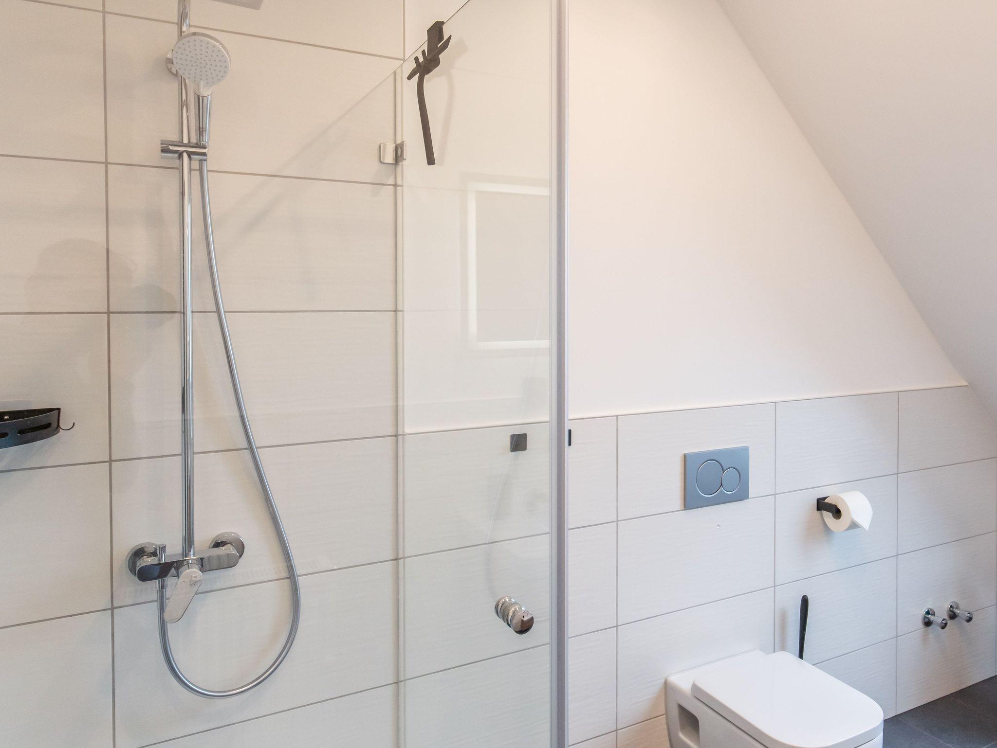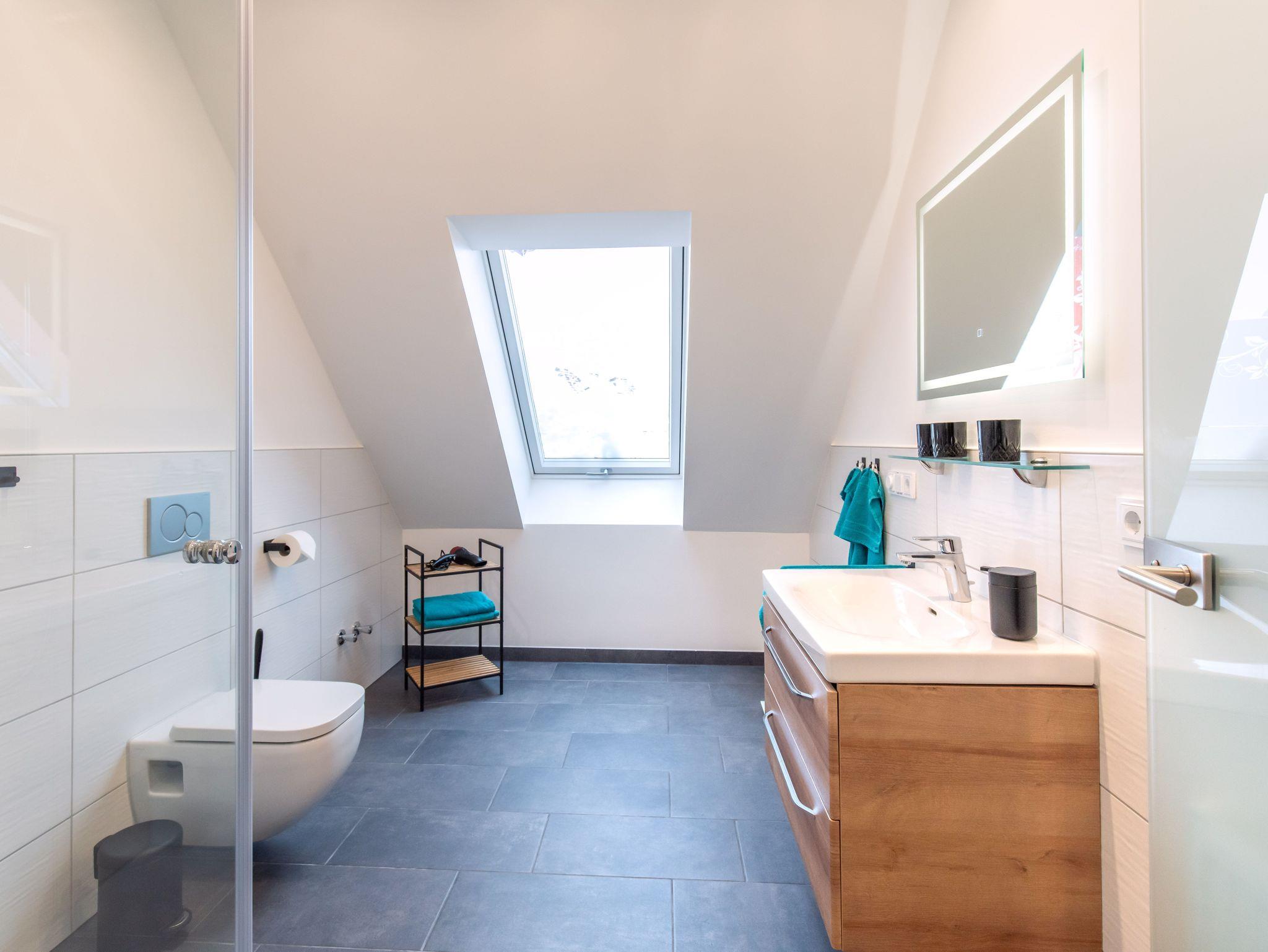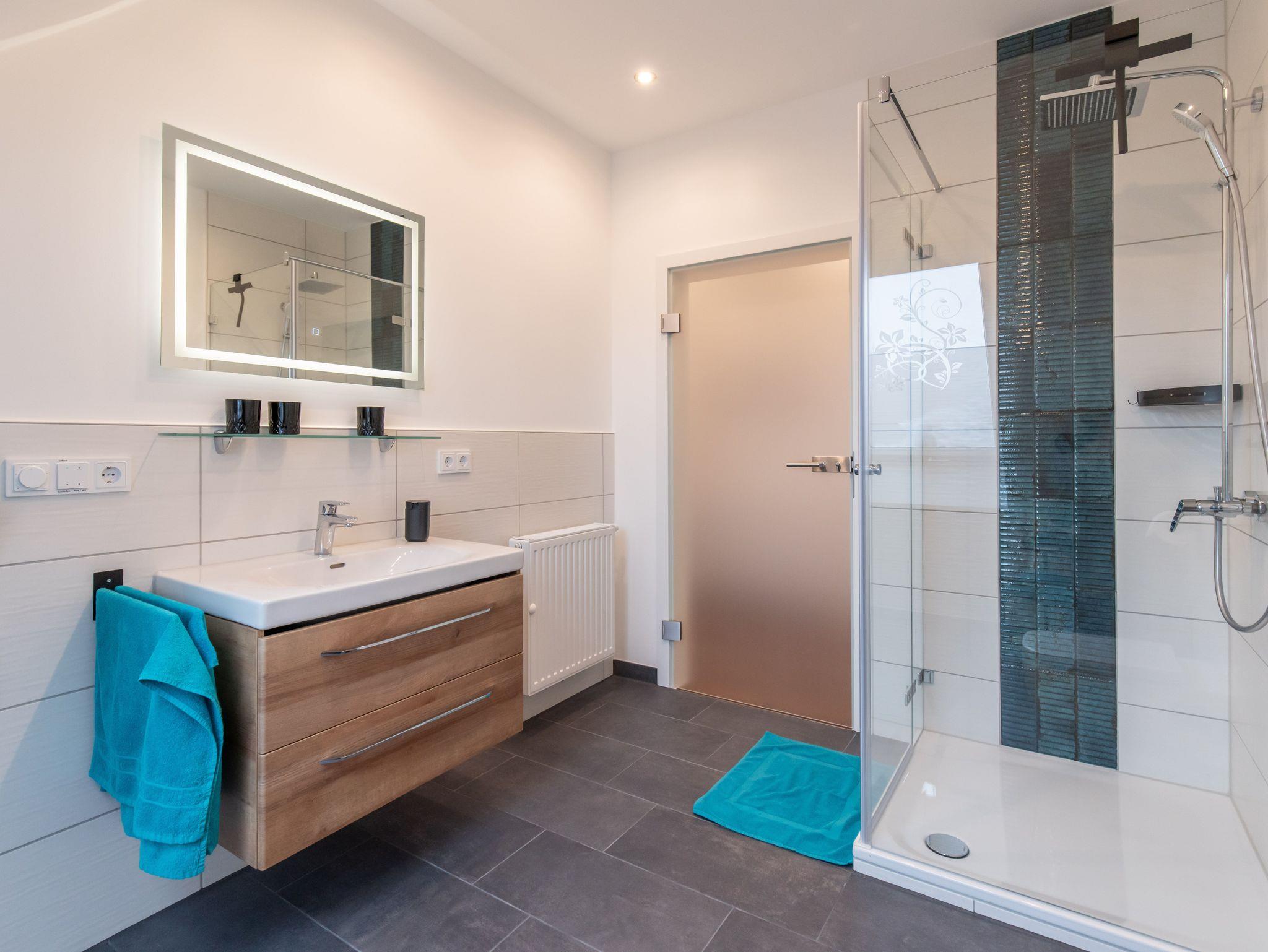 Tageslichtbad mit Regendusche und Handtüchern.