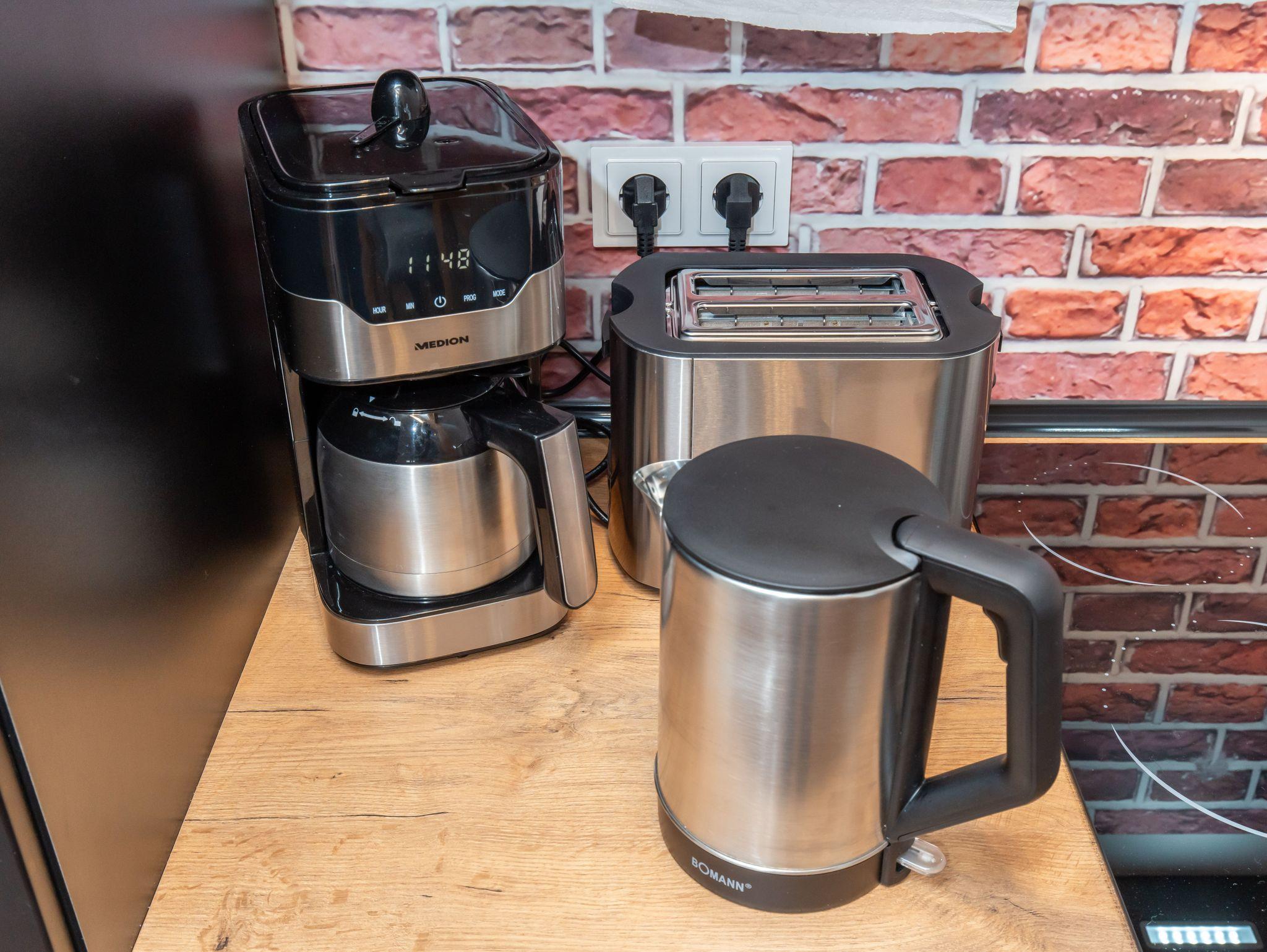 Teekanne mit Stövchen, Toaster, Wasserkocher und Kochutensilien.