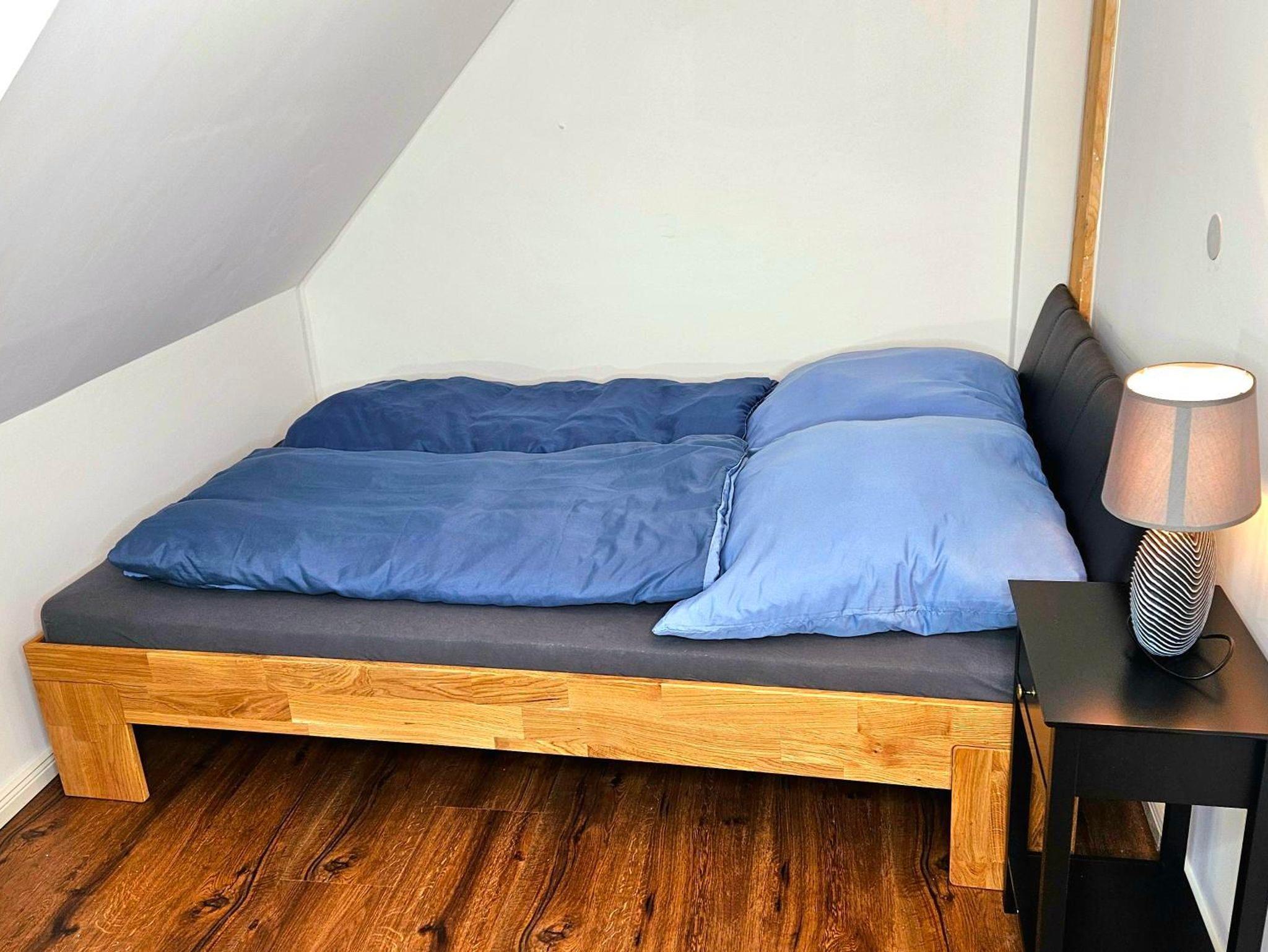 Hauptschlafzimmer mit Queensizebett 1,60m x 2,00m mit Steckdosen und Licht am Bett.