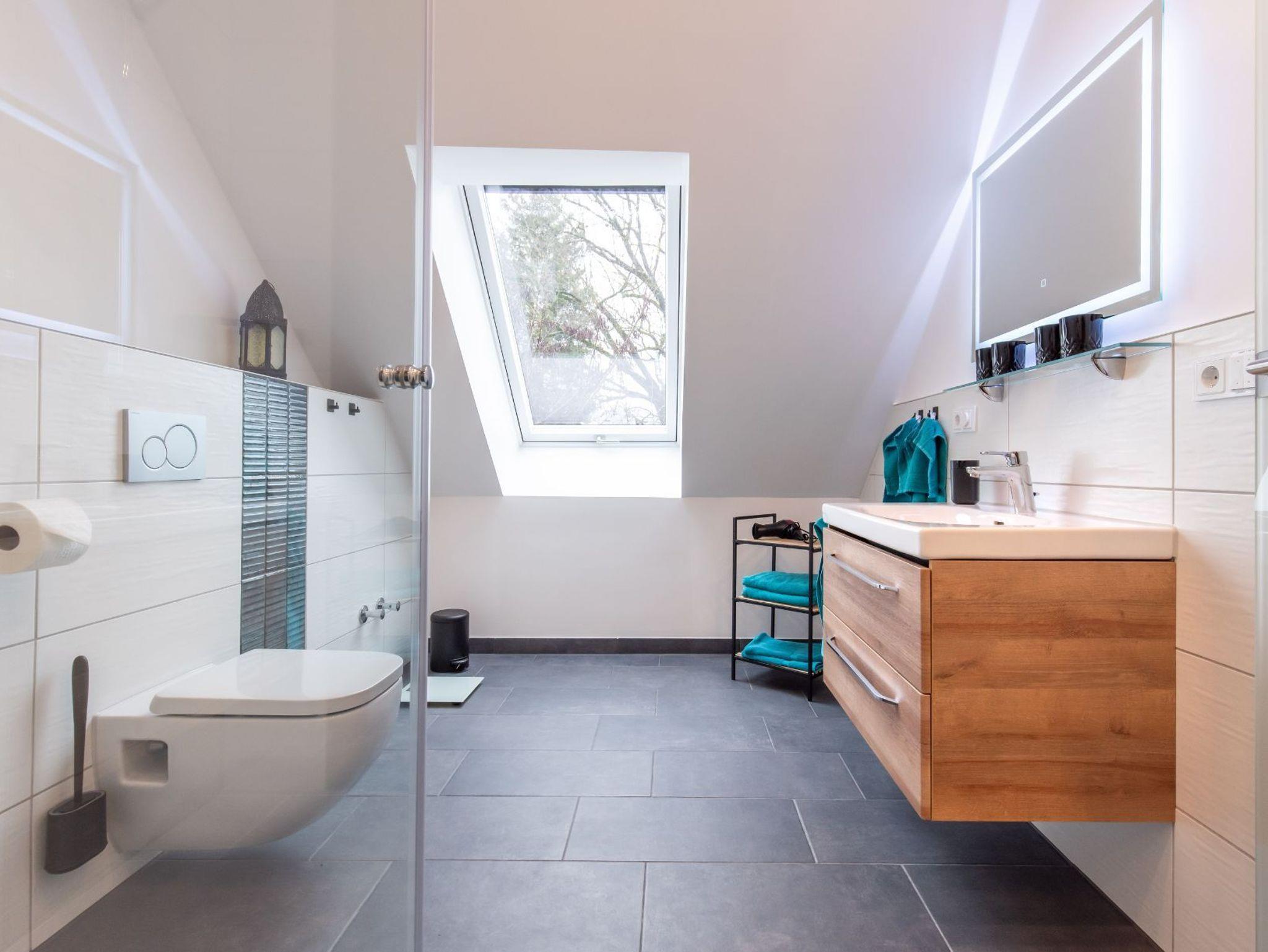 Aus vielen neuen Wänden im Inneren entstanden schließlich 7 helle Appartements. Helle Fliesen und ein farblicher Akzent, ein Boden in Holzoptik, je ein Doppelbett und