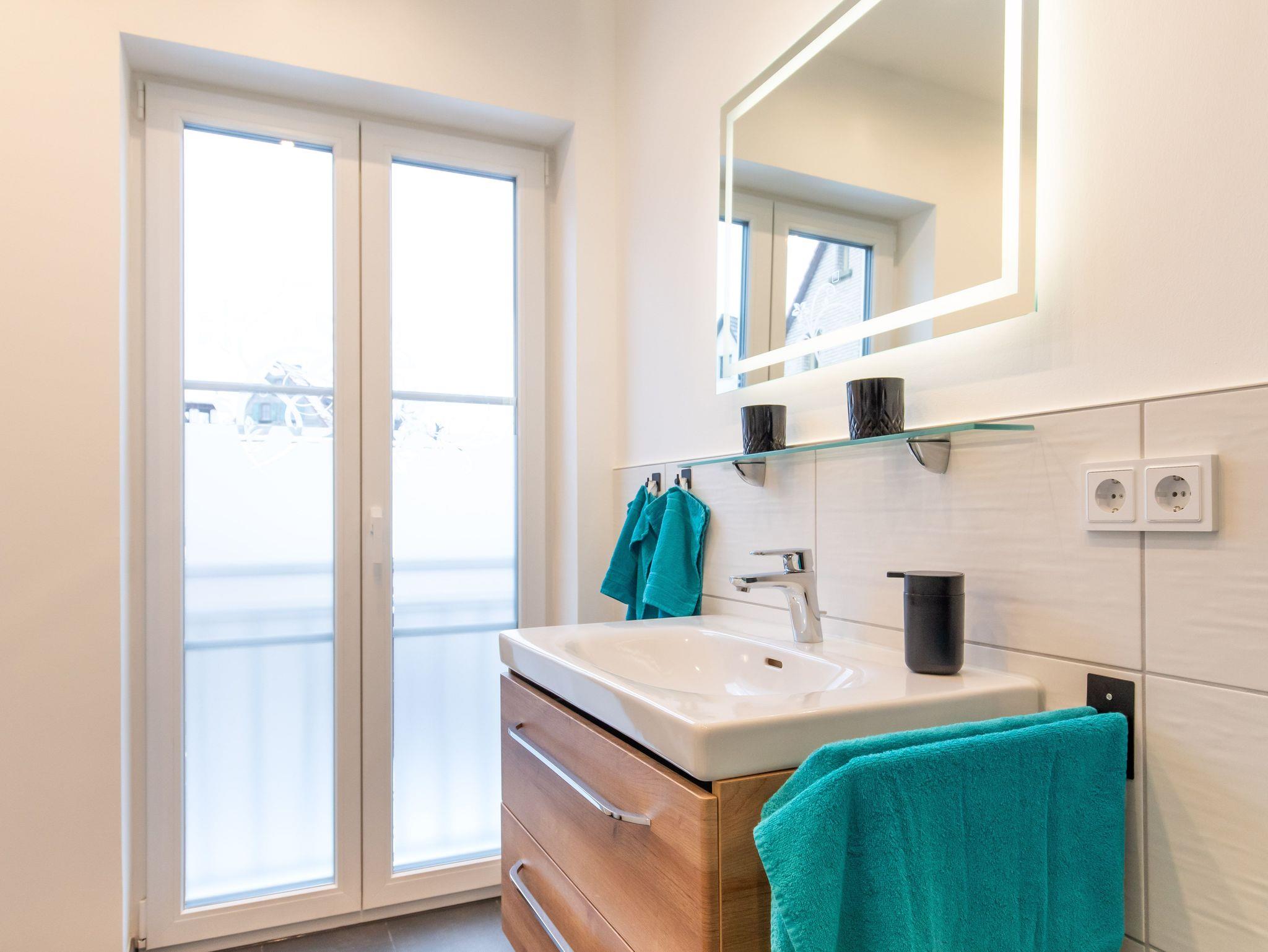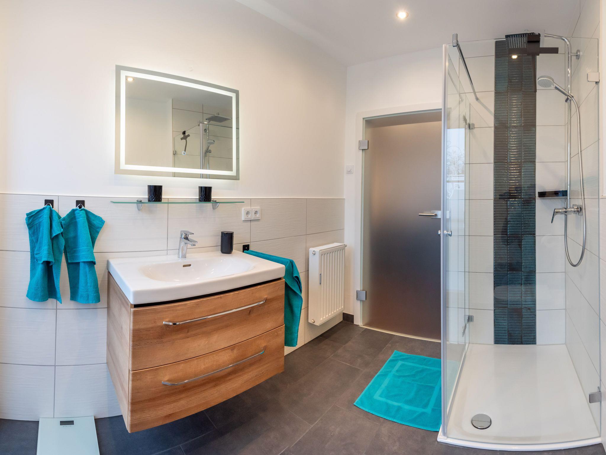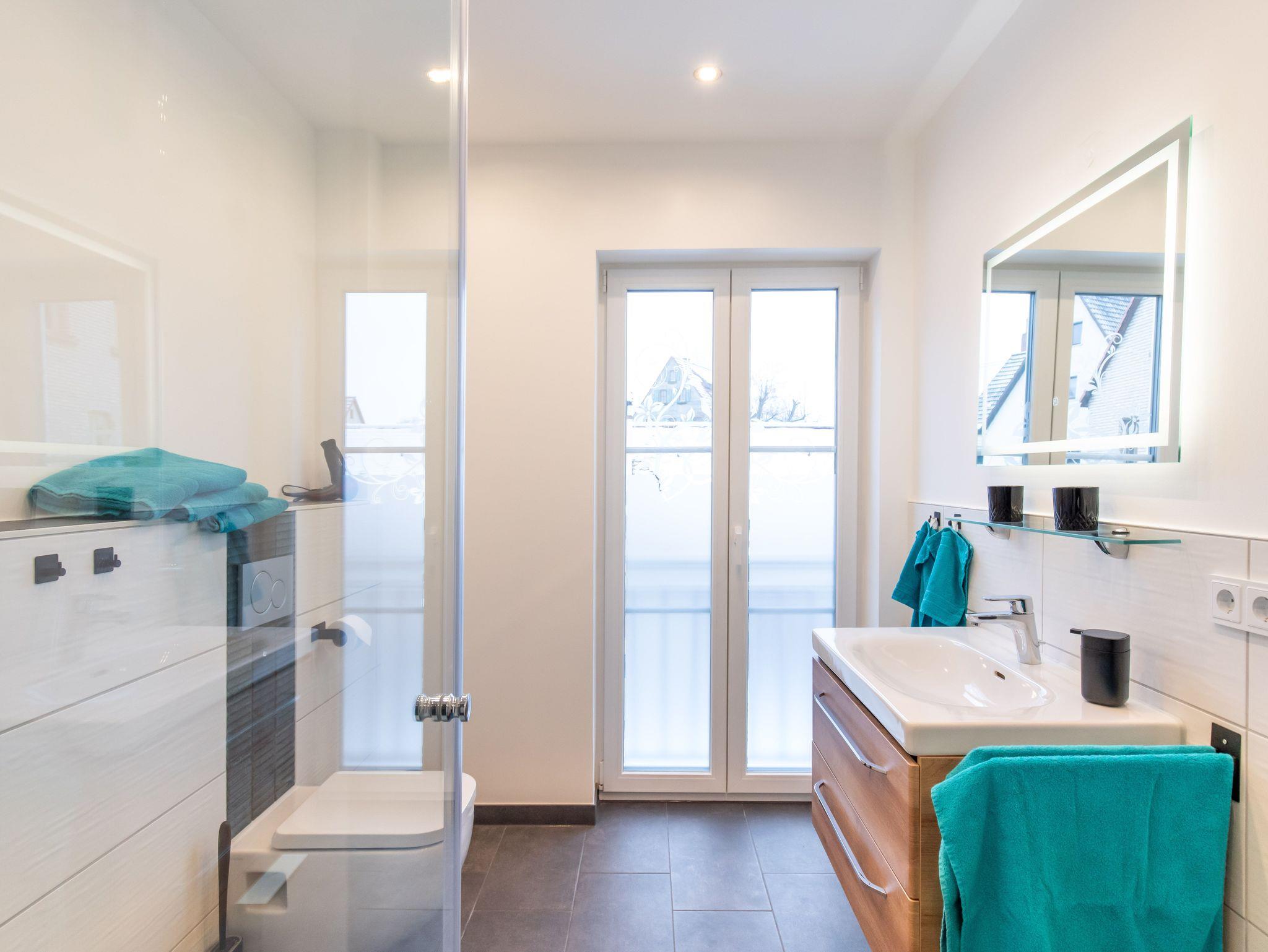 Tageslichtbad mit Regendusche und Handtüchern.