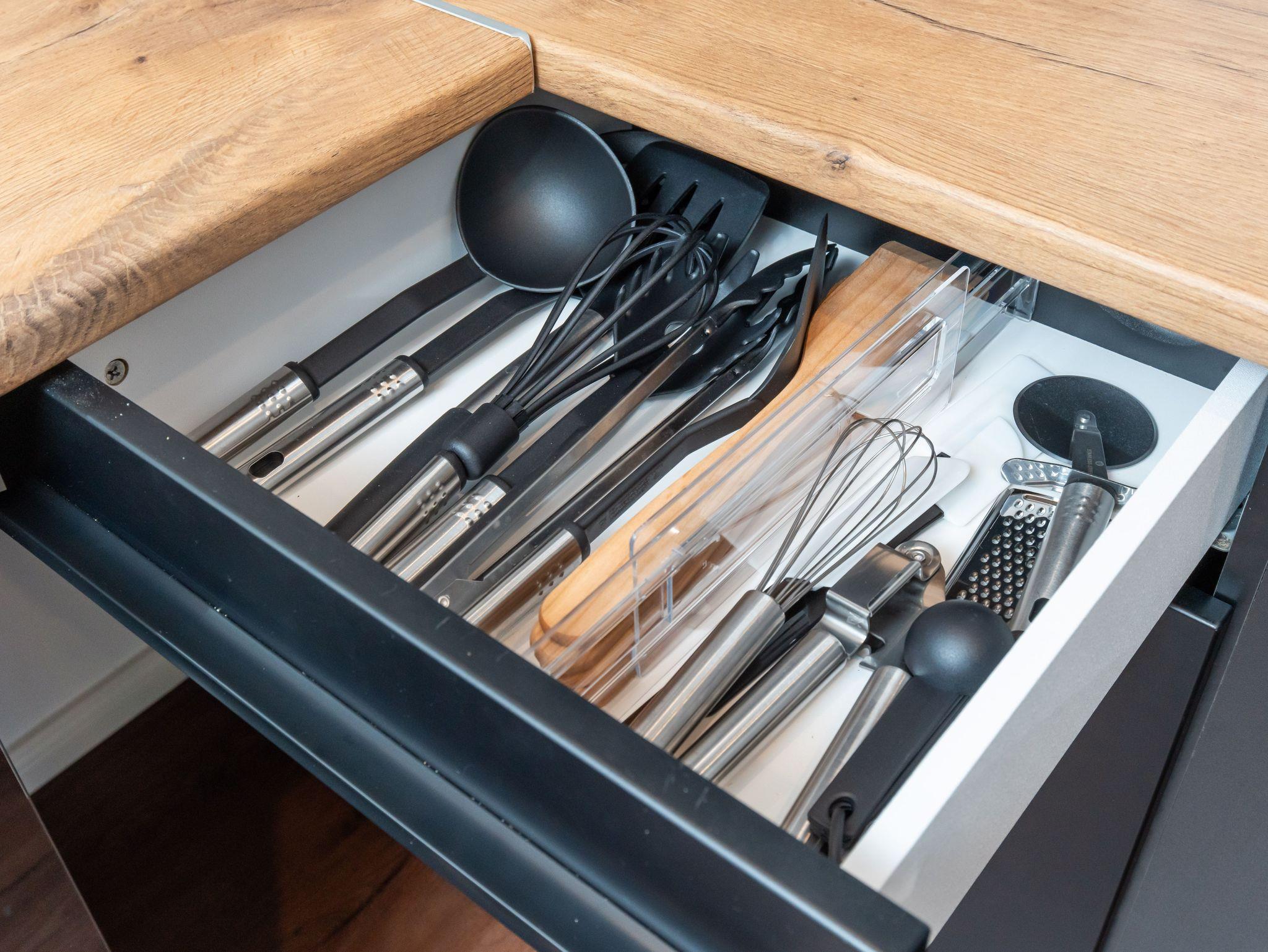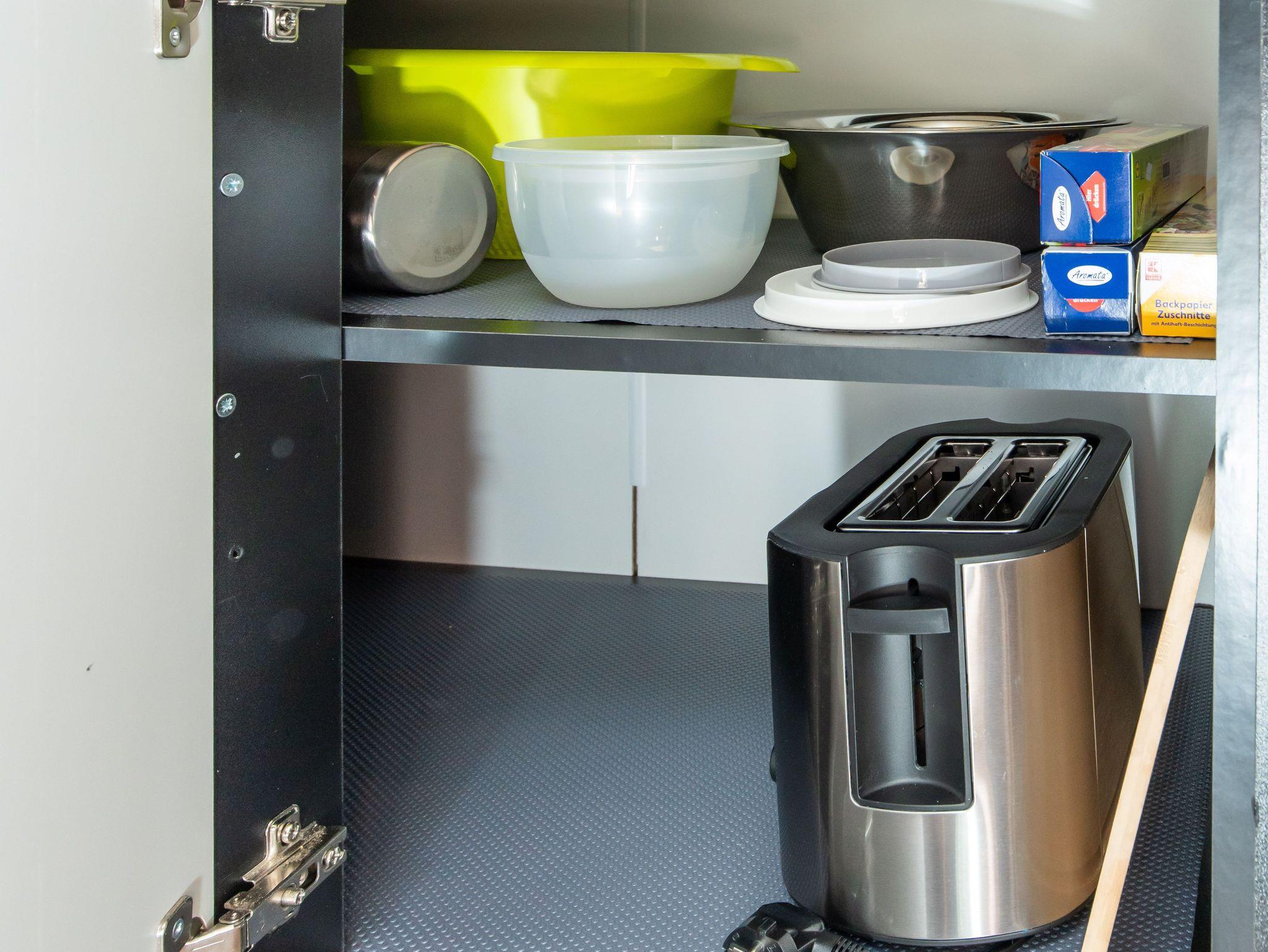 Teekanne mit Stövchen, Toaster, Wasserkocher und Kochutensilien.