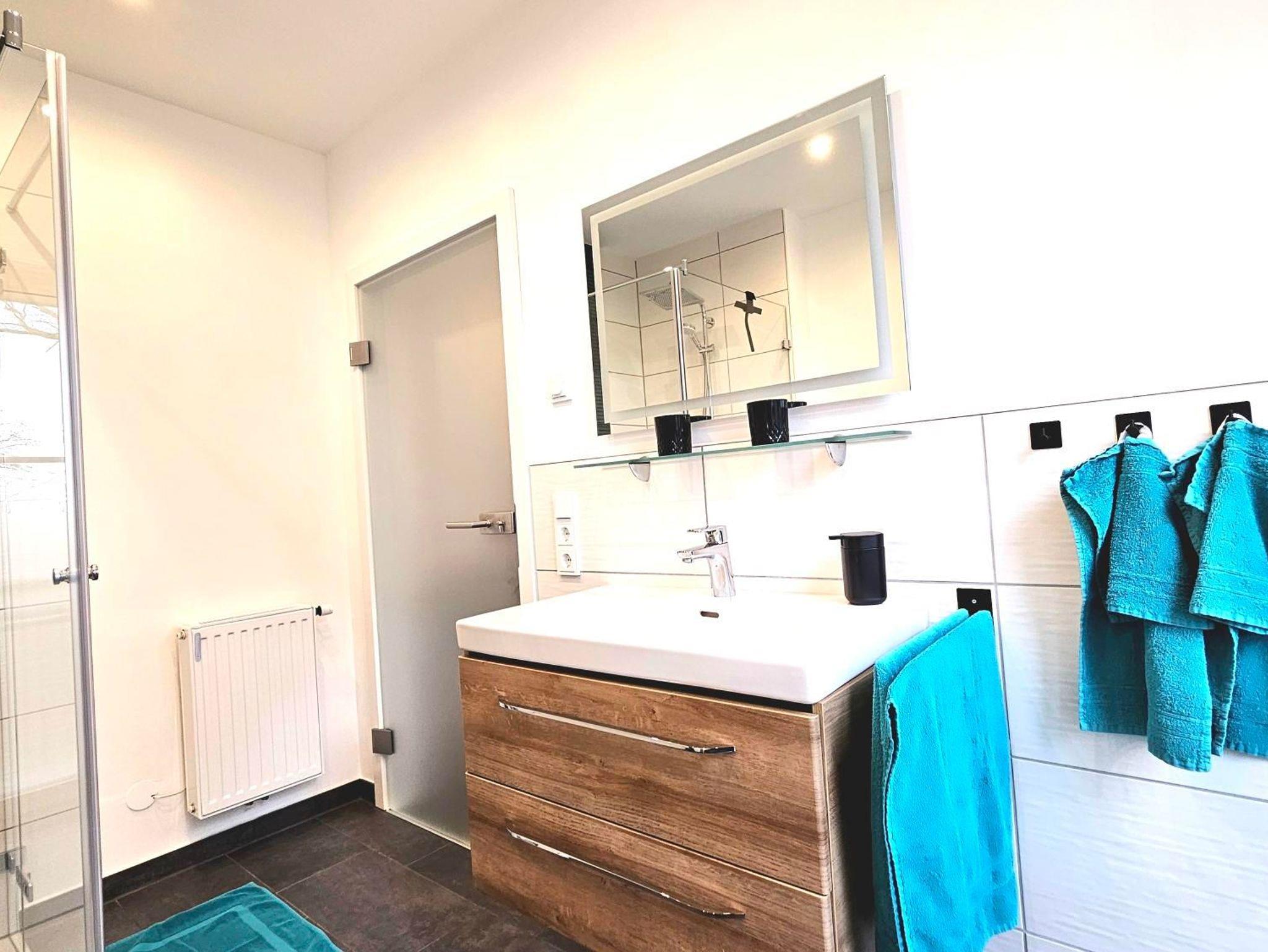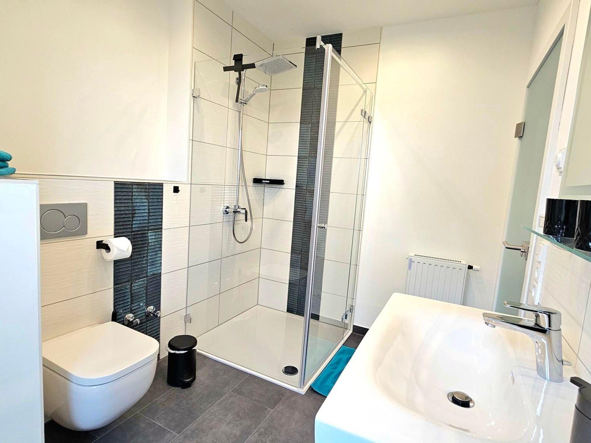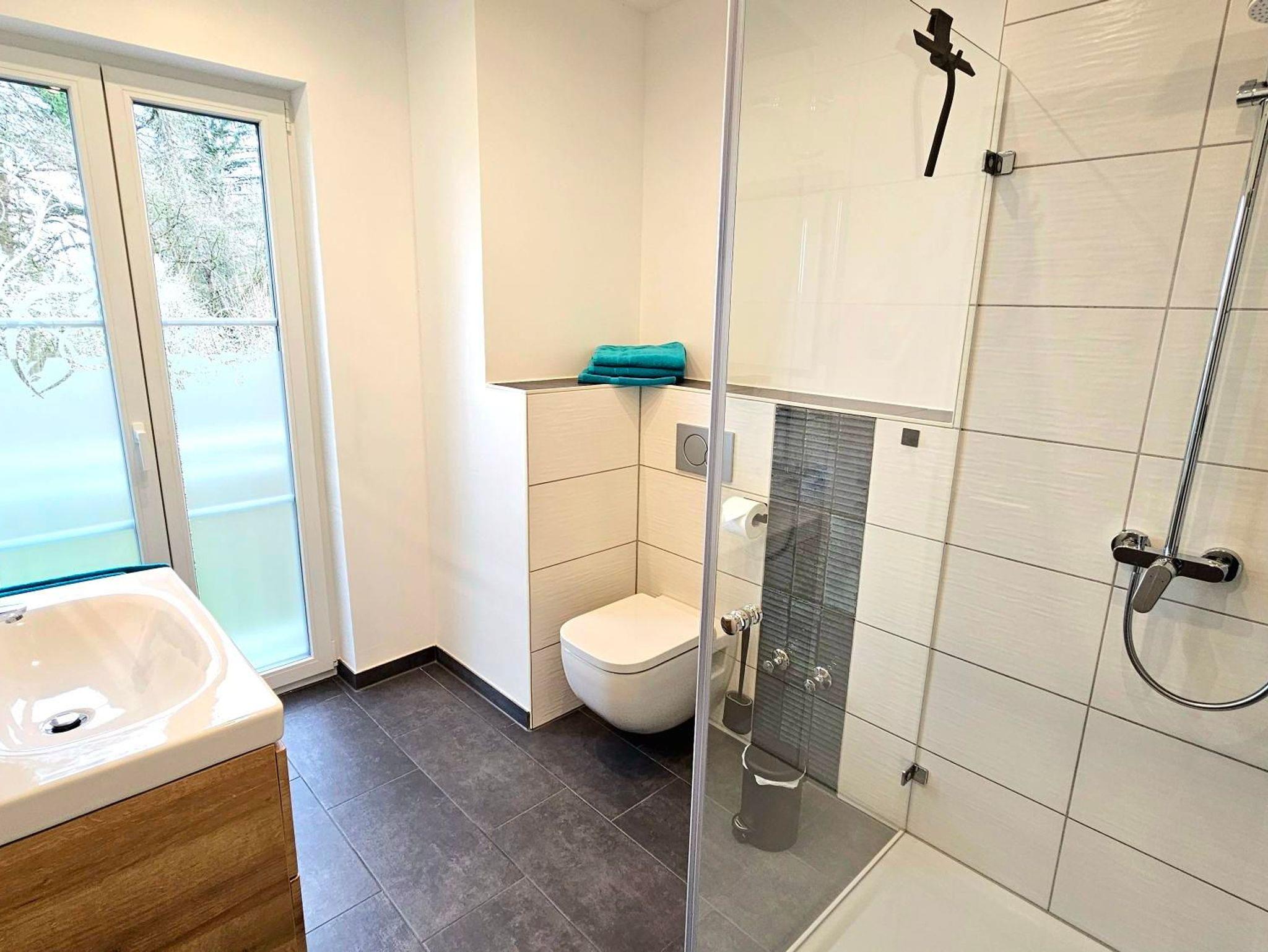 Tageslichtbad mit Regendusche und Handtüchern.