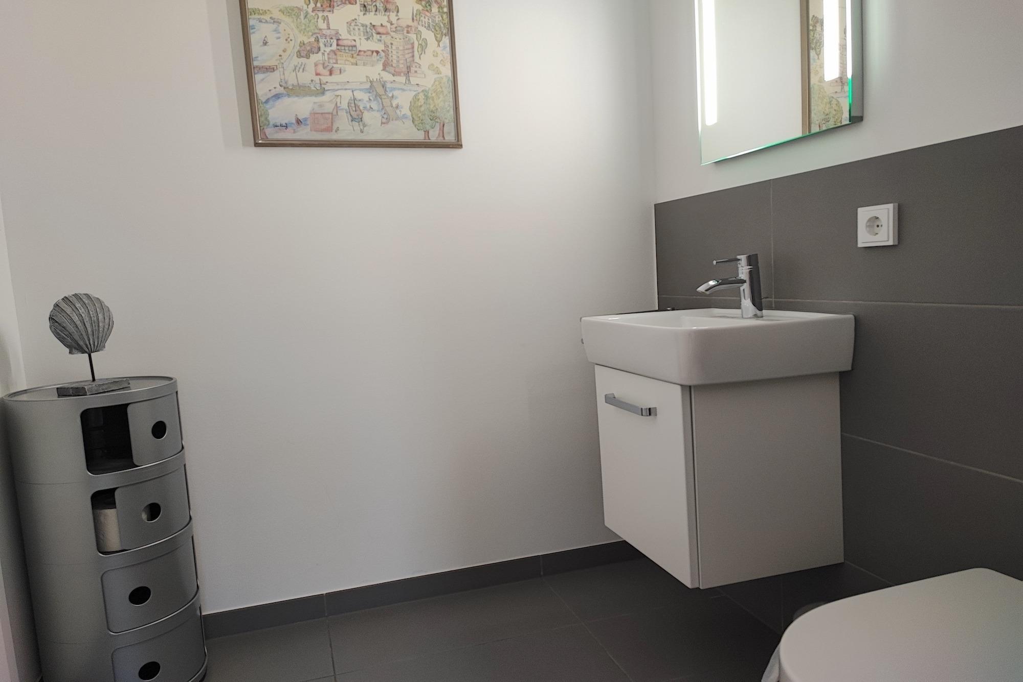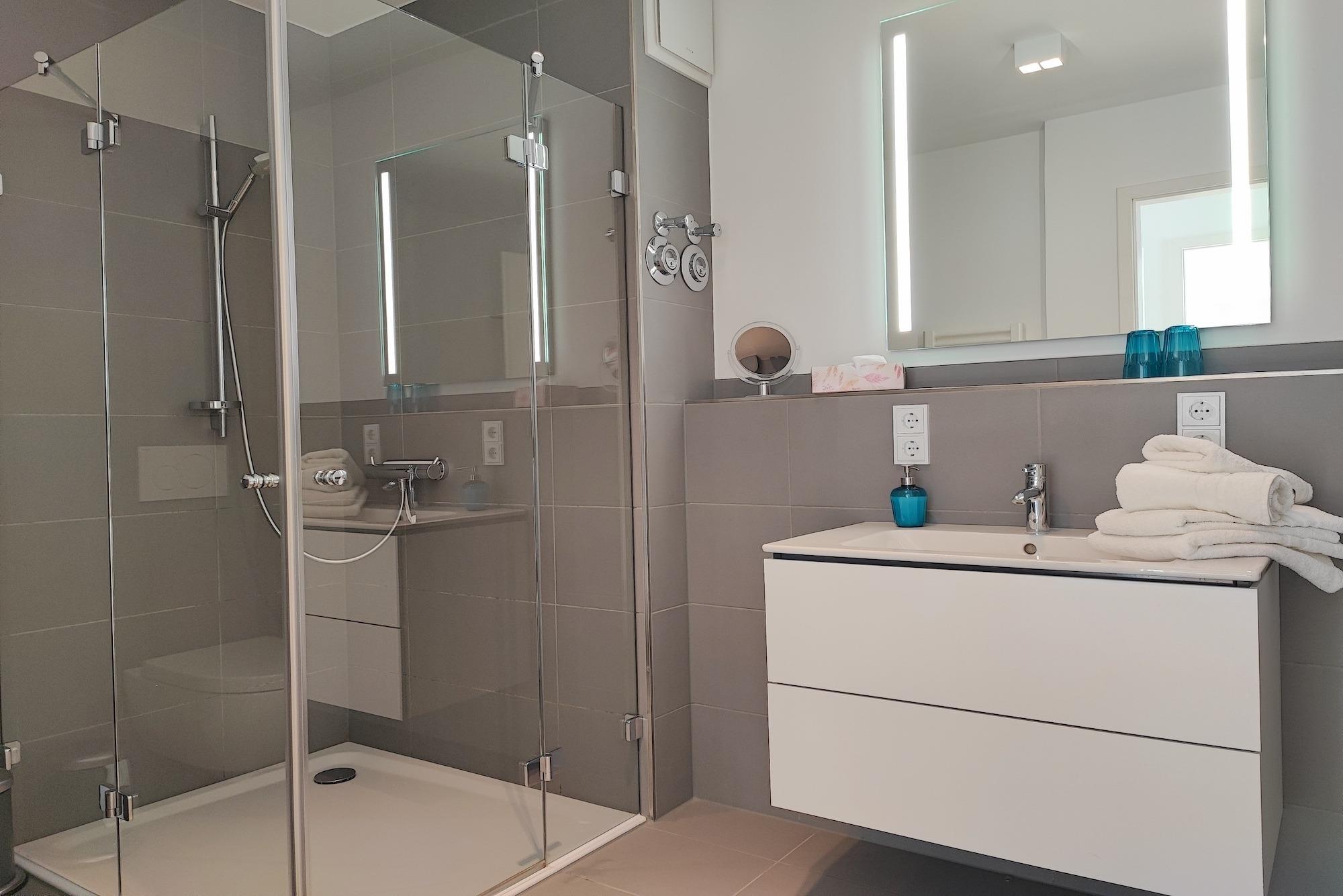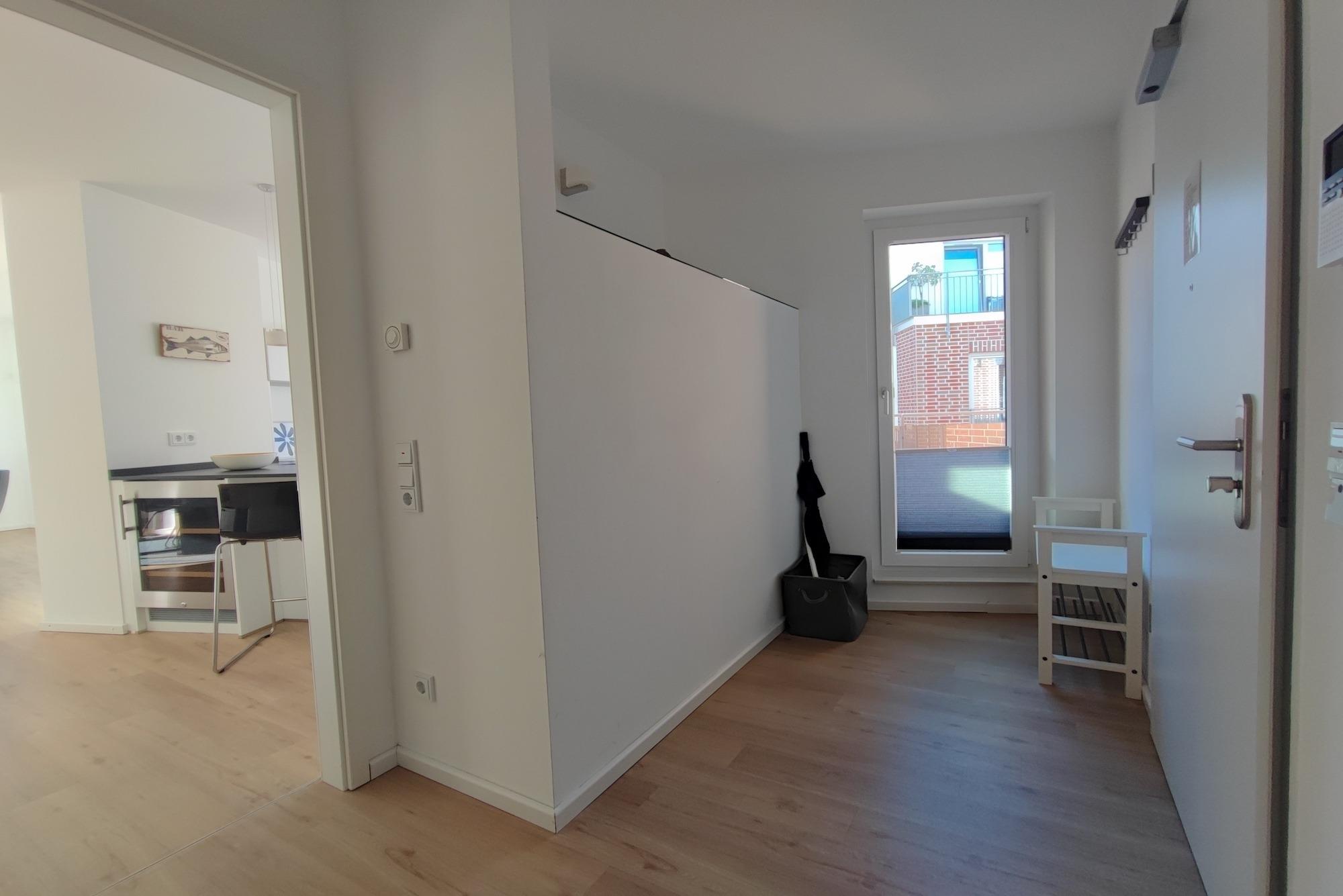Der offene, mit bodentiefen Fenstern umgebene Wohn- und Essbereich, mit voll ausgestatteter Küche, la¨dt zum gemeinsamen Entspannen und Kochen ein! Die Ferienwohnung verfügt u¨ber einen Balkon mit Zugang vom Schlafzimmer und Wohnzimmer. Ein Schlafzimmer wurde mit einem modernen Doppelbett (180x200), einem Kleiderschrank und einem TV-Gerät ausgestattet. Im zweiten Schlafzimmer stehen sich zwei Einzelbetten (90x200) und zwei Kommoden. Mit Blick aus dem Fenster schauen Sie auf das Hafenwasserbecken Promenadeseite. Die Dusche im Badezimmer ist ebenerdig und eine Badewanne lädt zur Entspannung ein. Die komplette Wohnung ist mit Vinylboden und Fußbodenheizung ausgestattet. Zusätzliches: Gäste-WC. Die im 1. Stock des Appartementhauses gelegene Ferienwohnung kann ''barrierefrei'' über einen Aufzug, mit direktem Zugang aus der Tiefgarage erreicht werden. Die Symbole vom Wohngrundriss können in der Darstellung von der tatsächlichen Innen- und Außengestaltung der Wohnung abweichen!