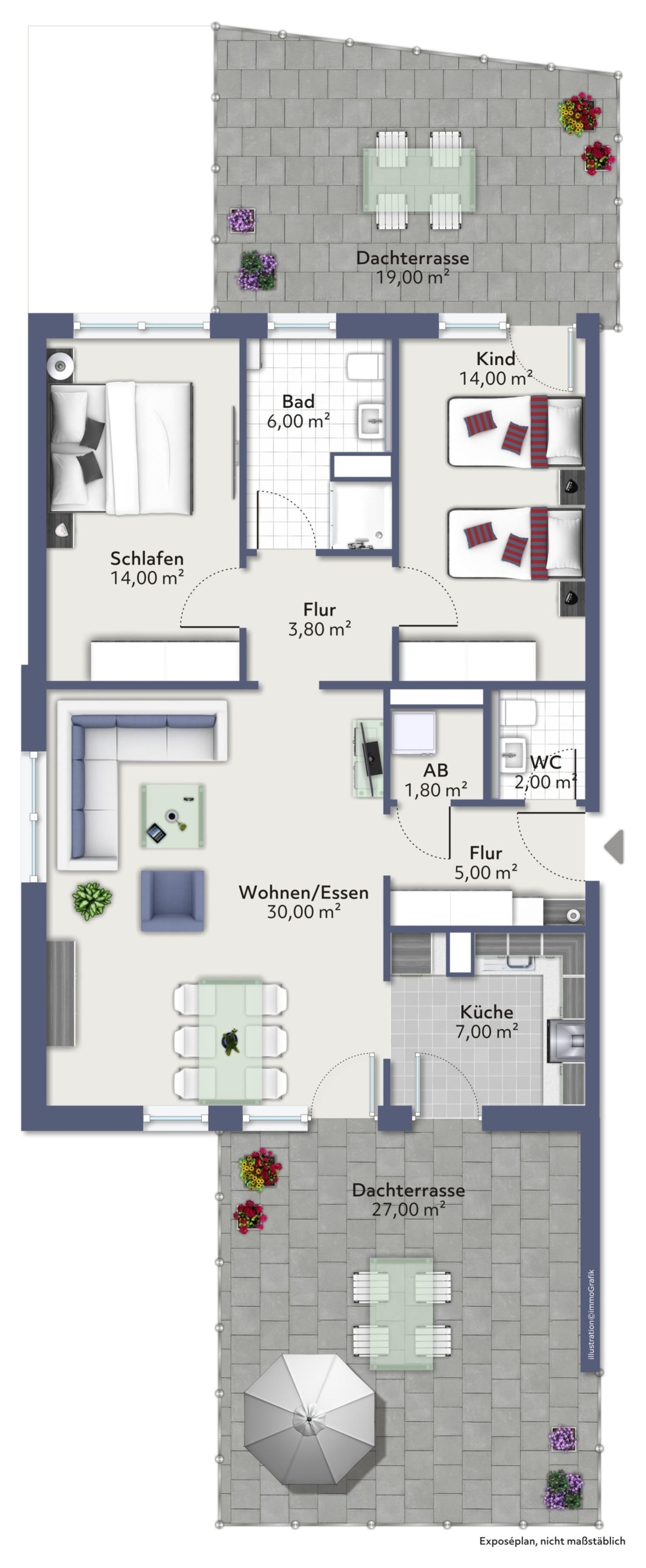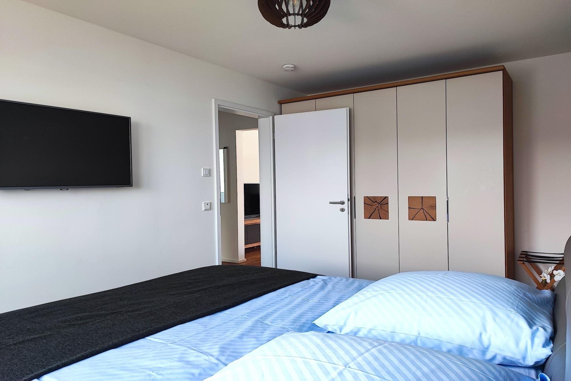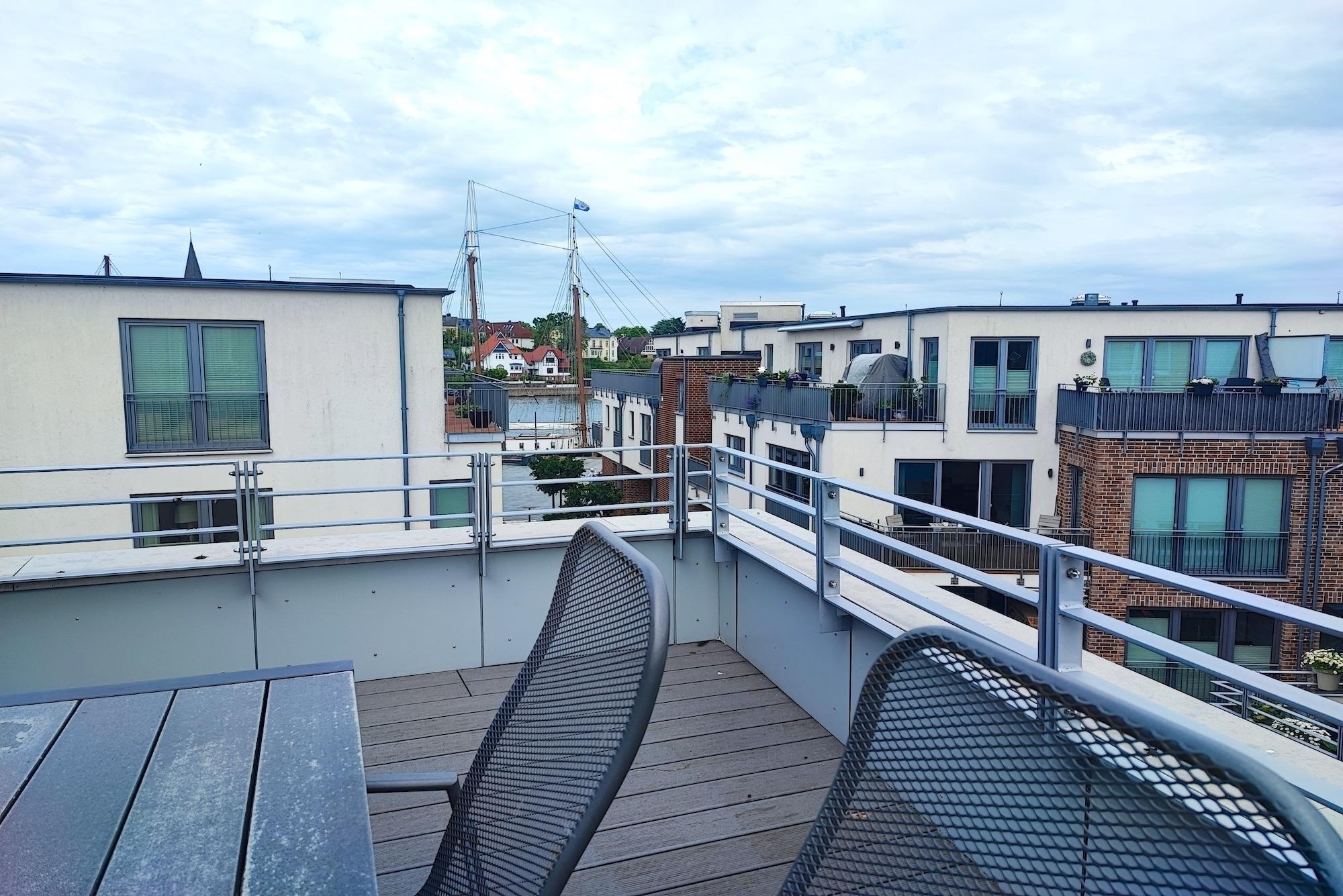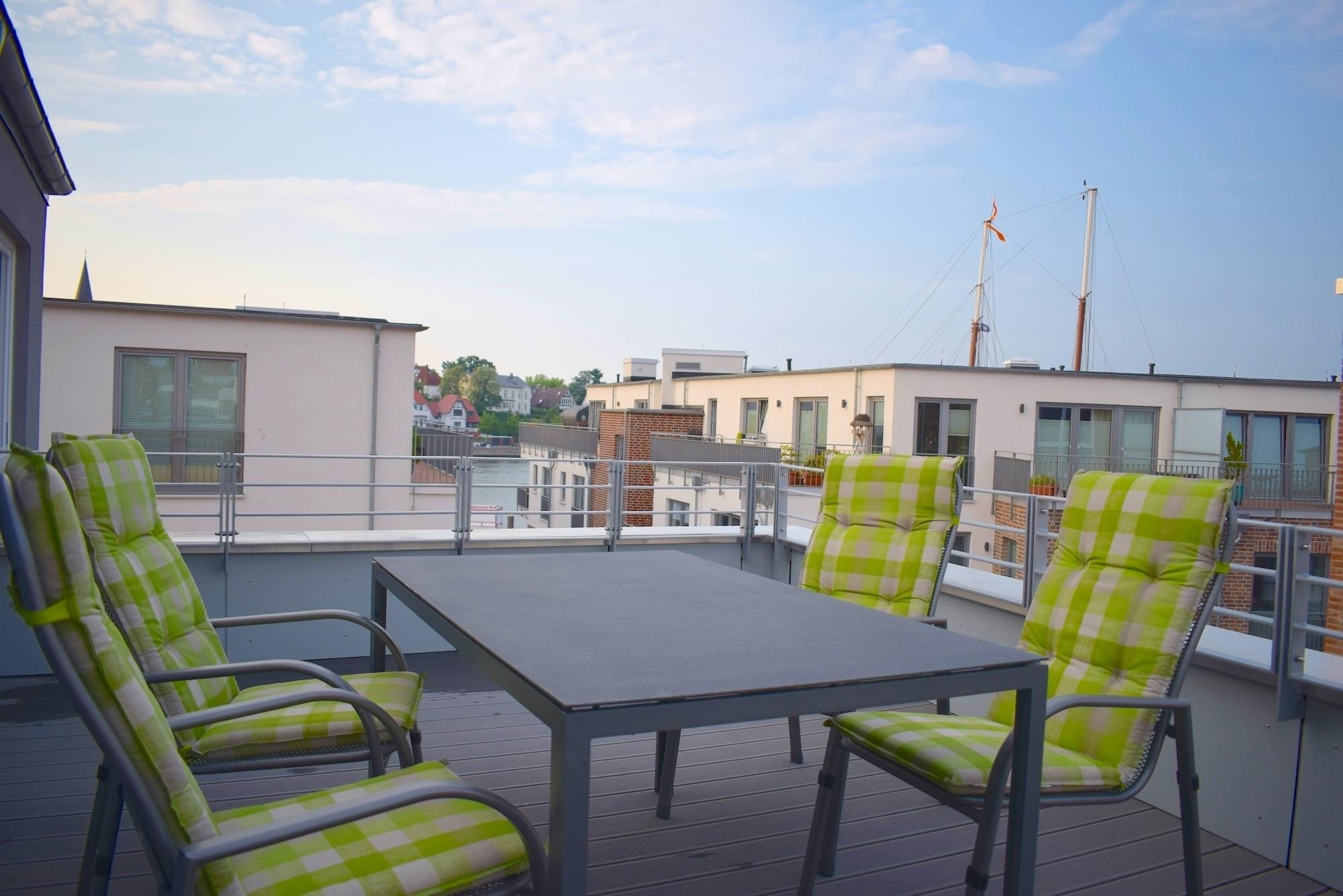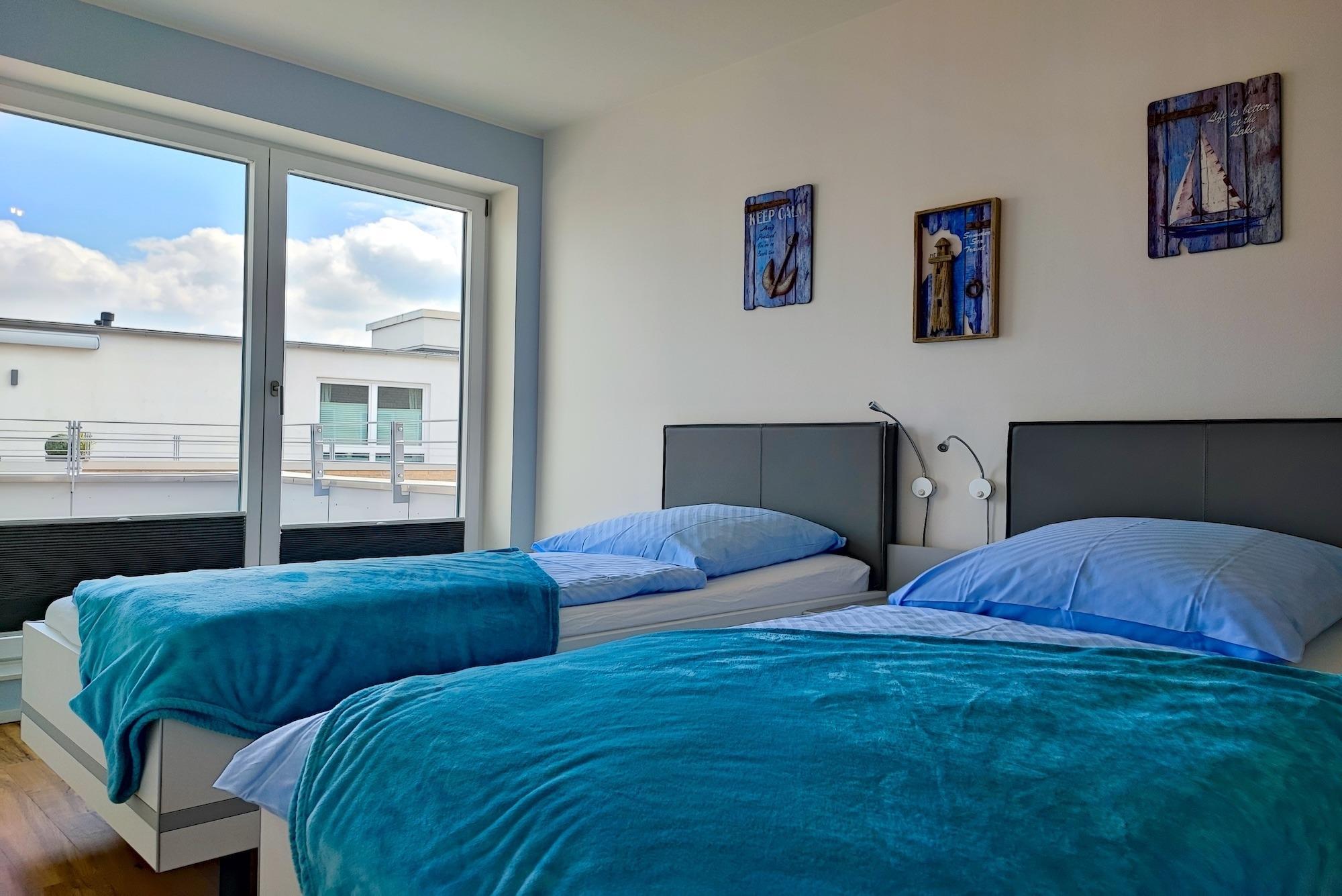Die Wohnung beeindruckt durch zwei Dachterrassen mit Blick auf das Hafenbecken. Der lichtdurchflutete, offene Wohn- und Essbereich, mit separater voll ausgestatteter Küche, la¨dt zum gemeinsamen Entspannen und Kochen ein! Ein Schlafzimmer wurde mit einem modernem Doppelbette (180x200), das andere mit 2 Einzelbetten (90x200) und jeweils mit Kleiderschränken ausgestattet, eines verfügt zudem über ein TV-Gerät. Die Schlafzimmer bieten somit die gewünschte Erholung! Die Dusche im Badezimmer ist ebenerdig. Die komplette Wohnung ist mit Vinylboden und Fußbodenheizung ausgestattet.