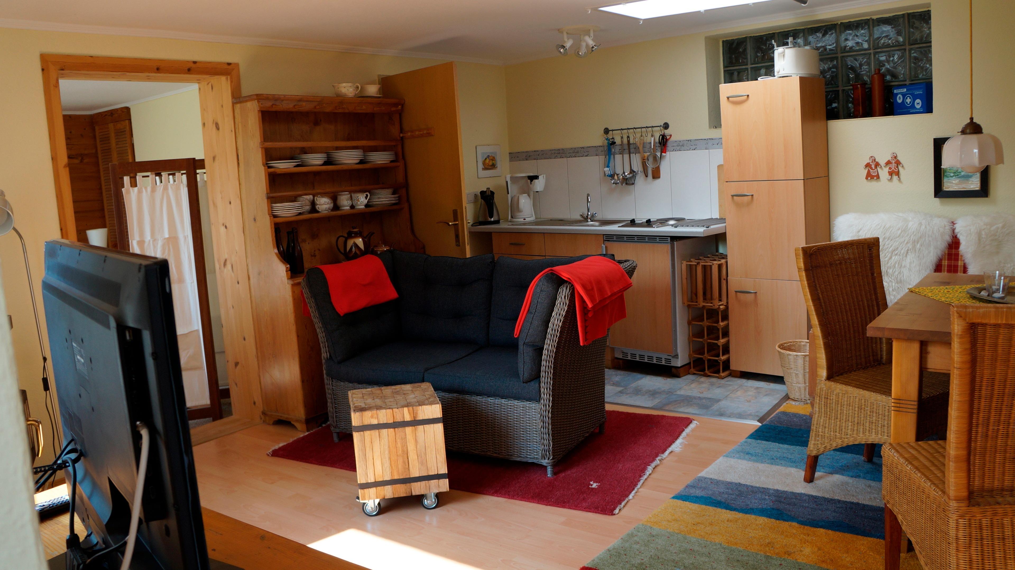 Ferienhaus in ruhiger Lage. Kombiniertes Wohn-Schlafzimmer mit Pantryküche. Gesamtgröße 37m²