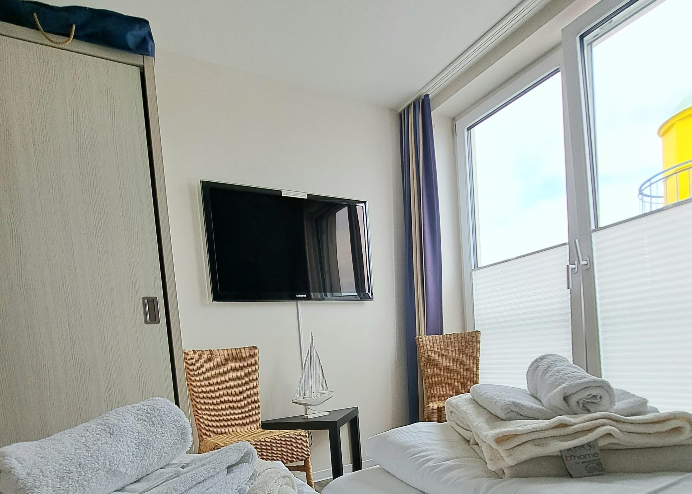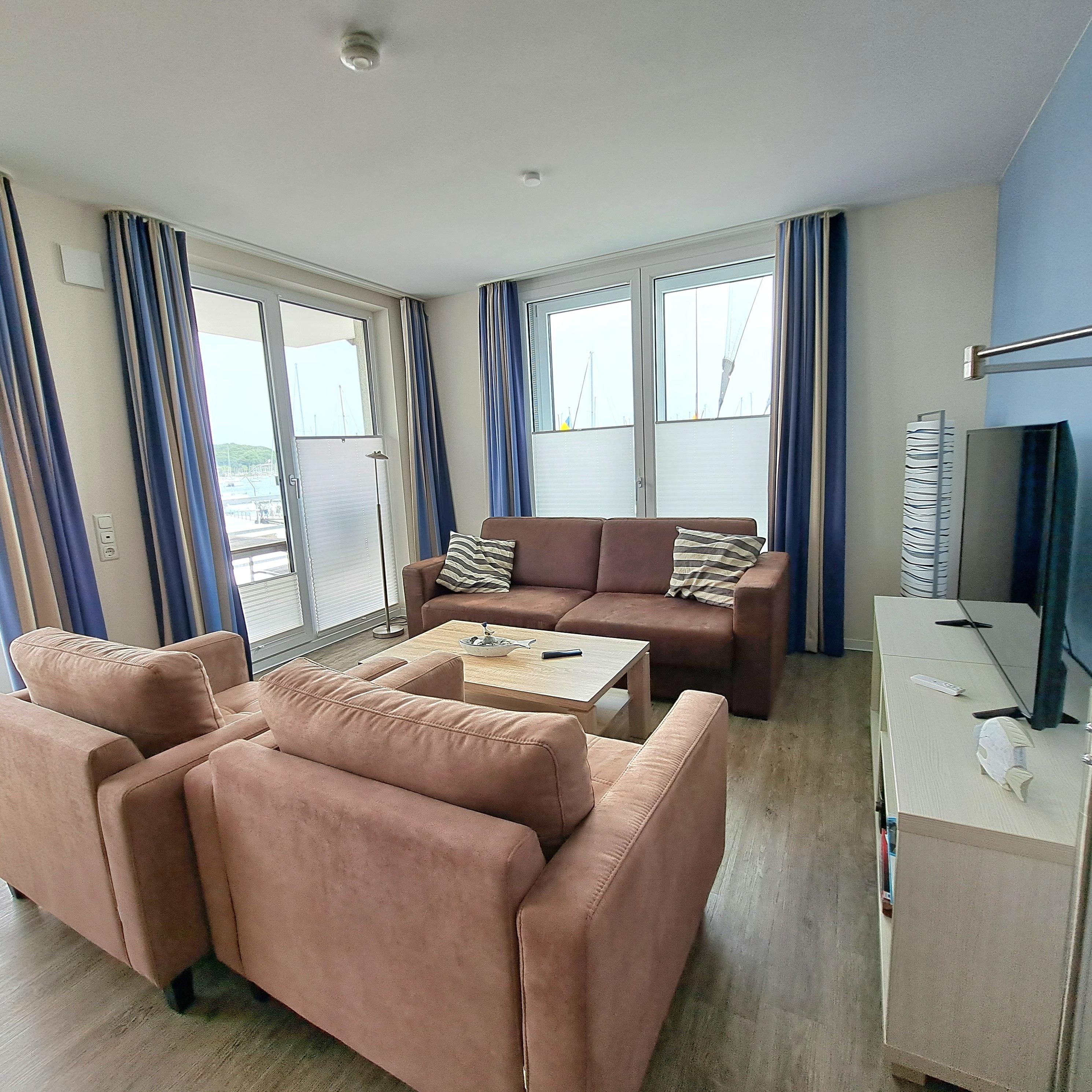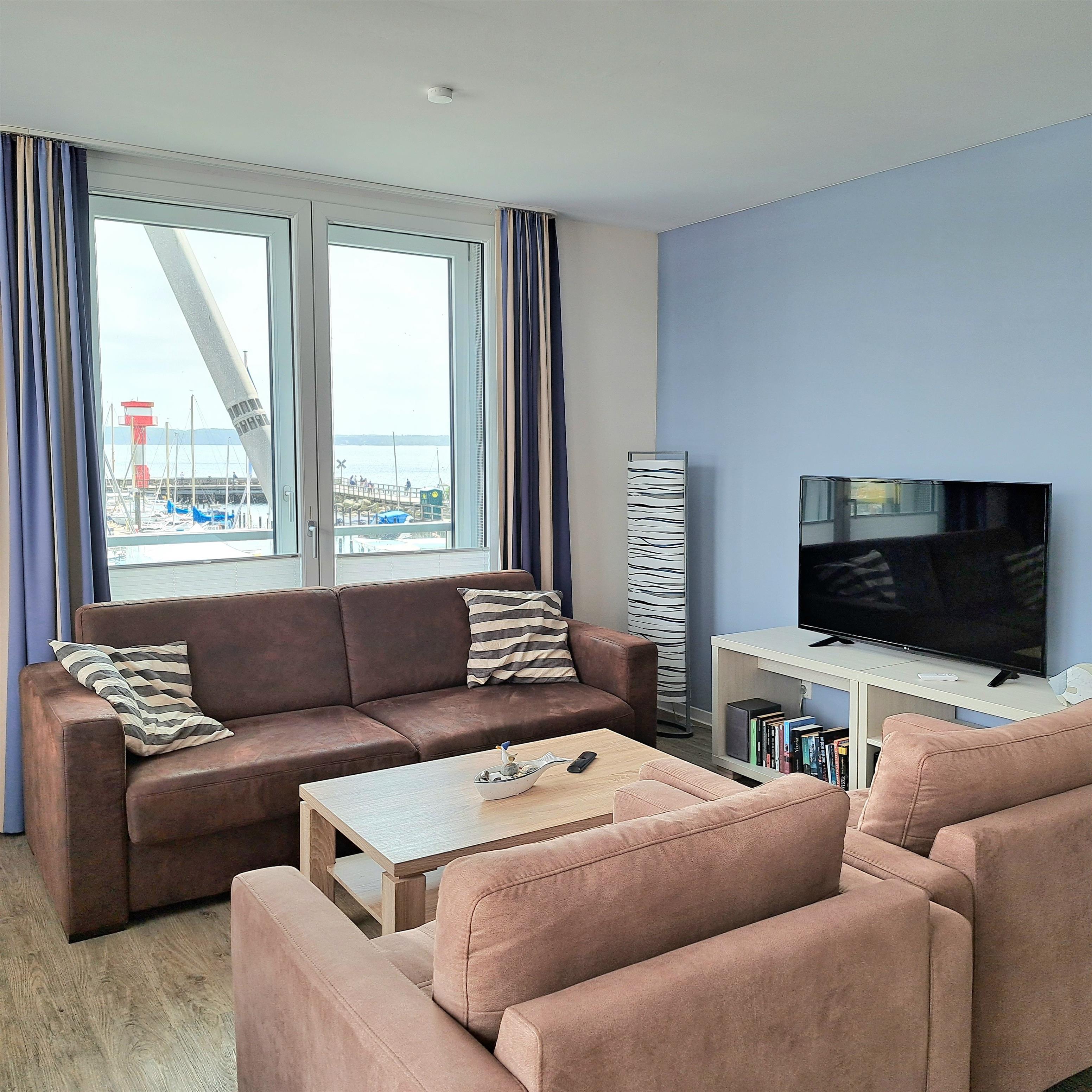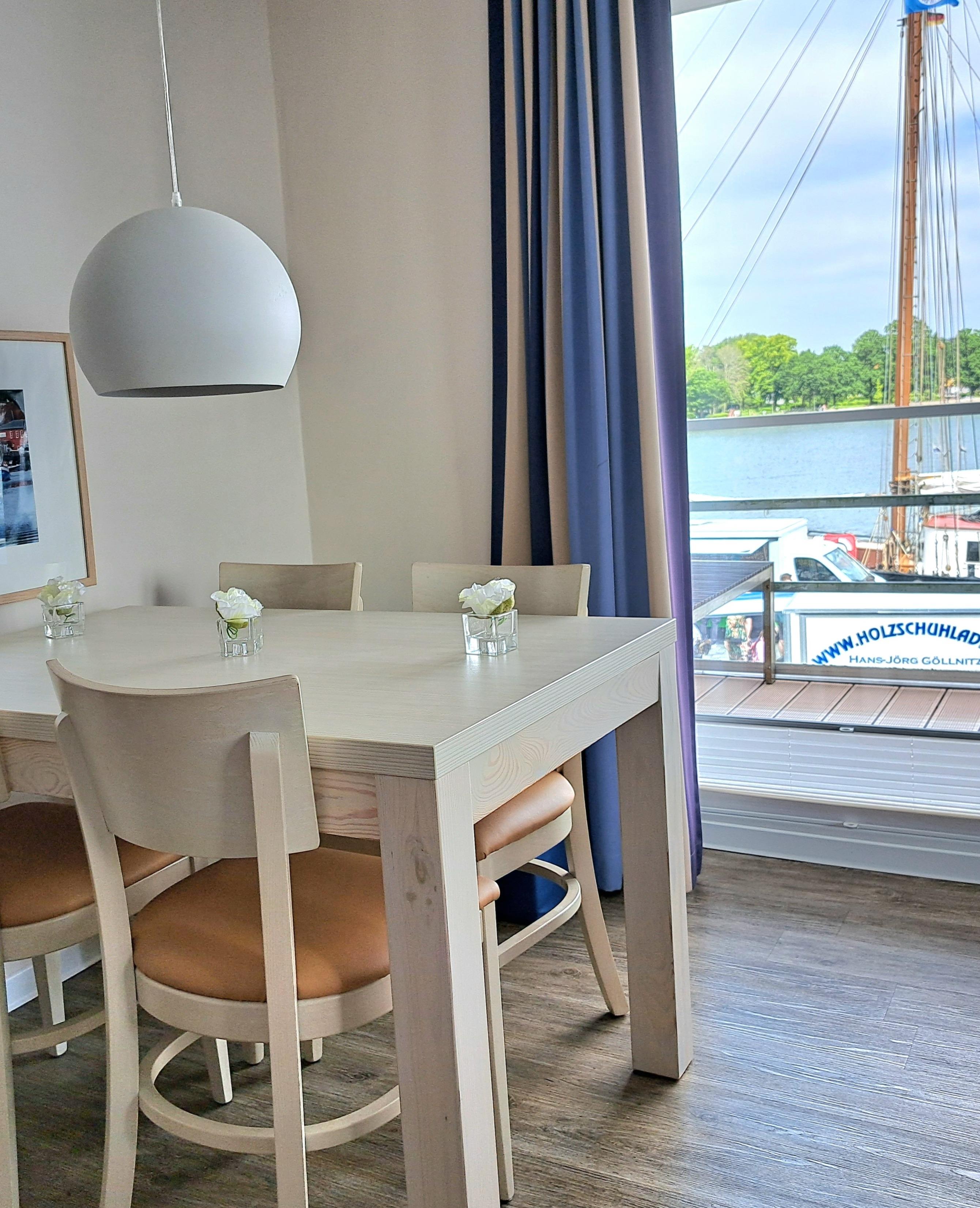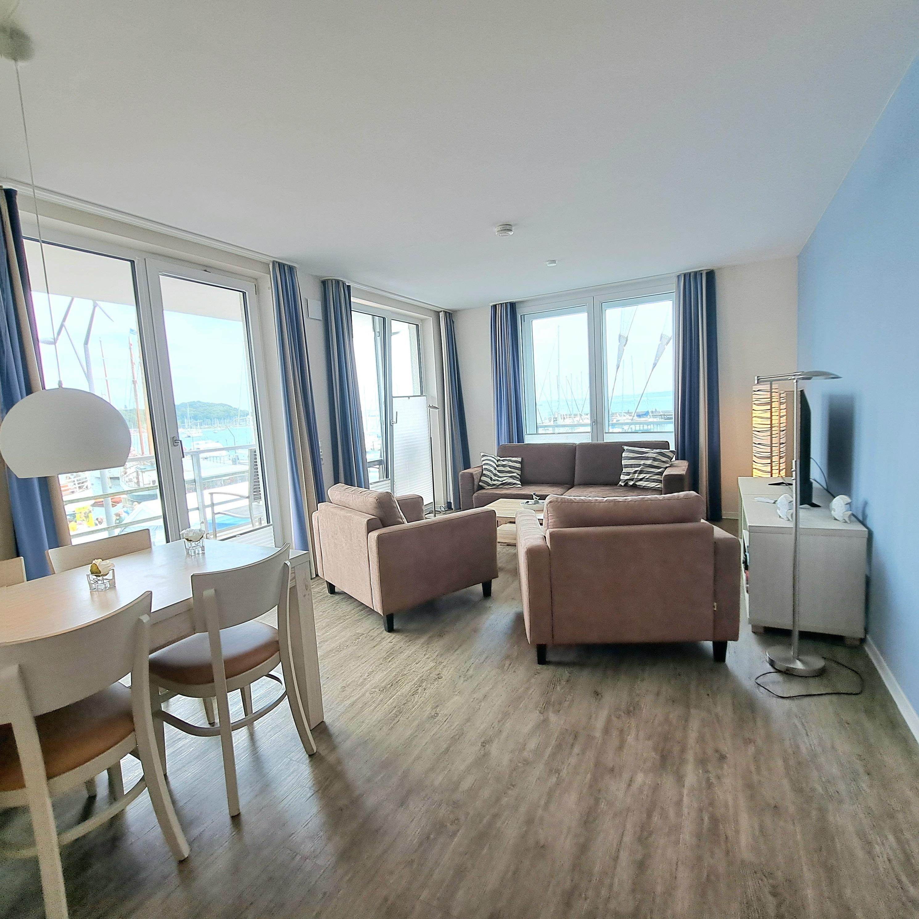 Das modern eingerichtete Apartment wurde 2014 fertiggestellt. Es verfügt über ein Wohn/Esszimmer mit bequemer Sitzgruppe und einen Esstisch für vier Personen. Für Unterhaltung sorgt neben einer kostenfreien WLAN-Verbindung, eine Stereoanlage (Radio/CD/iPhone/USB) und Kabel-TV / 2 Fernseher mit je 123 cm Bildschirm im Wohn- und Schlafzimmer. Auch vom separaten Schlafzimmer haben Sie den schönen Blick über den Hafen und Borby. Für einen geruhsamen Schlaf sorgen bequeme Boxspringbetten mit geteilter Matratze.