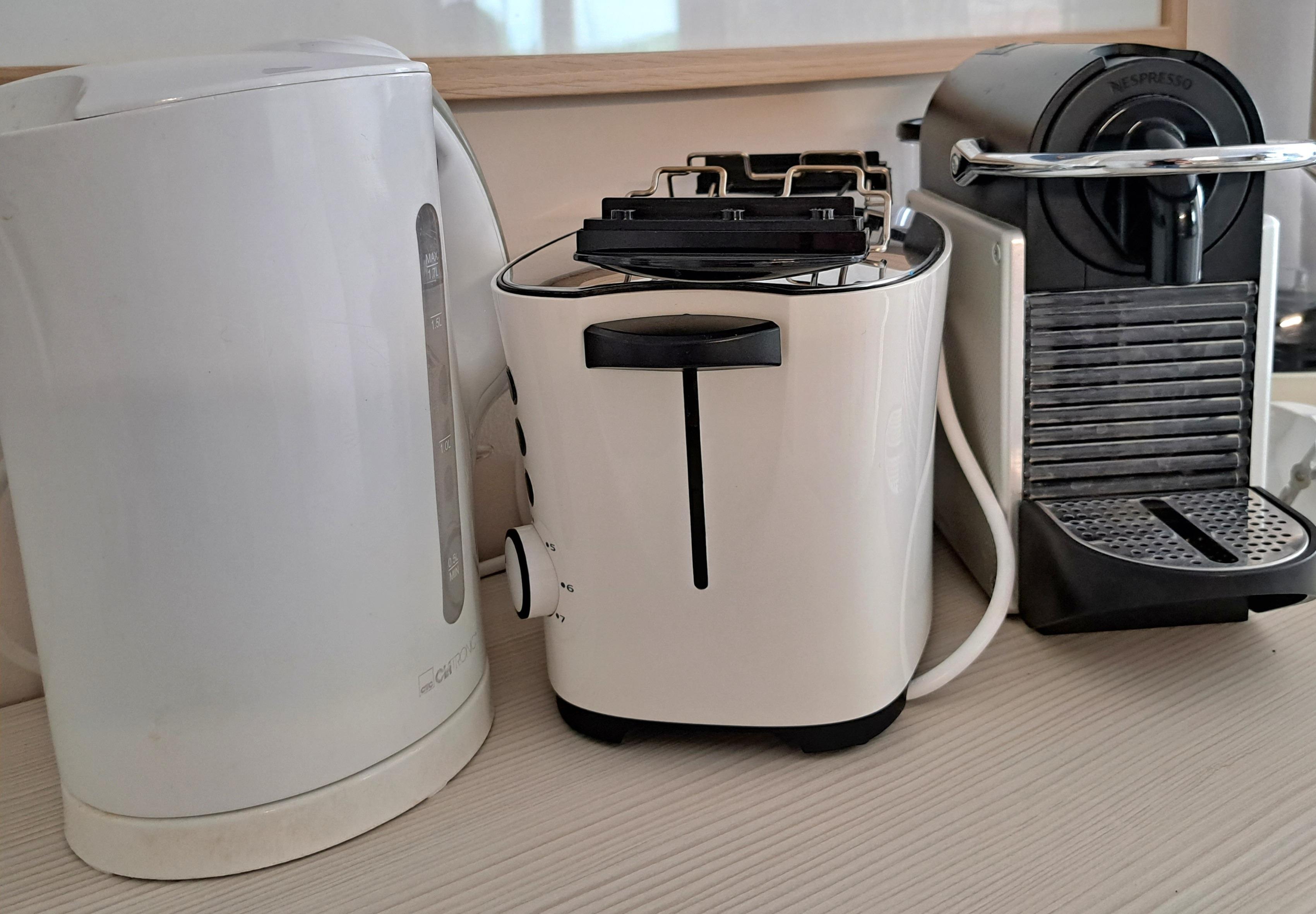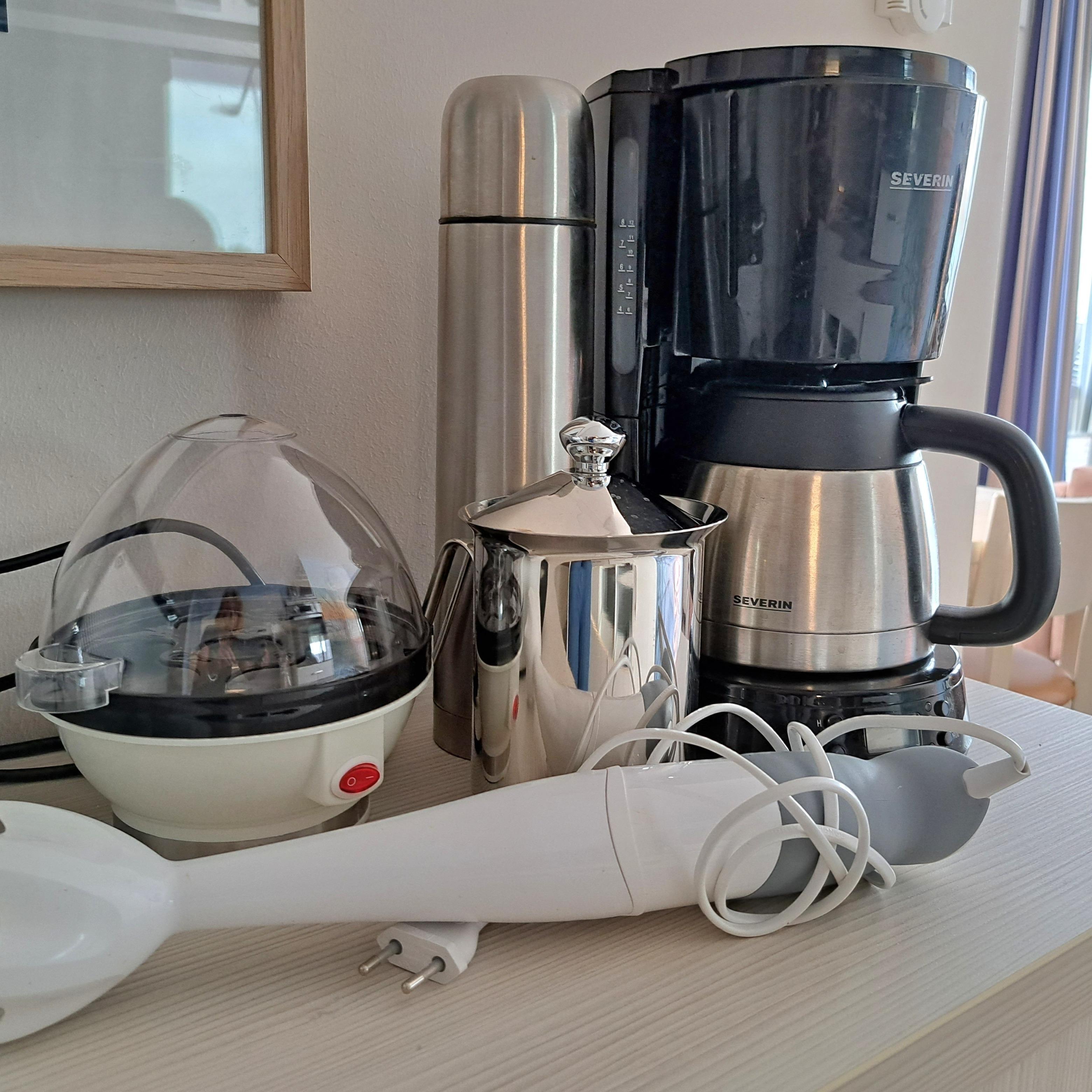 Die kleine Küchenzeile verfügt neben einem vierfach Ceranfeld über einen Backofen und ein Mikrowellengerät. Ein Kühlschrank mit Eisfach und eine Geschirrspülmaschine komplettieren die Ausstattung. An Kleingeräten stehen eine Kaffee- und eine Nespresso Maschine, ein Wasserkocher sowie Toaster und Mixer bereit. Sie finden alle nötigen Küchenutensilien für vier Personen. Im Erdgeschoß stehen Waschmaschinen und Trockner bereit.