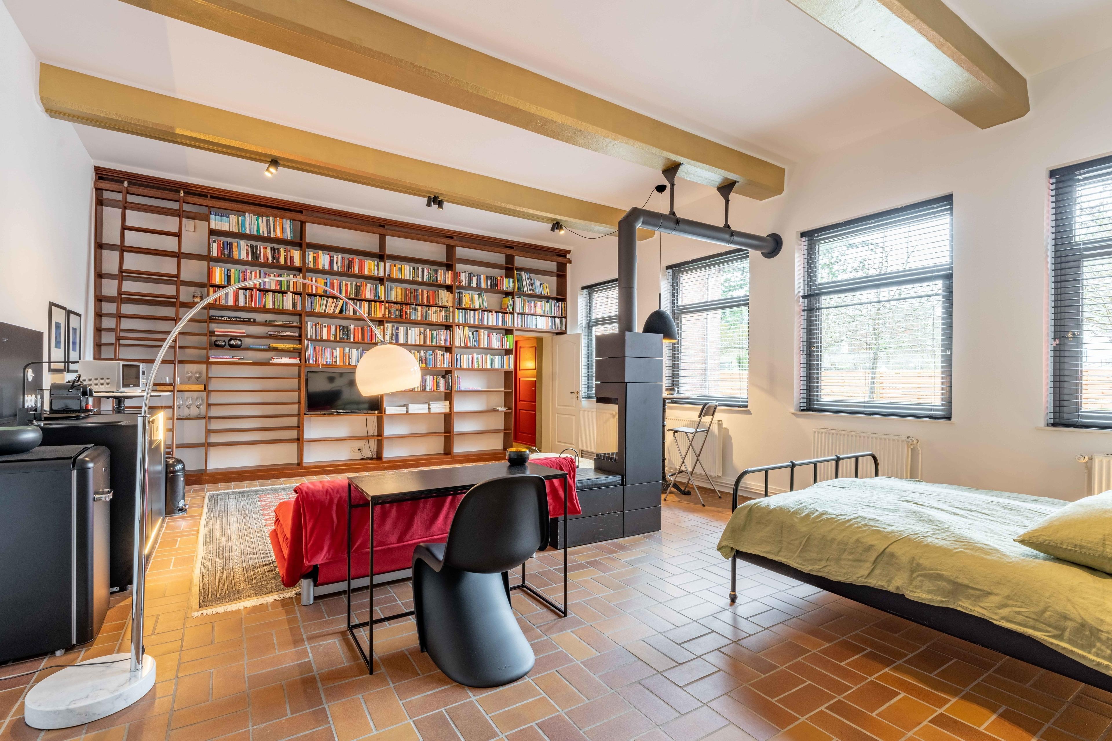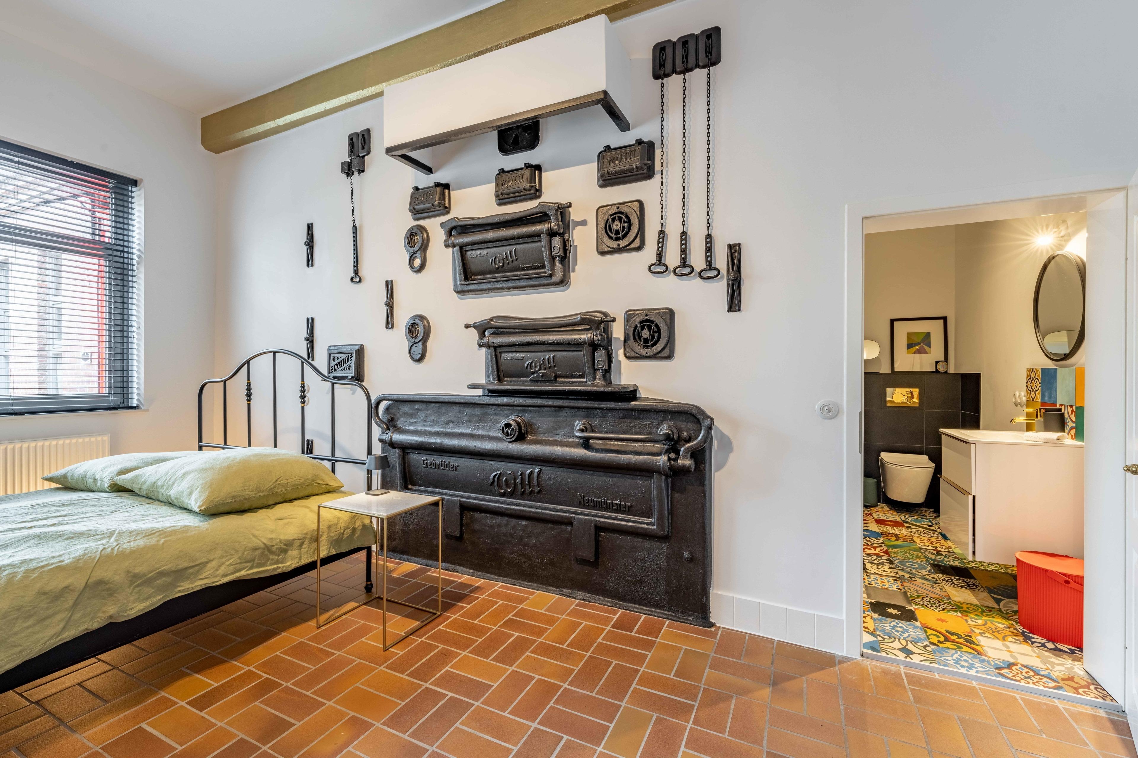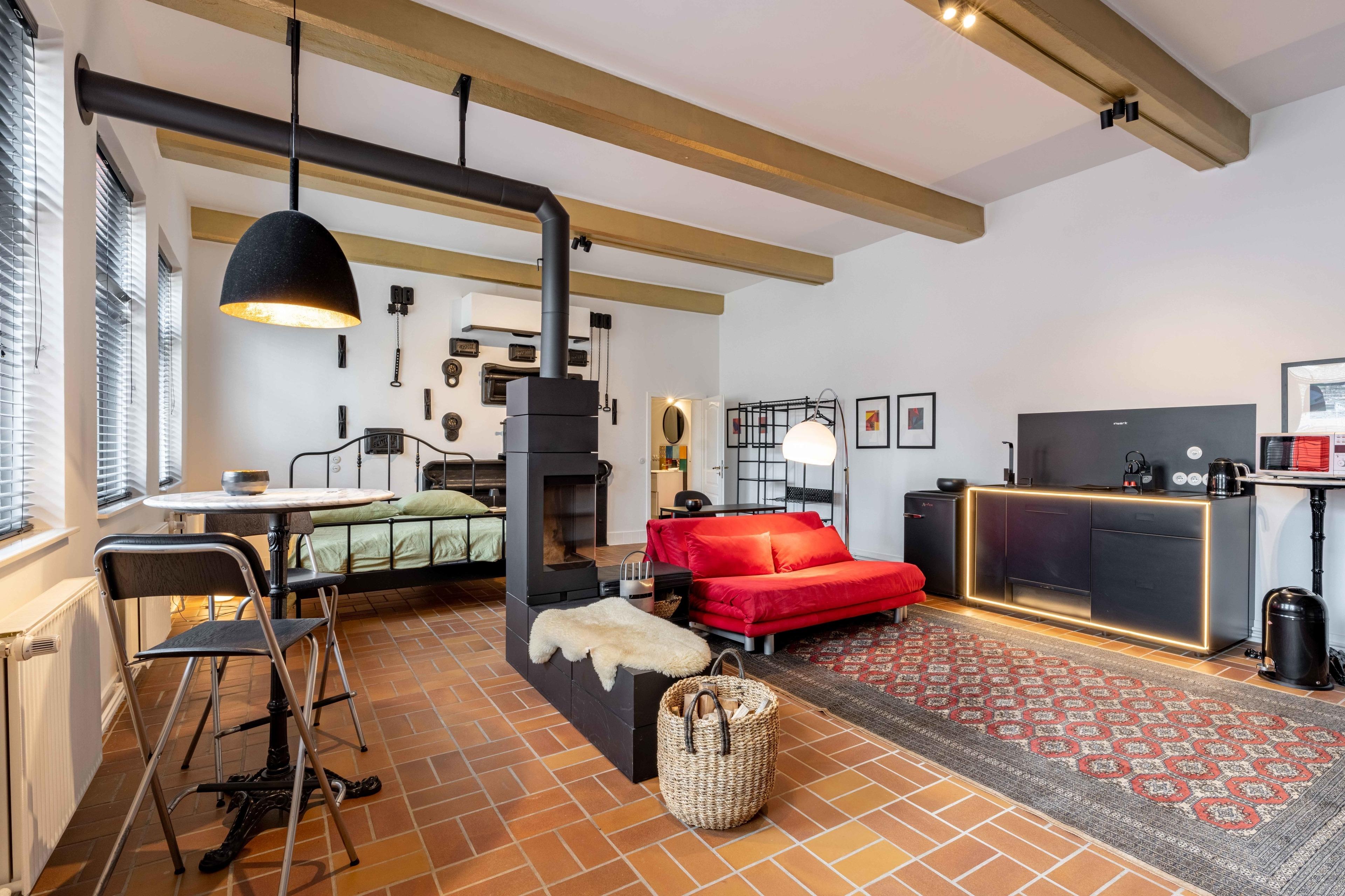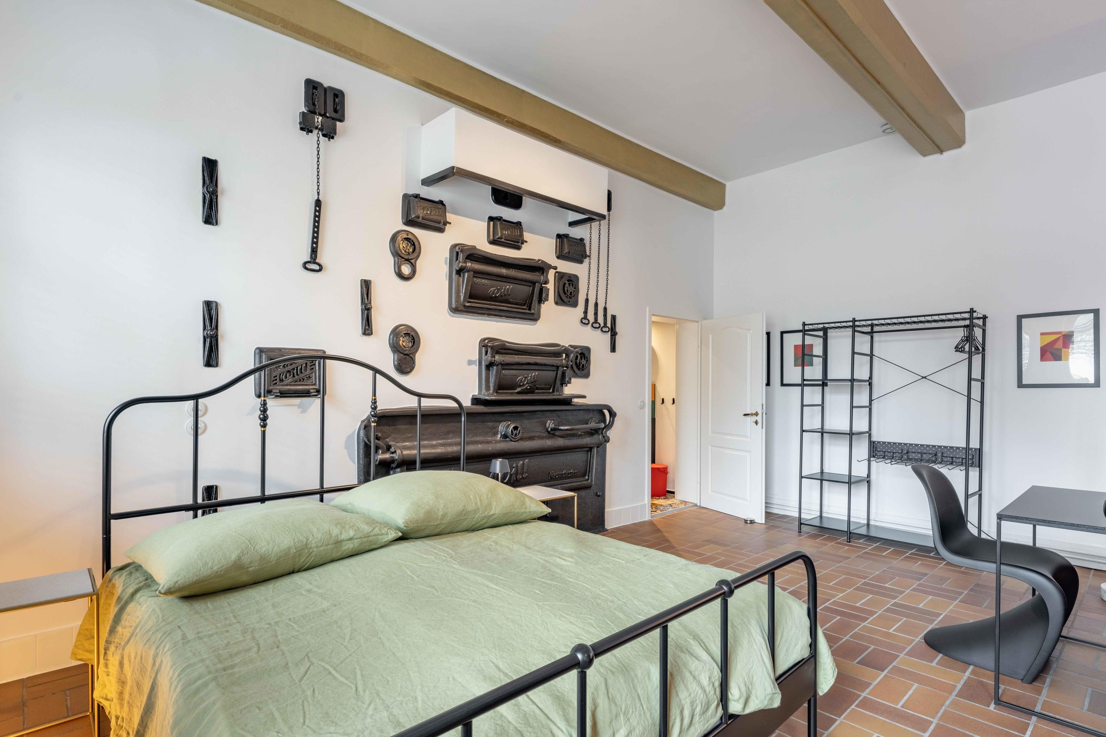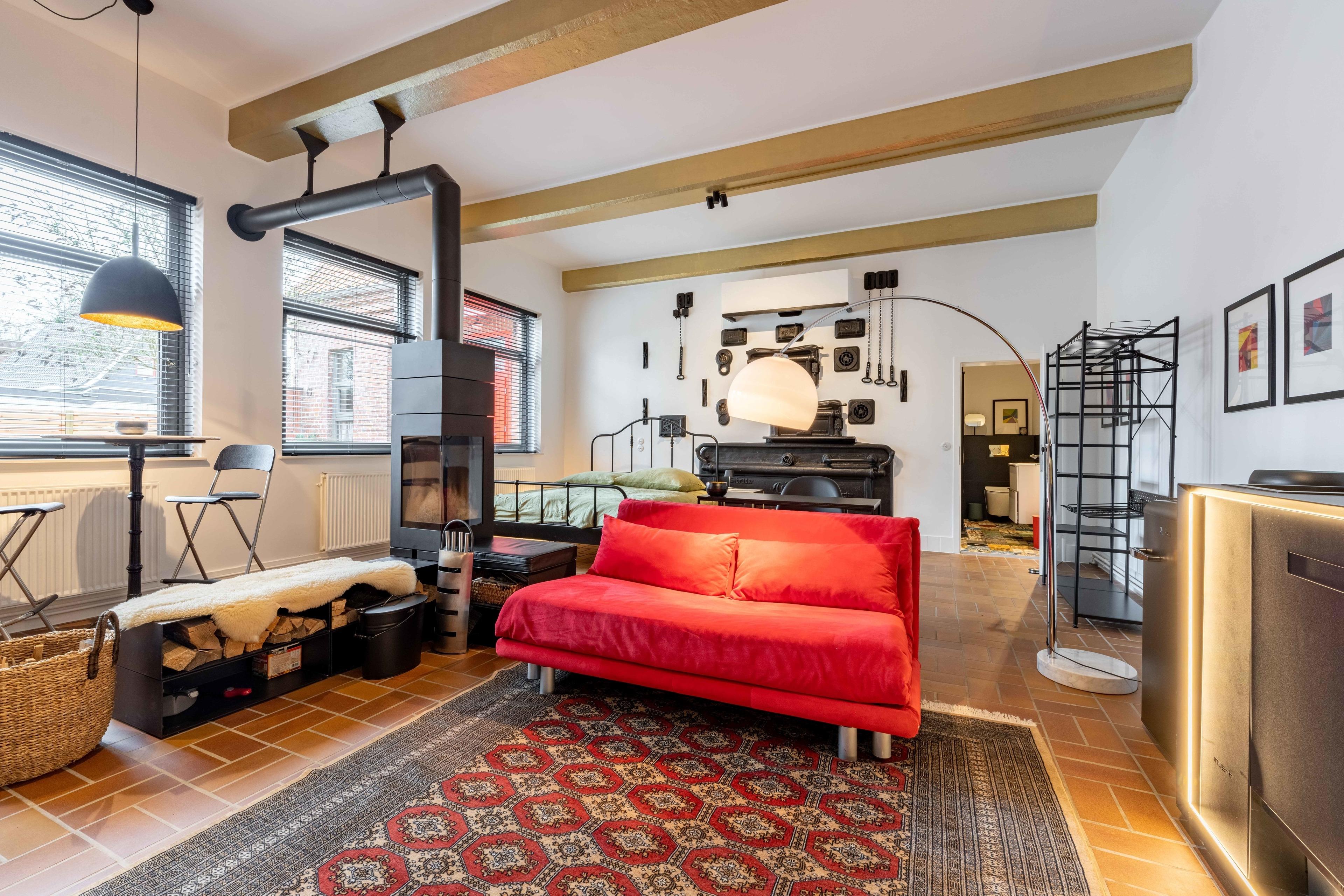 Genießen Sie die Besonderheit eines Industrie-Lofts in der Ferienwohnung Landbäckerei 2. Hohe Decken und ein musealer Dampfbackofen aus Gusseisen.