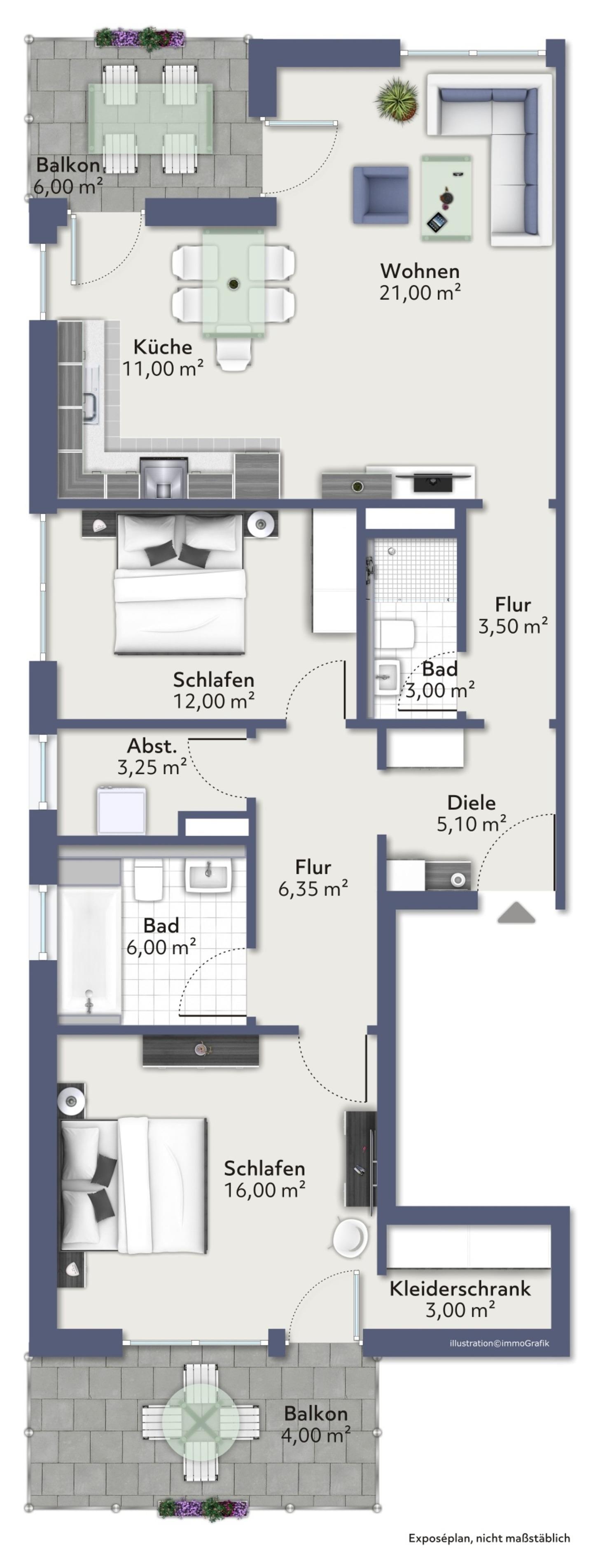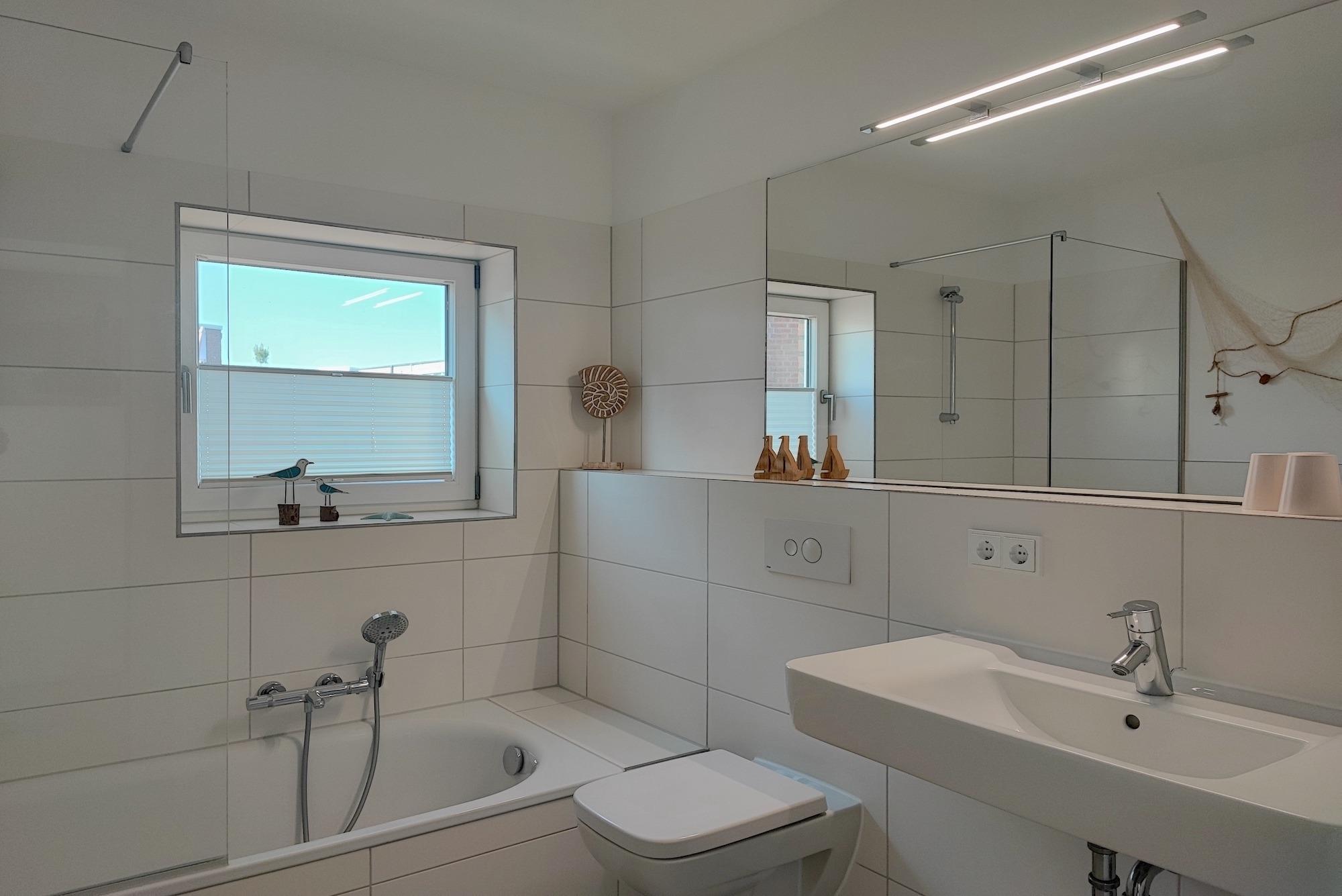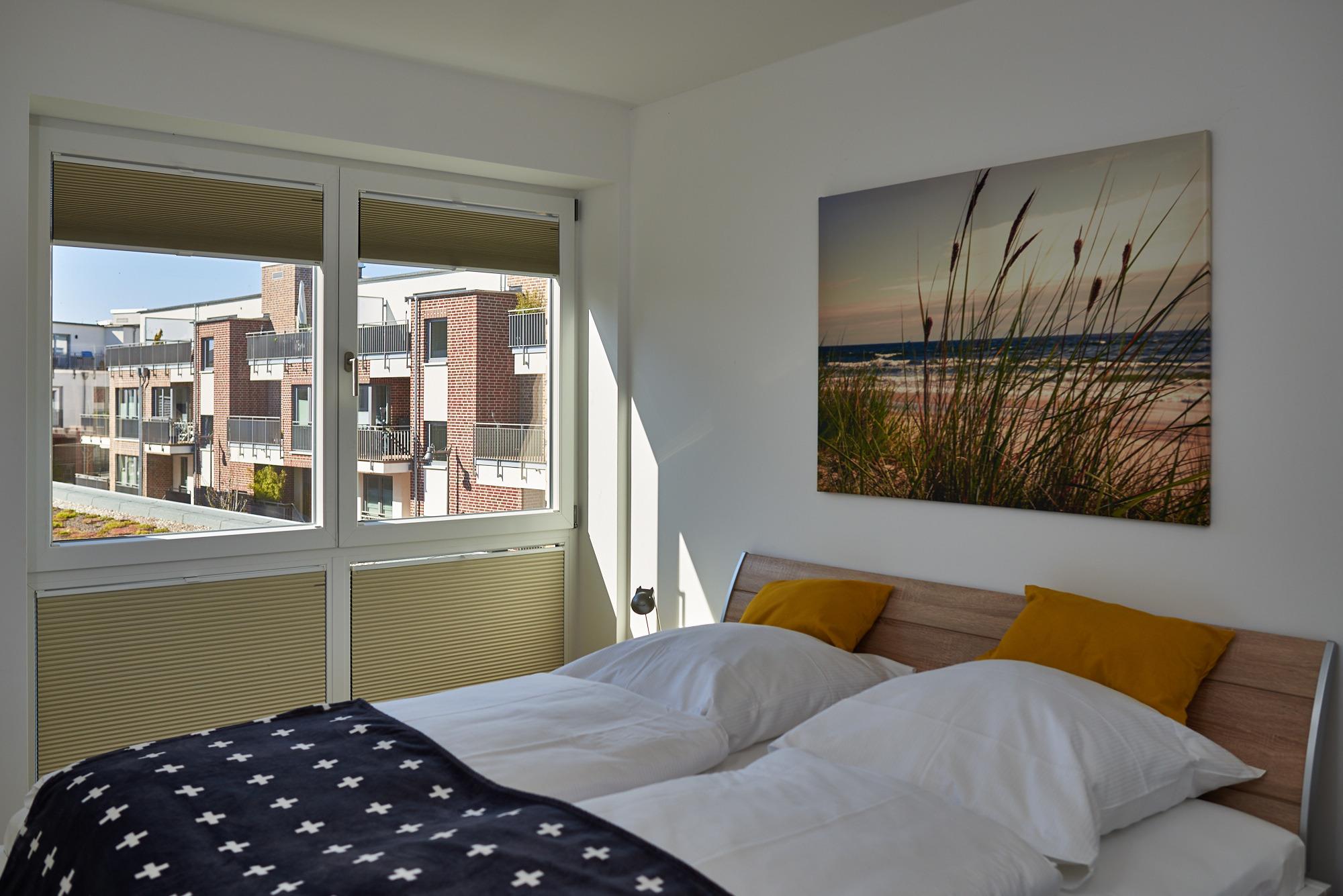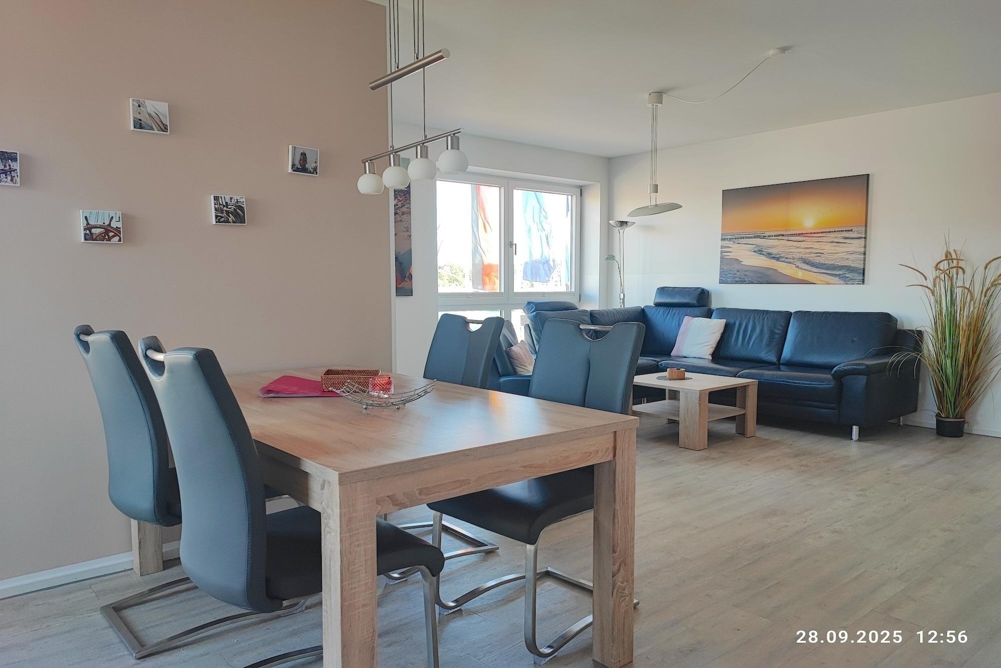 Die Wohnung ist aufgrund der Ausstattung und Einrichtung zum Wohlfühlen für Familien mit maximal 4 Personen und einem Kleinkind, als auch ideal für zwei Paare, aufgrund der zwei Schlafzimmer, zwei Bädern und zwei Balkone. Der großräumige Wohnraum bietet eine große Vielfalt an Möglichkeiten, vom großem Esstisch zum Essen oder Arbeiten über den bequemen Wohnbereich mit großem TV Bildschirm. Das Wohnzimmer verfügt über eine Lederchouch. Die im 1. Obergeschoss gelegene Ferienwohnung, mit Hauseingang im Treppenhaus, verfügt über zwei Balkone. Der eine Balkon bietet Sonne am Nachmittag durch die Südausrichtung. Der andere Balkon bietet Sonne am Vormittag mit direktem Wasserblick über zum Hafenbecken. Die hochwertige und voll ausgestattete Küche bietet alles was Sie zum Zubereiten von Mahlzeiten und zum Kochen benötigen. Der Esstisch bietet reichlich Platz zum Essen für 4 Personen oder als Arbeitsplatz. Die nächtliche Erholung finden Sie in den zwei Schlafzimmer, mit je einem modernen Doppelbett und mit je einem Kleiderschrank ausgestattet. Größe der Matratzen: 2x90x210 (Überlänge) und 2x90x200. Beide Schlafzimmer verfügen über Verdunklungsmöglichkeiten durch Plissees und blickdichte Gardinen. In einem Schlafzimmer ist zusätzlich mit einem Tv Gerät und einem Schreibtisch mit Stuhl ausgestattet. Vom Schlafzimmer haben Sie Zugang zum südausgerichteten Balkon. Die beiden Bäder sind mit einer Badewanne und einer ebenerdigen Dusche. Die Bäder sind mit Bodenfliesen und Fußbodenheizung ausgestattet und bieten viel Geräumigkeit und Abstellflächen. Alle Wohnbereiche sind hochwertig mit Echtholzboden und Fußbodenheizung ausgestattet. Die Wohnung verfügt zudem über kostenfreies WLAN / Internet. Die im 1. Stock des Appartementhauses gelegene Ferienwohnung kann ''barrierefrei'' über einen Aufzug, mit direktem Zugang aus der Tiefgarage erreicht werden. Die Symbole vom Wohngrundriss können in der Darstellung von der tatsächlichen Innen- und Außengestaltung der Wohnung abweichen!