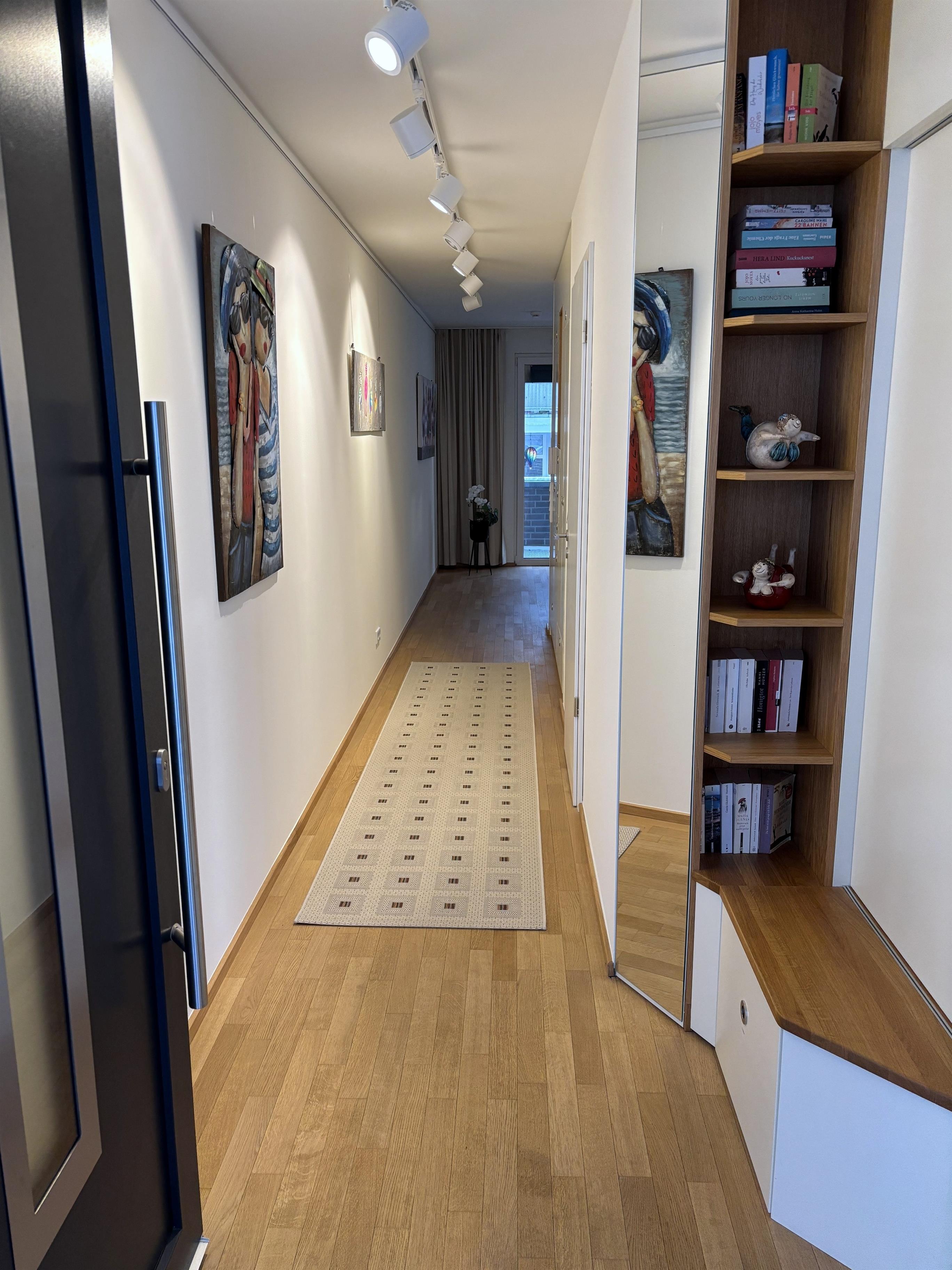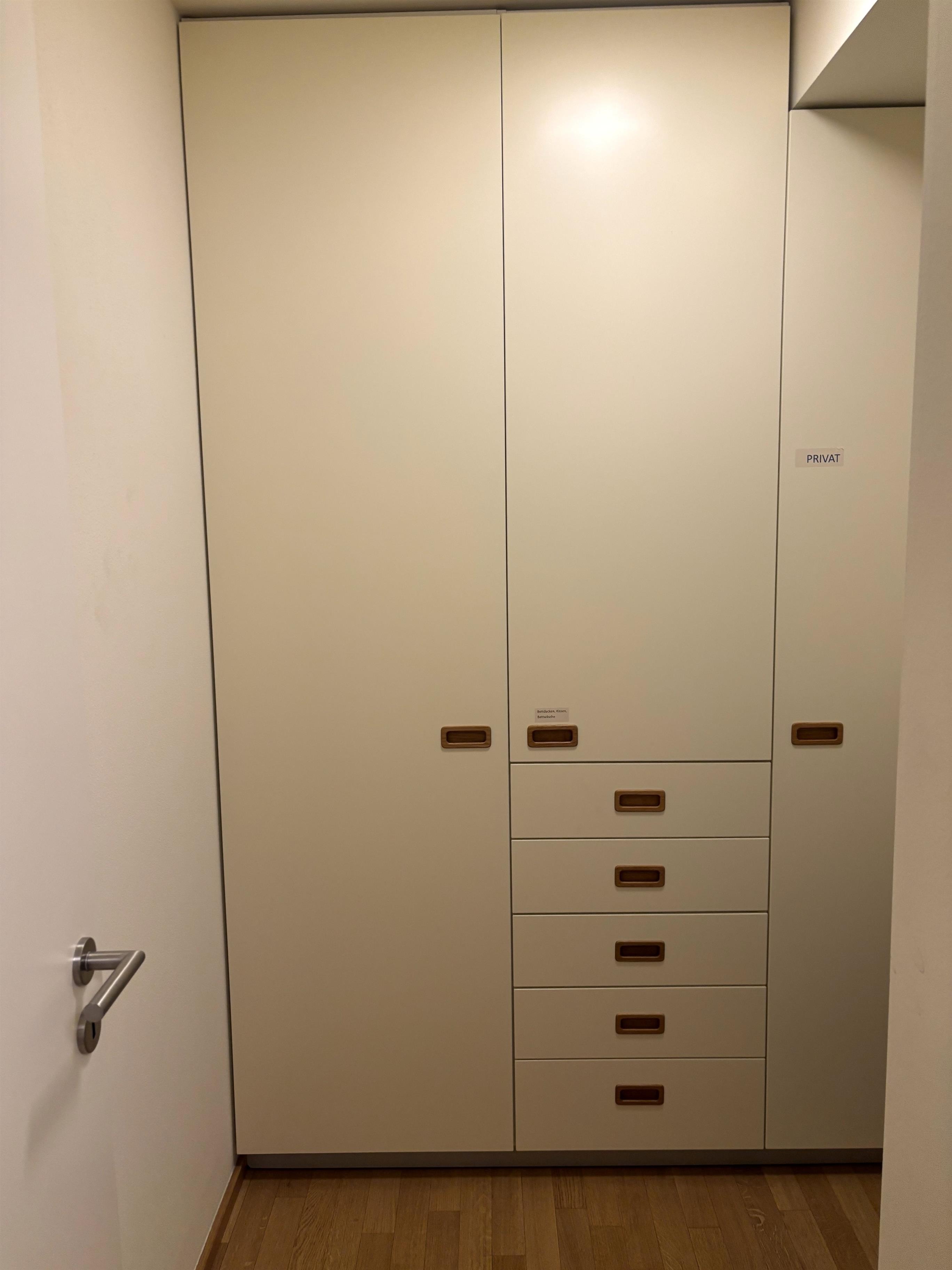 Im Wohnzimmer befindet sich ein hochwertiges, sehr wandelbares Sofa, welches bei Bedarf in ein Schlafsofa umfunktioniert werden könnte (1,40 m x 2,00 m). Es gibt eine Vielzahl an hochwertigen Einbauschränken sowie einen ausklappbaren Schreibtisch. Die Wohnung ist mit hochwertigem Parkett mit Fußbodenheizung ausgelegt.