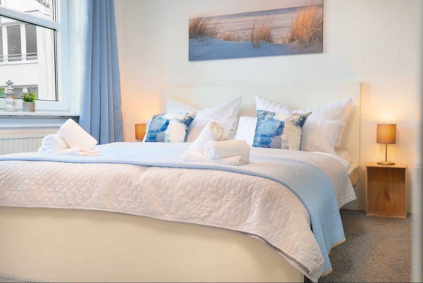 - SCHLAFZIMMER: Das Schlafzimmer ist mit einem komfortablen 1,60 m breiten Doppelbett ausgestattet. Vom Bett aus schauen Sie direkt auf die blauen Ostseewellen. Ein großer Kleiderschrank mit Schubladen, Liege- und Hängeflächen bieten ausreichend Platz für Ihre Garderobe.