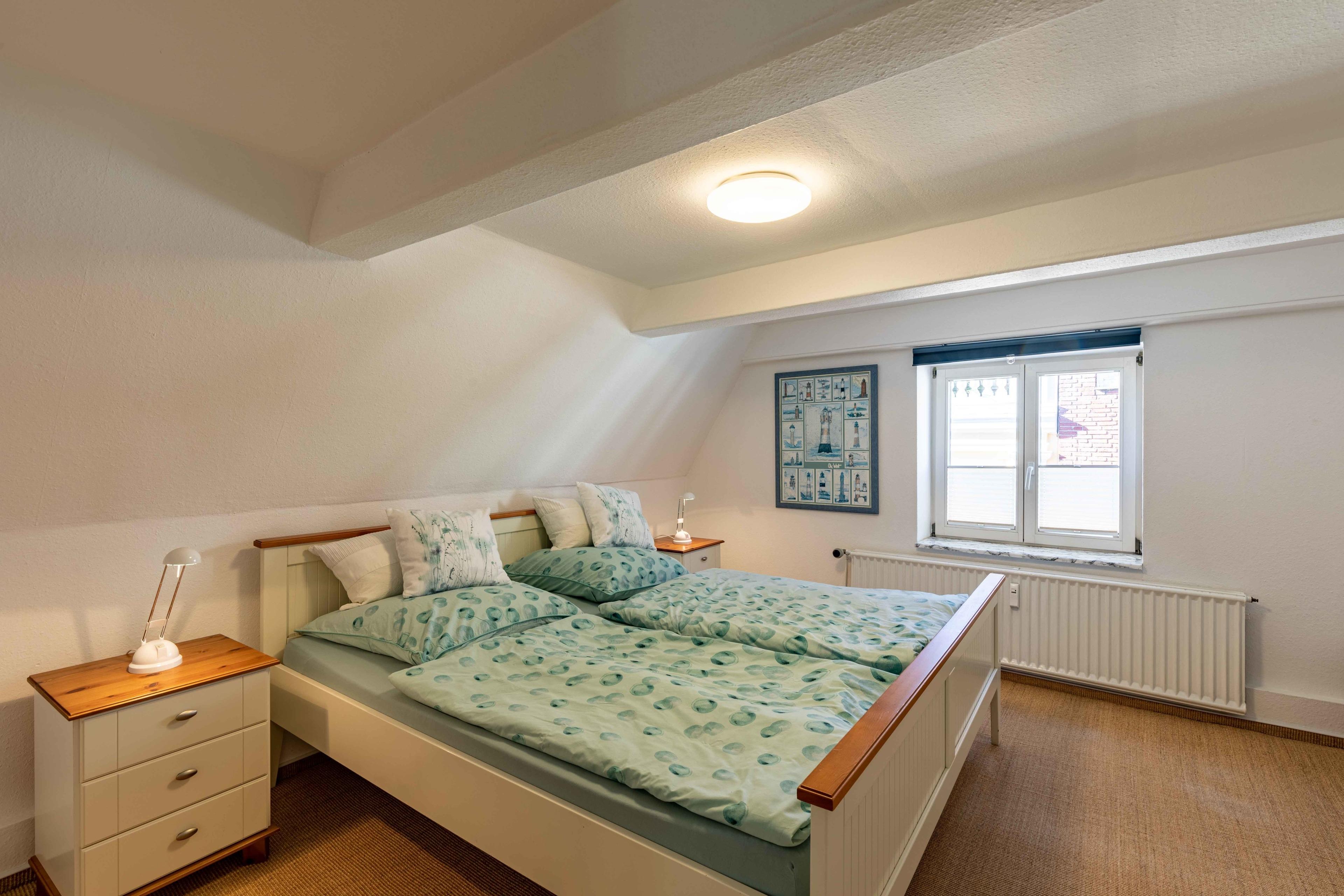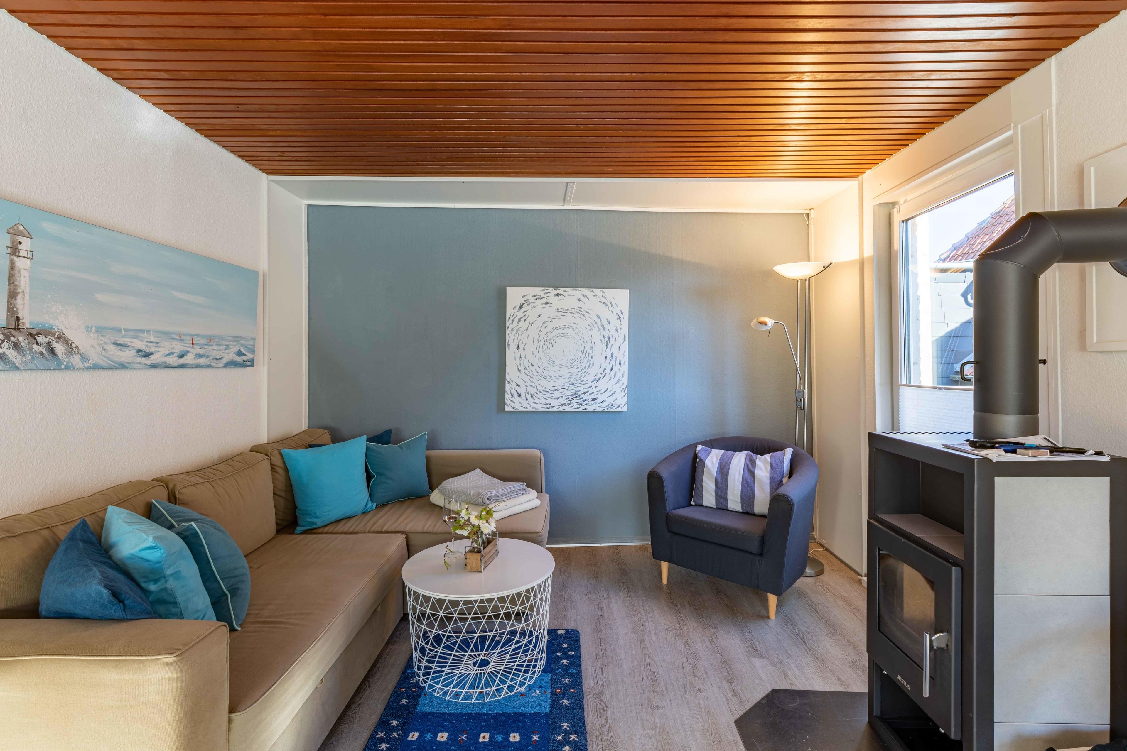 Die etwa 80 qm große Wohnung verfügt über einen Eingangsbereich mit Garderobe, Schuhablage und einem Regal, ein Wohn-Esszimmer, ein Schlafzimmer mit Doppelbett (180x200), Einbauschrank und Kommode. Ein zweites, kleineres Schlafzimmer mit einem Doppelbett (160x200) ist besonders für mitreisende Kinder geeignet, kann aber natürlich auch von Erwachsenen benutzt werden. Selbstverständlich bieten wir Ihnen eine volleingerichtete Küche (Spülmaschine, Mikrowelle, Ceranfeld, Kaffeemaschine usw.). Des Weiteren verfügt das Apartment über ein Badezimmer mit Dusche, WC und Waschbecken und einer Waschmaschine. Bei gutem Wetter - oder auch sonst - können Sie den zum Innenhof ausgerichteten Balkon nutzen und von dort aus den Blick über die Dächer der Eckernförder Altstadt genießen. Sollte es dazu zu kühl sein, sorgt ein Kaminofen im Wohnzimmer für wohlige Wärme. Zudem stehen zwei zusätzliche Schlafplätze (160x200) auf der Schlafcouch im Wohn-Esszimmer zur Verfügung. Sonderarrangements auf Anfrage.