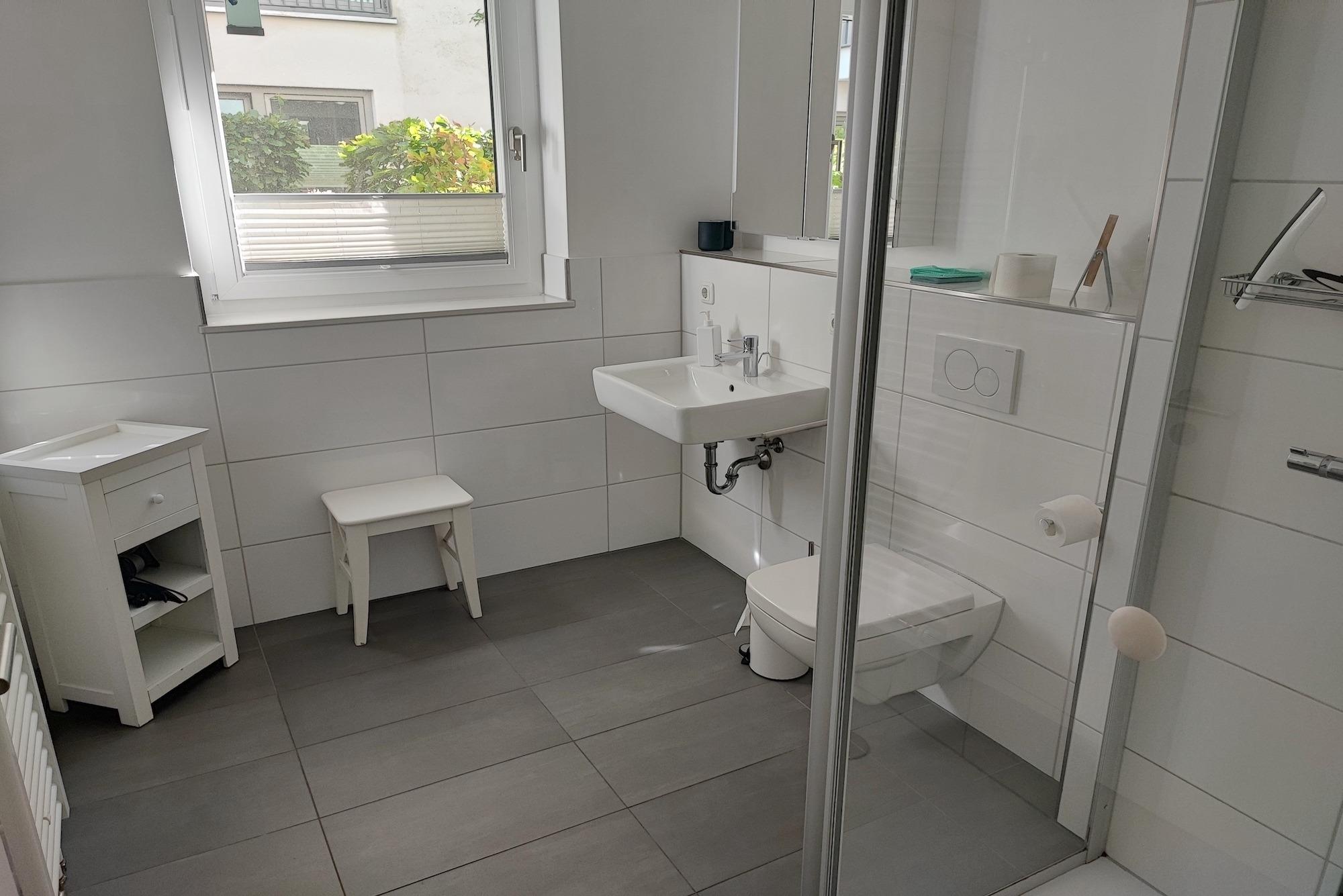 Die Dusche im Badezimmer ist ebenerdig. Die komplette Wohnung ist mit Vinylboden und Fußbodenheizung ausgestattet. Zusätzliches: Gäste-WC. Die im Hochparterre des Appartementhauses gelegene Ferienwohnung kann ''barrierefrei'' über einen Aufzug, mit direktem Zugang aus der Tiefgarage erreicht werden. Die Symbole vom Wohngrundriss können in der Darstellung von der tatsächlichen Innen- und Außengestaltung der Wohnung abweichen!