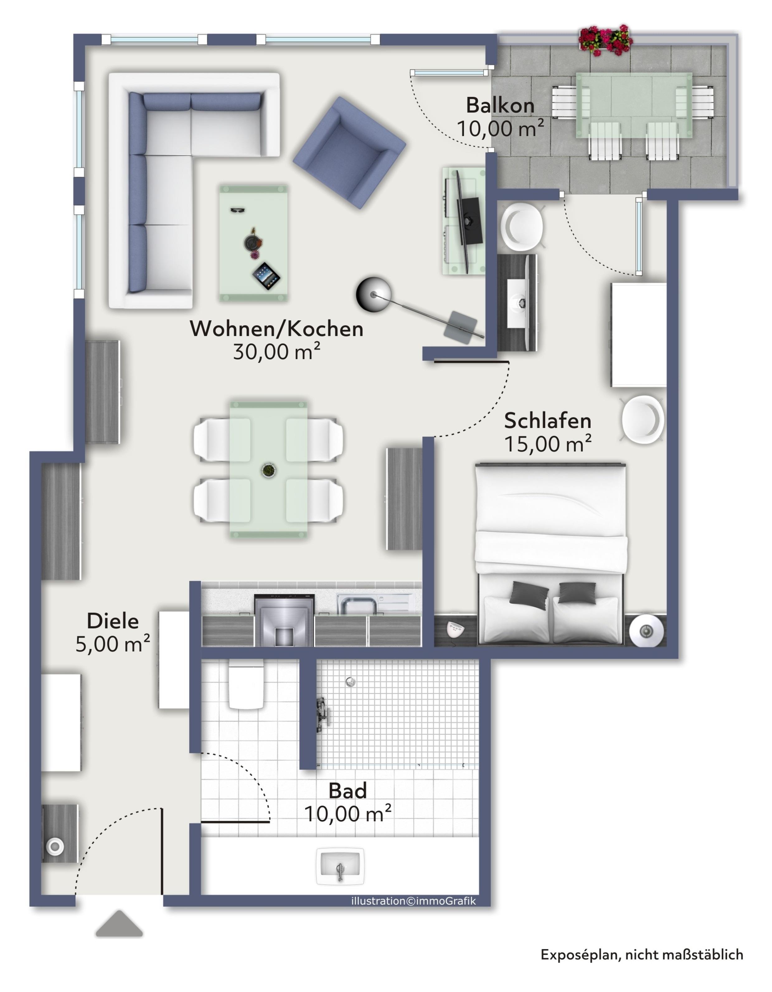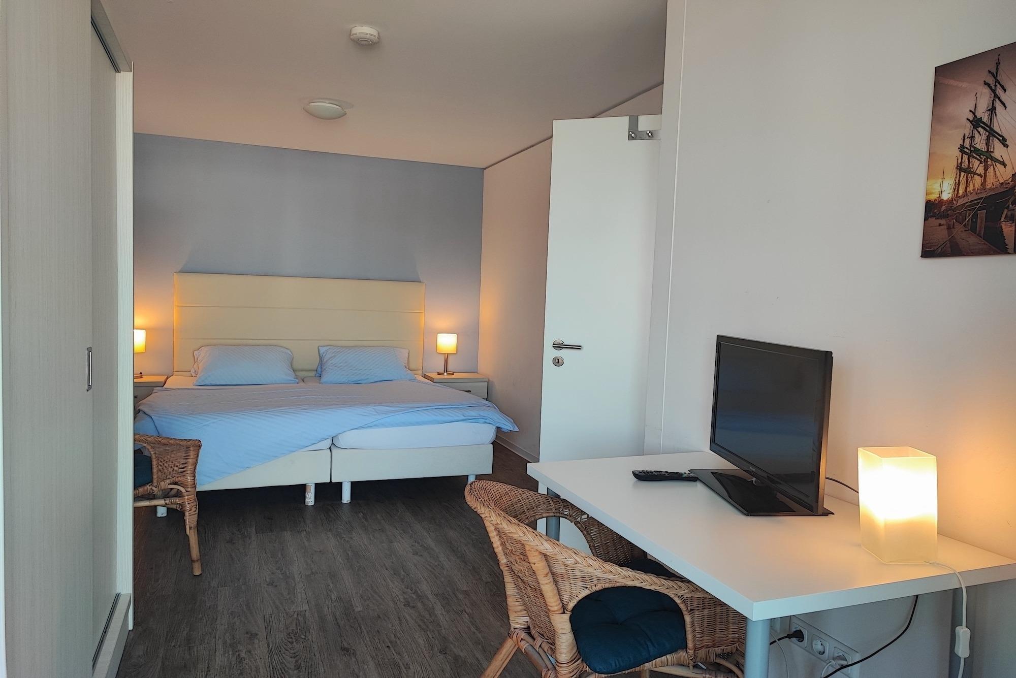 Genießen Sie durch die bodentiefen Fenster oder vom Balkon aus, den weiten Blick über die Hafenpromenade mit Wasserblick. Der gemütliche, modern eingerichtete Wohn- und Essbereich, mit voll ausgestatteter Küche, la¨dt zum gemeinsamen Entspannen und Kochen ein! Die Ferienwohnung verfügt über einen Balkon mit wunderschönem Blick auf das Hafenbecken. Das Schlafzimmer wurde mit zwei Einzelbetten (90x200), einem Kleiderschrank und einem TV-Gerät ausgestattet und bietet somit die gewünschte Erholung! Das Schlafsofa im Wohnzimmer bietet zudem U¨bernachtungsmo¨glichkeiten fu¨r 2 weitere Personen. Die Dusche im Badezimmer ist ebenerdig. Die komplette Wohnung ist mit Vinylboden und Fußbodenheizung ausgestattet. Die im 2. Deck des Appartementhauses gelegene Ferienwohnung kann über das Treppenhaus oder einem Aufzug erreicht werden. Die Symbole vom Wohngrundriss können in der Darstellung von der tatsächlichen Innen- und Außengestaltung der Wohnung abweichen!