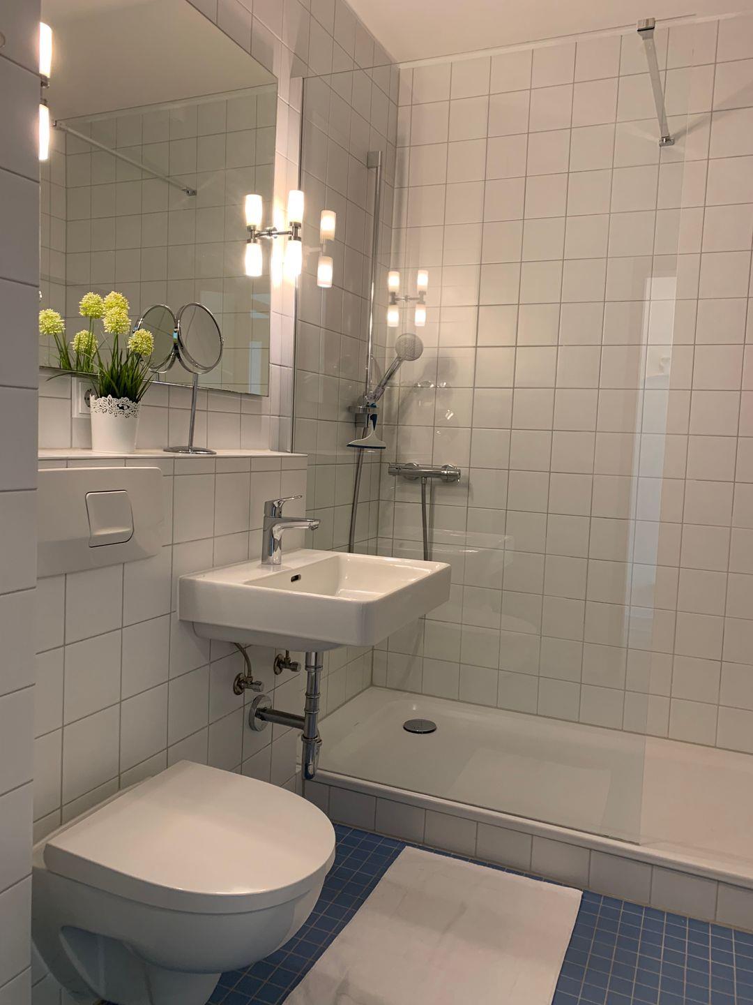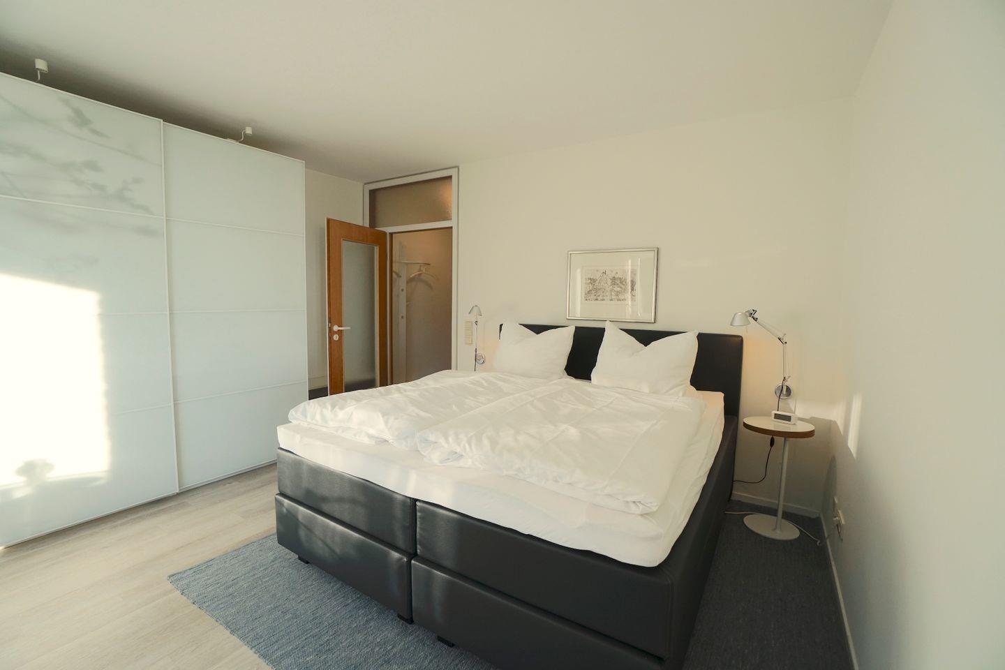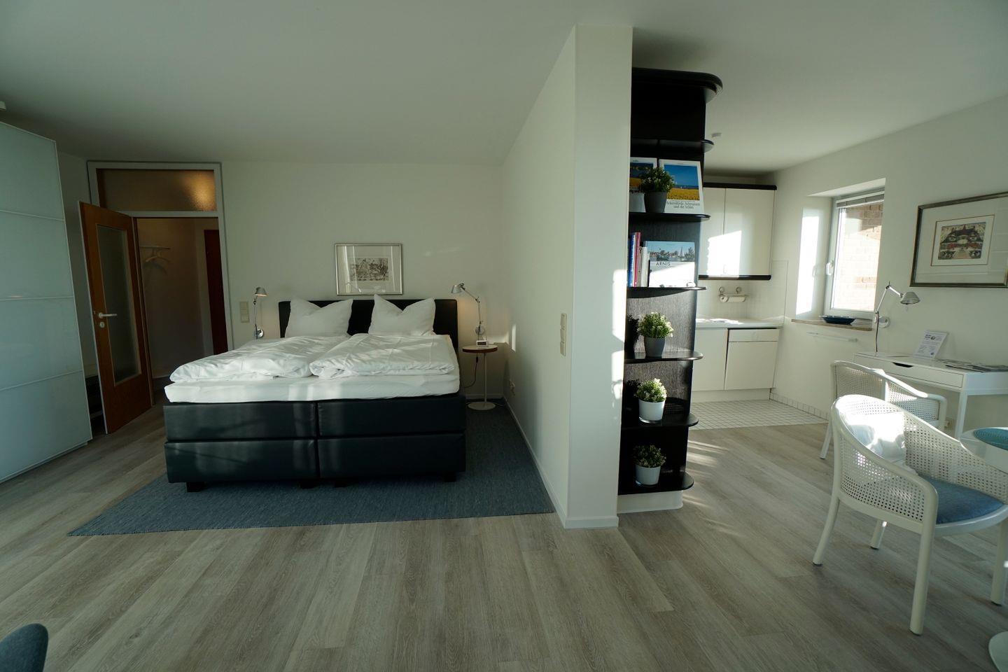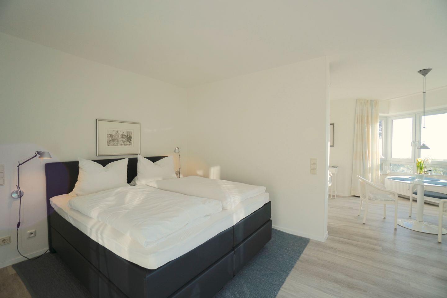 Das Apartment teilt sich auf in einen kleinen Flur mit Zugang zum Duschbad. Vom Flur aus gelangen Sie in den hellen und freundlichen Wohn- Schlafbereich der Wohnung. Für einen bequemen und erholsamen Schlaf steht ein hochwertiges Boxspringbett bereit.
