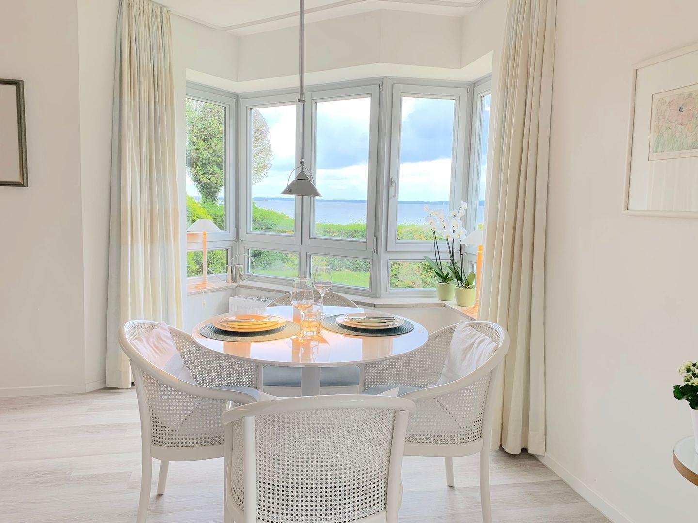 Den hinteren Teil der Wohnung bildet der Essbereich im Erker mit Panoramablick auf die Ostsee und den Eckernförder Kurstrand. Hier zu Speisen lässt Urlauberherzen höher schlagen.