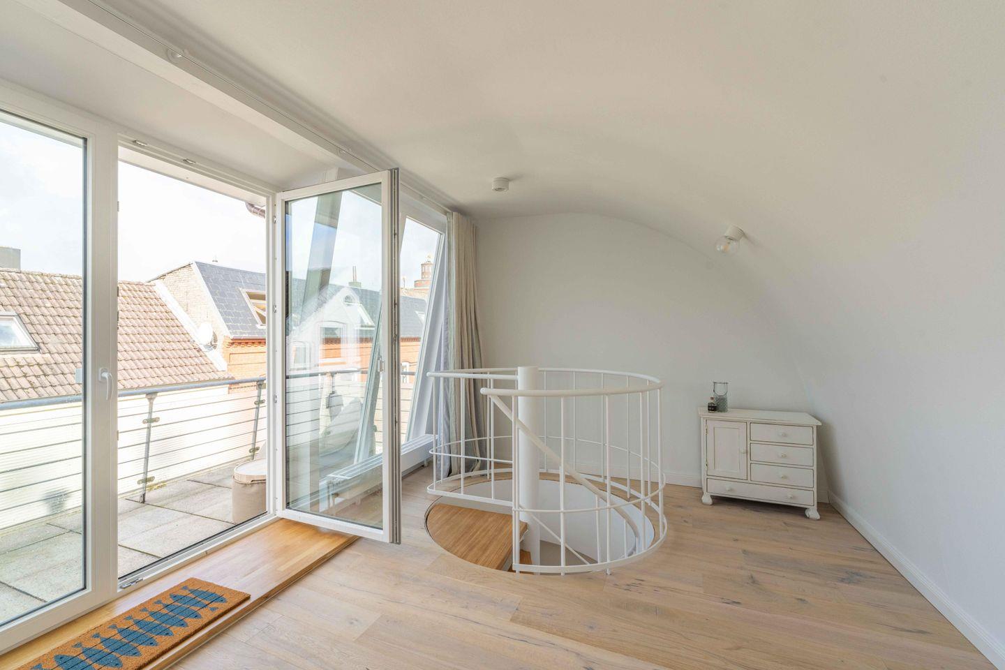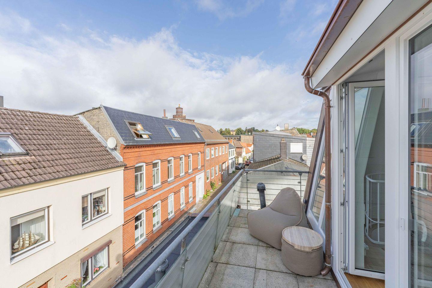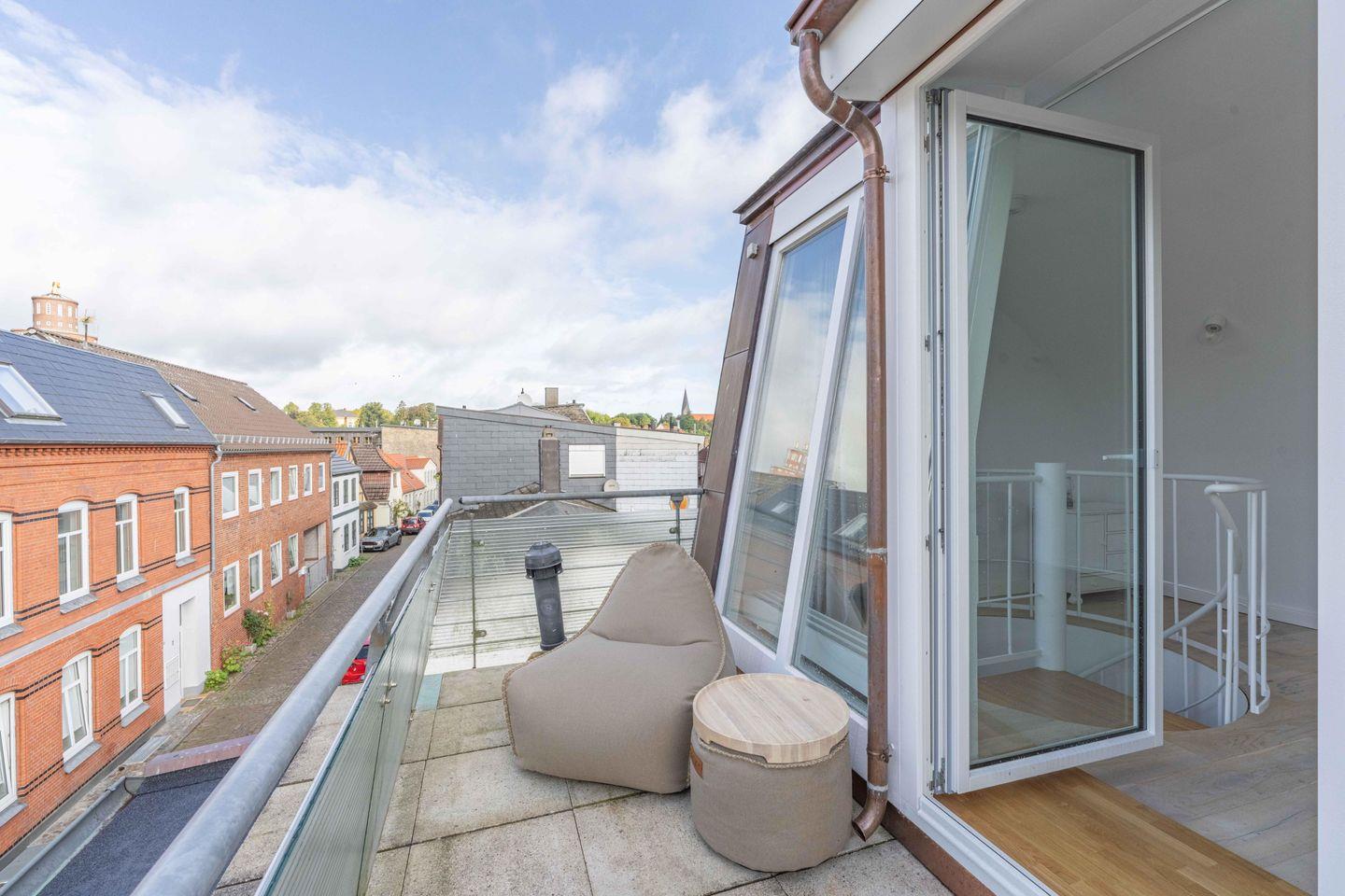 Im DG, dem Atelier ( wir nennen es auch gerne Tönnchen ), befindet sich eine Schlafsofa. Durch die große Glasfront schaut Ihr direkt über Eckernförde Altstadt. Dank der schönen Outdoor-Möbel könnt Ihr es Euch dort so richtig gemütlich machen.