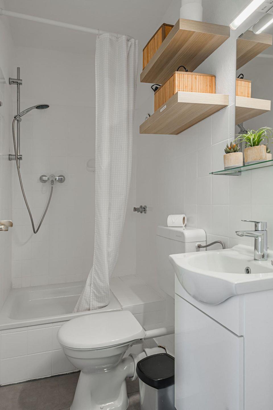 Das Badezimmer der Wohnung ist mit einer modernen Dusche ausgestattet, die sich hervorragend für eine erfrischende Auszeit eignet. Der gesamte Wohnraum ist ein Nichtraucherbereich, was zur allgemeinen Sauberkeit und Frische der Unterkunft beiträgt. Zudem sorgt der Sichtschutz an den Fenstern für Ihre Privatsphäre, damit Sie ungestört entspannen können.