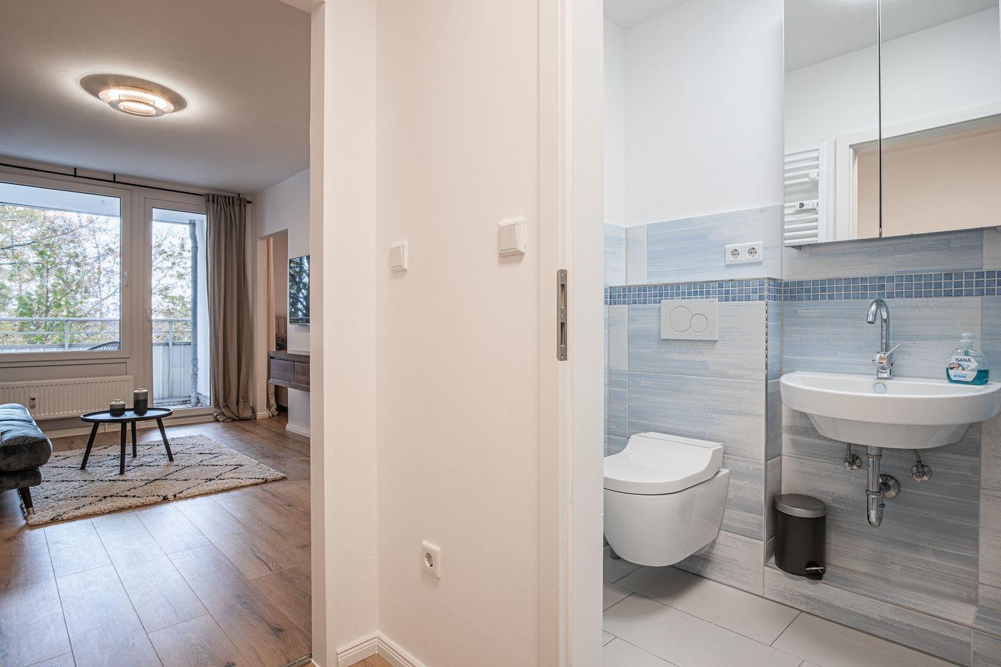 Verbringe einen tollen Aufenthalt in der hellen Wohnung mit Wohnzimmer, Schlafzimmer, Küche und einem Duschbad.