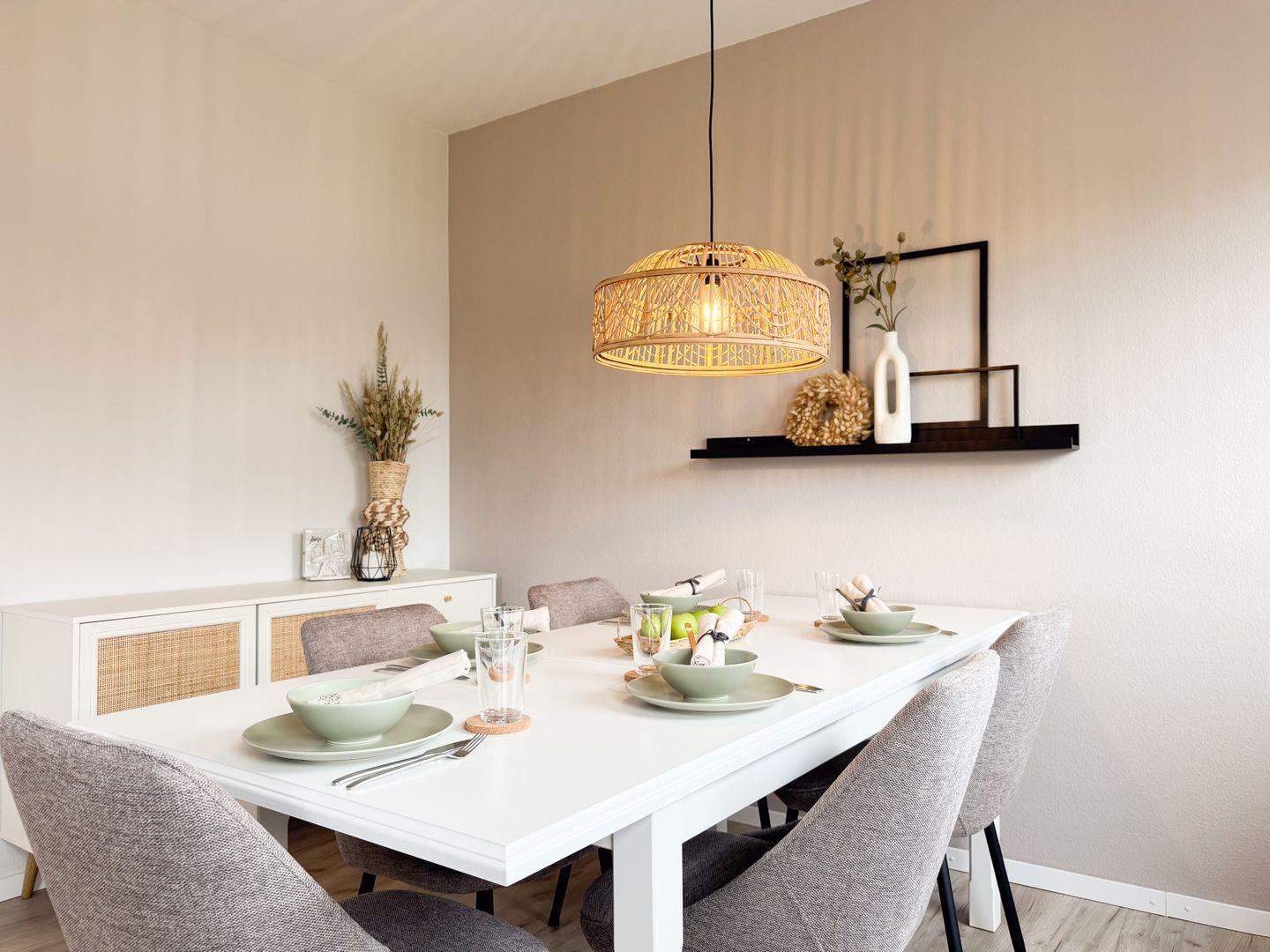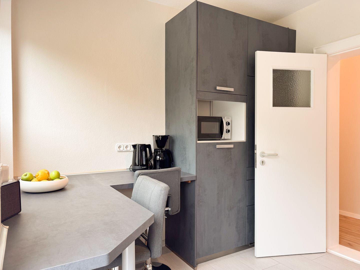 Die Unterkunft liegt in der ersten Etage und begeistert durch ihre moderne und ansprechende Einrichtung. Ein geräumiges Wohnzimmer, das mit einem komfortablen Sofa, einem Sessel und einer HiFi-Anlage ausgestattet ist. Hier könnt ihr entspannte Stunden verbringen oder eure Lieblingssendungen auf dem 35-44 Zoll großen TV genießen. Der Essbereich ist ideal, um geselliges Beisammensein zu zelebrieren. In der Küche stehen euch ein Induktionsherd, ein Kühlschrank mit Gefrierfach, eine Spülmaschine sowie alle nötigen Küchenutensilien bereit, um kulinarische Köstlichkeiten zuzubereiten.