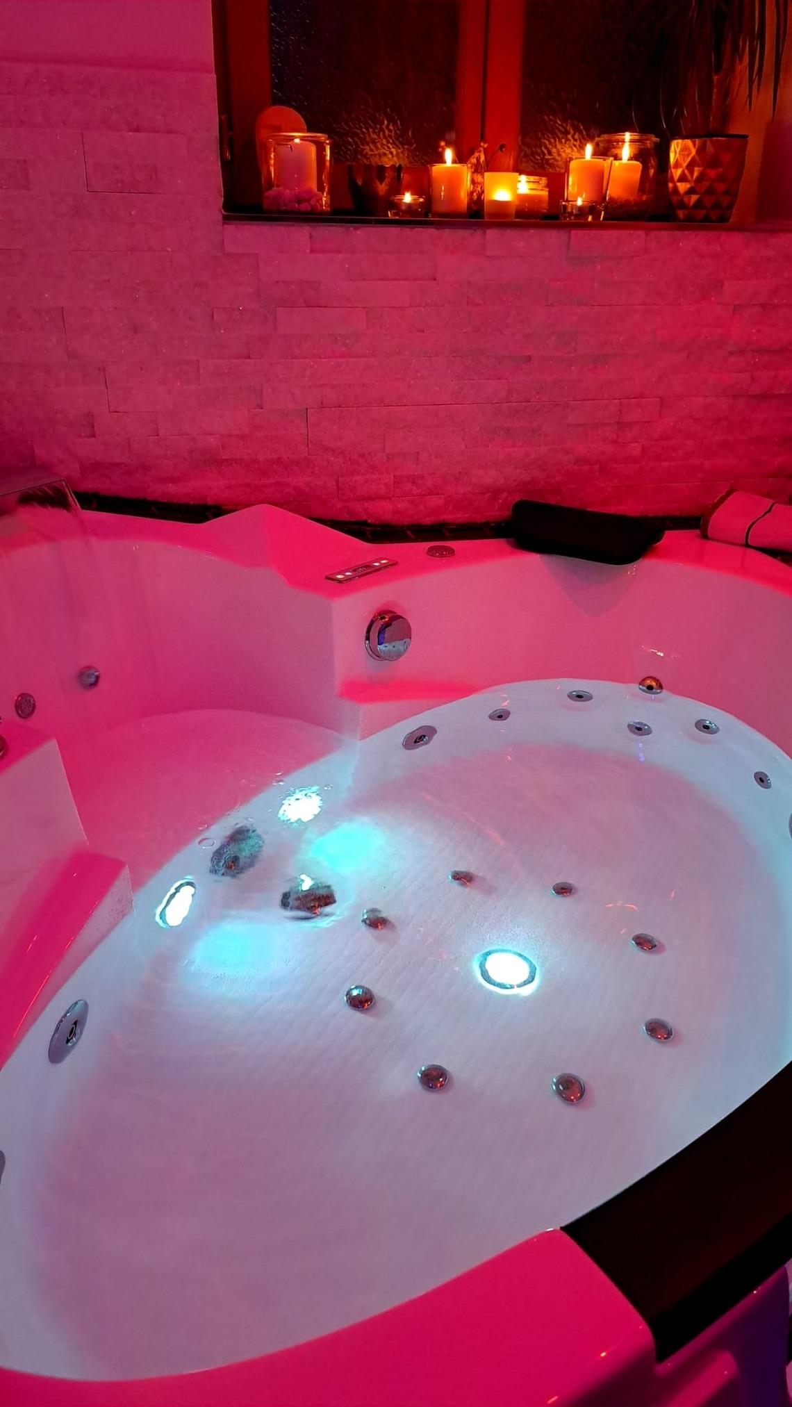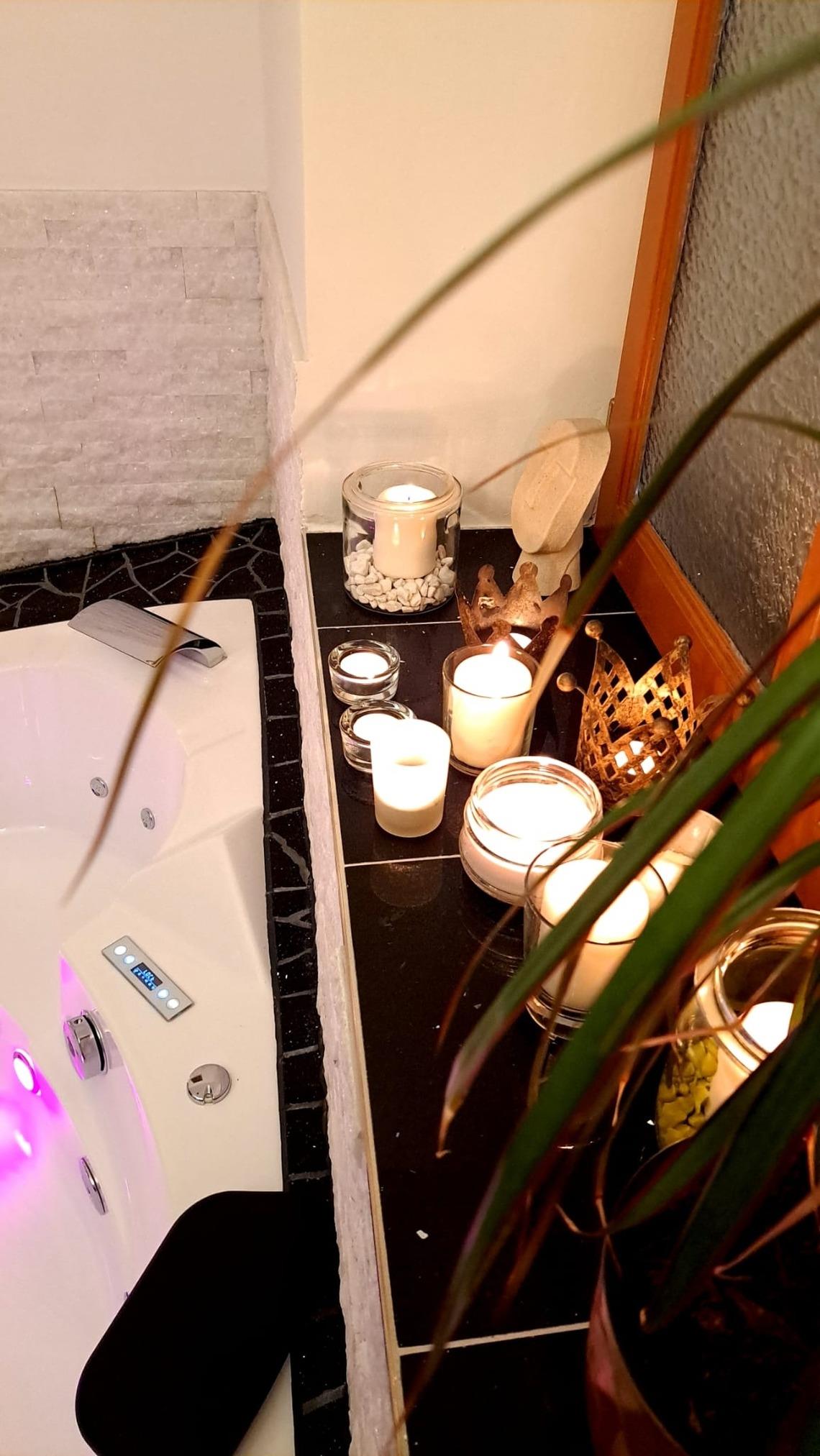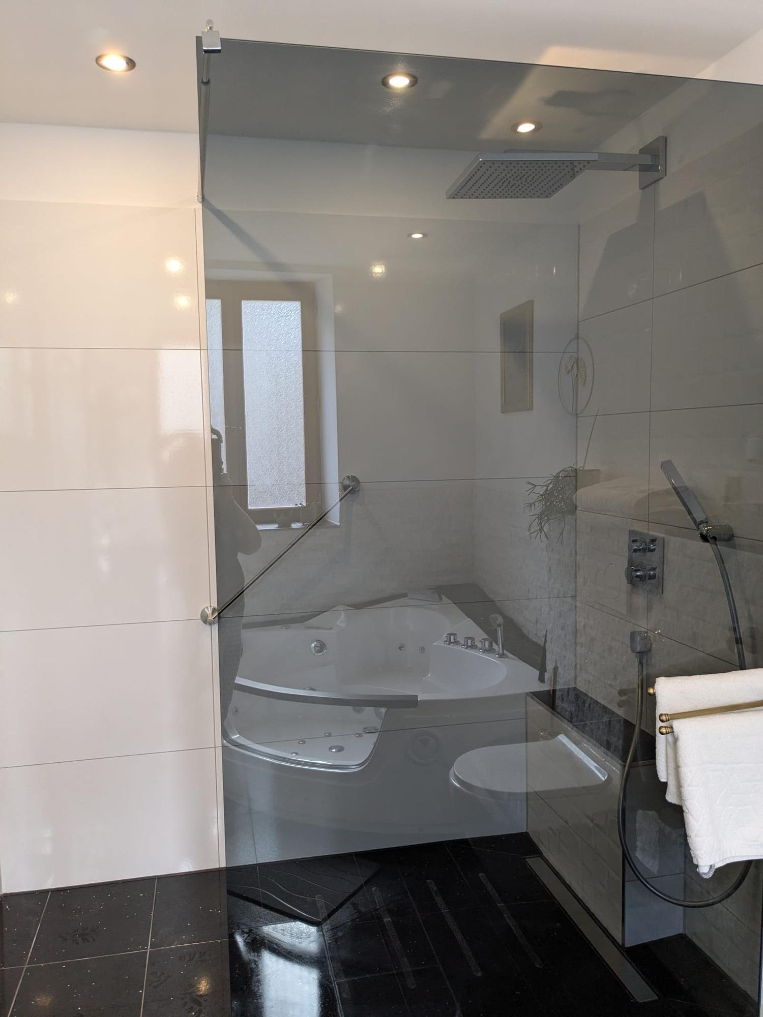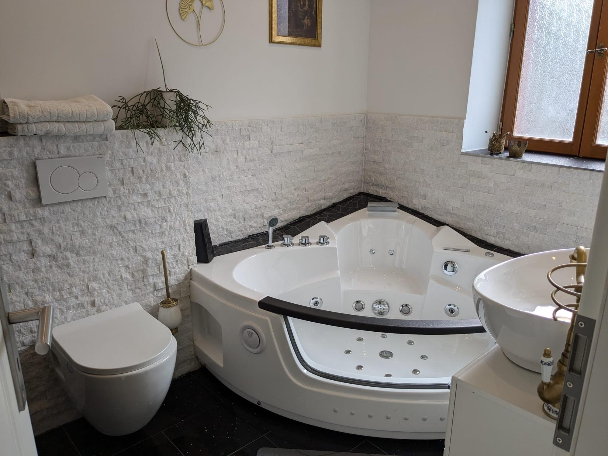 Einrichtung. Genießen Sie schöne romantische Momente zu zweit in der Wellnessbadewanne mit Whirlpool oder gönnen sie sich eine entspannte Dusche mit Dampf und Massage.
