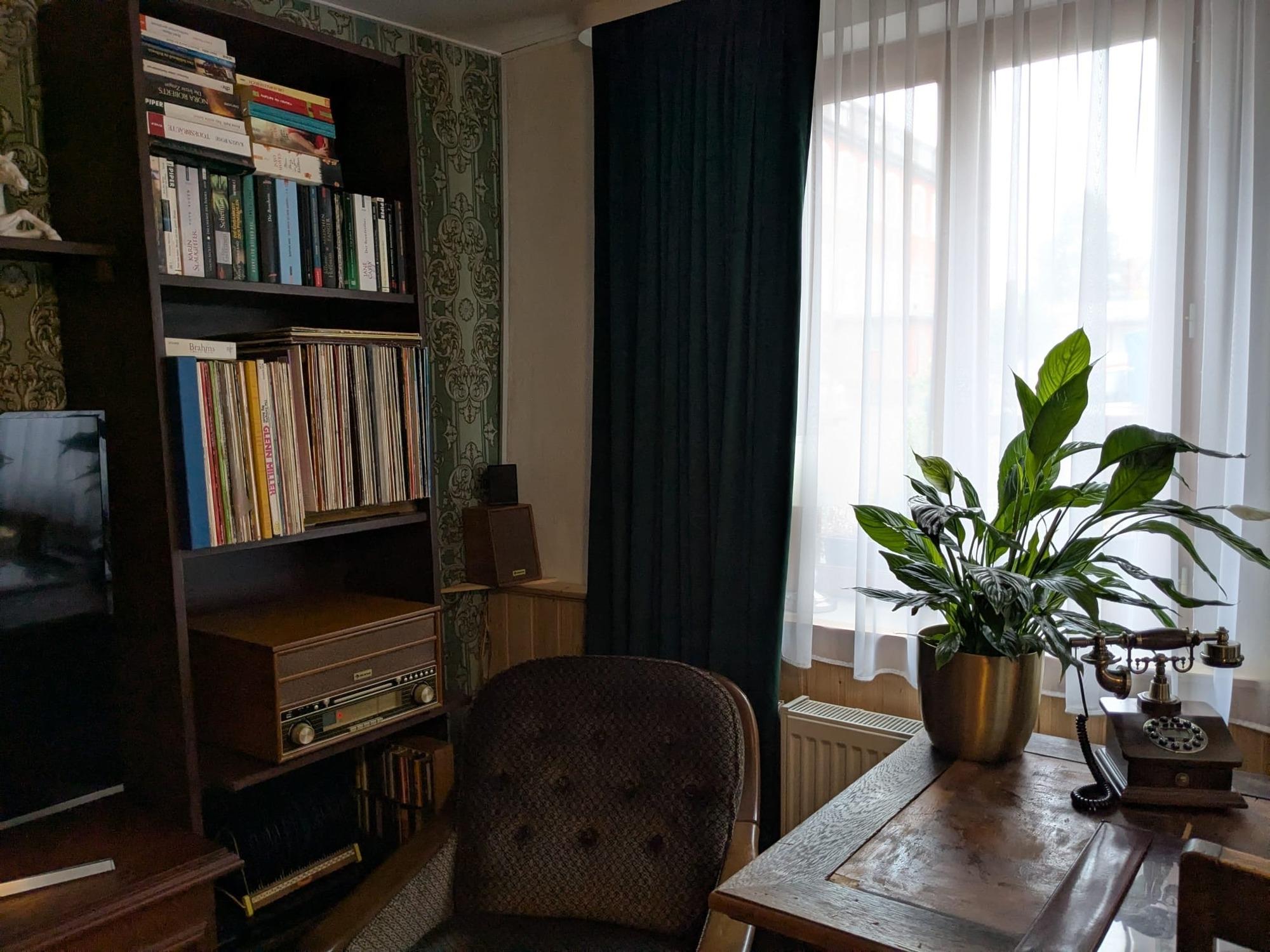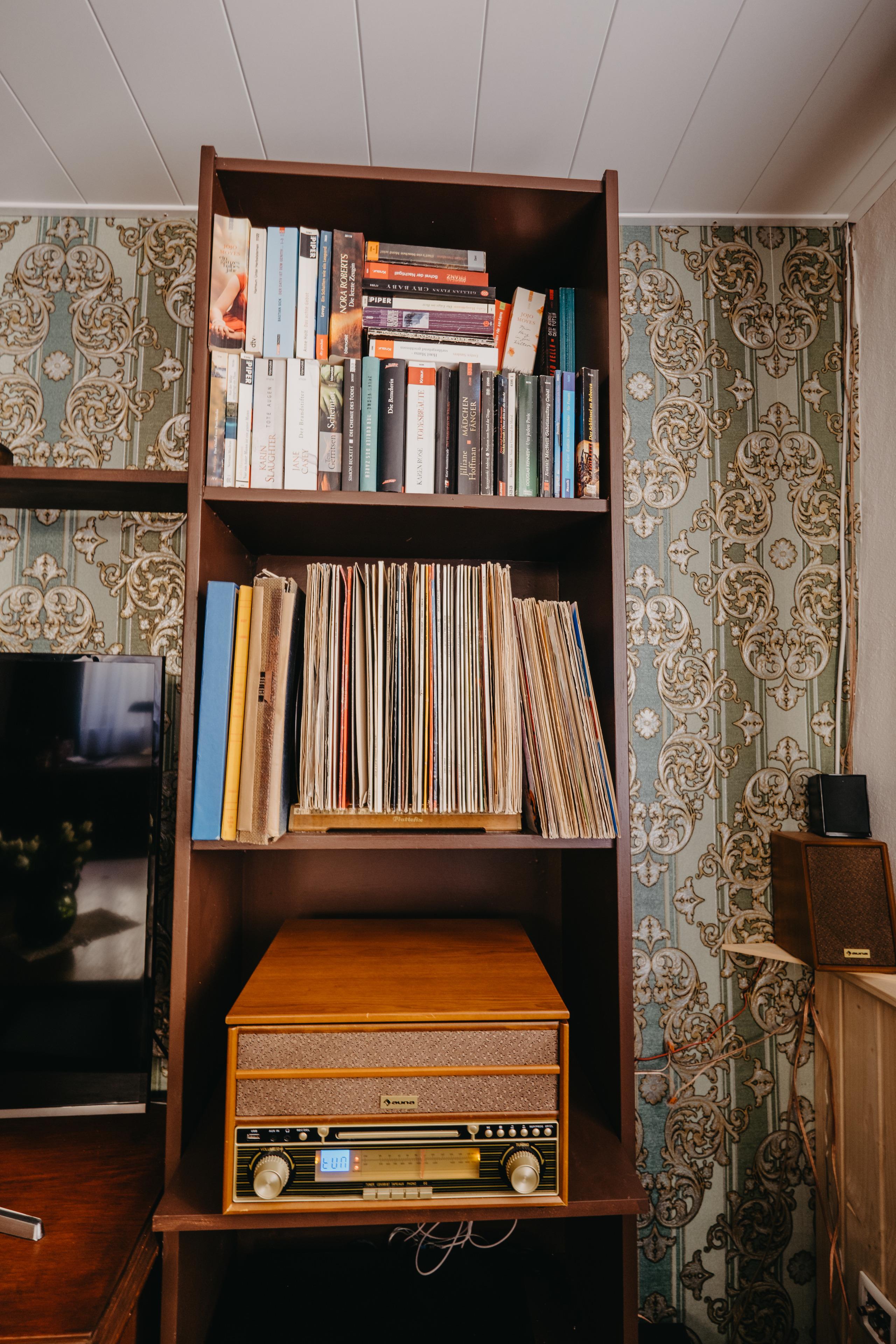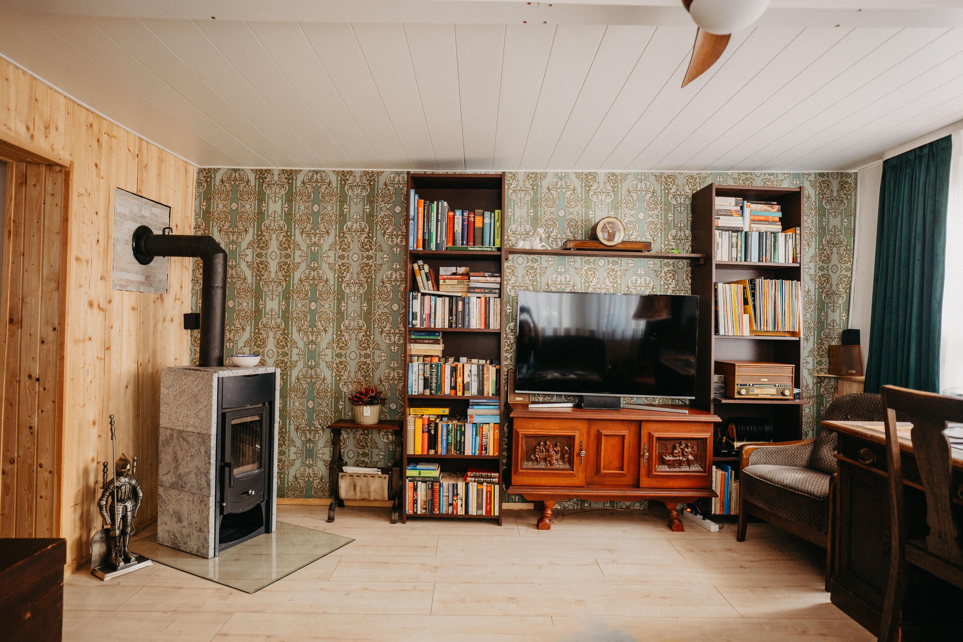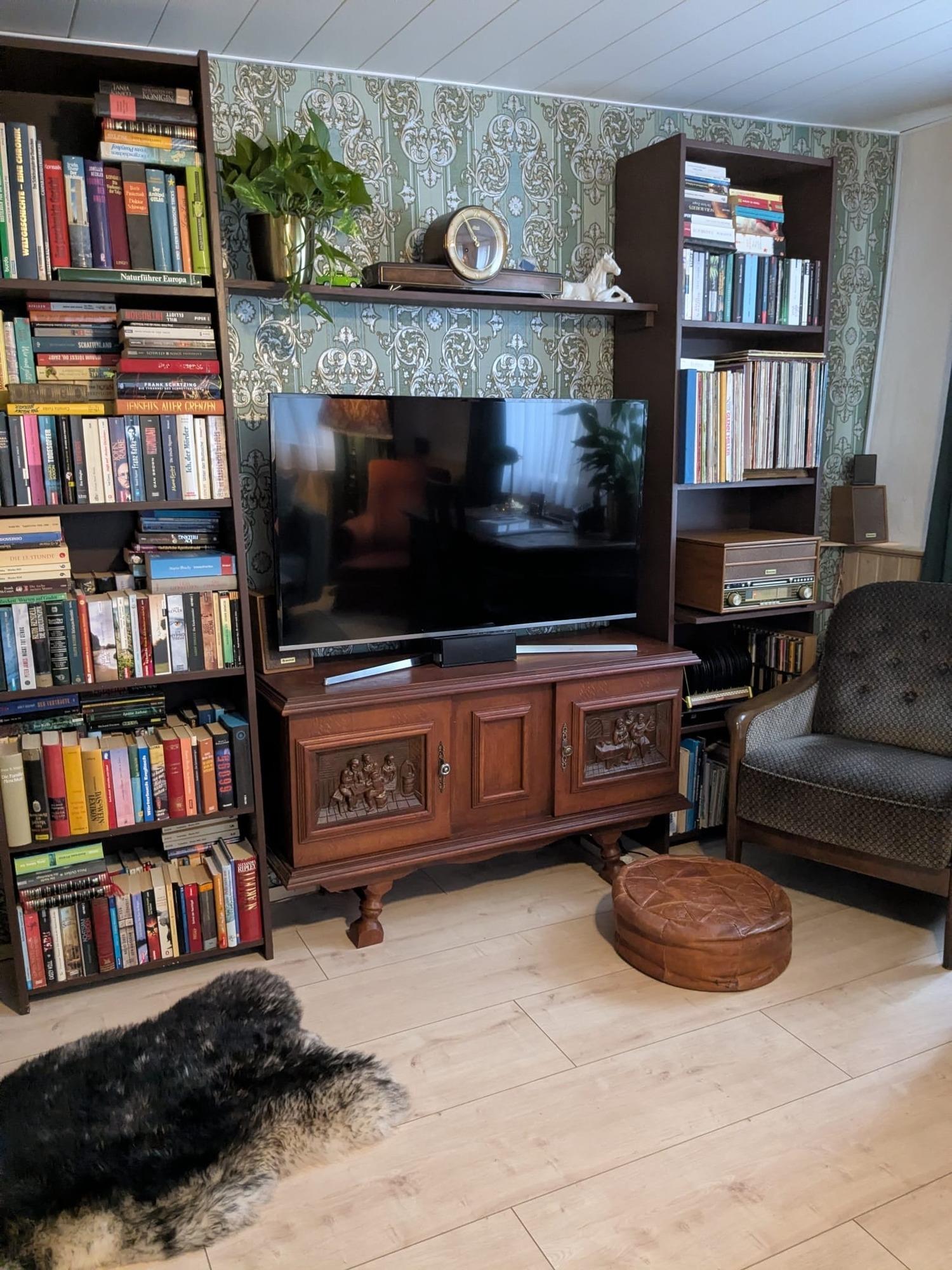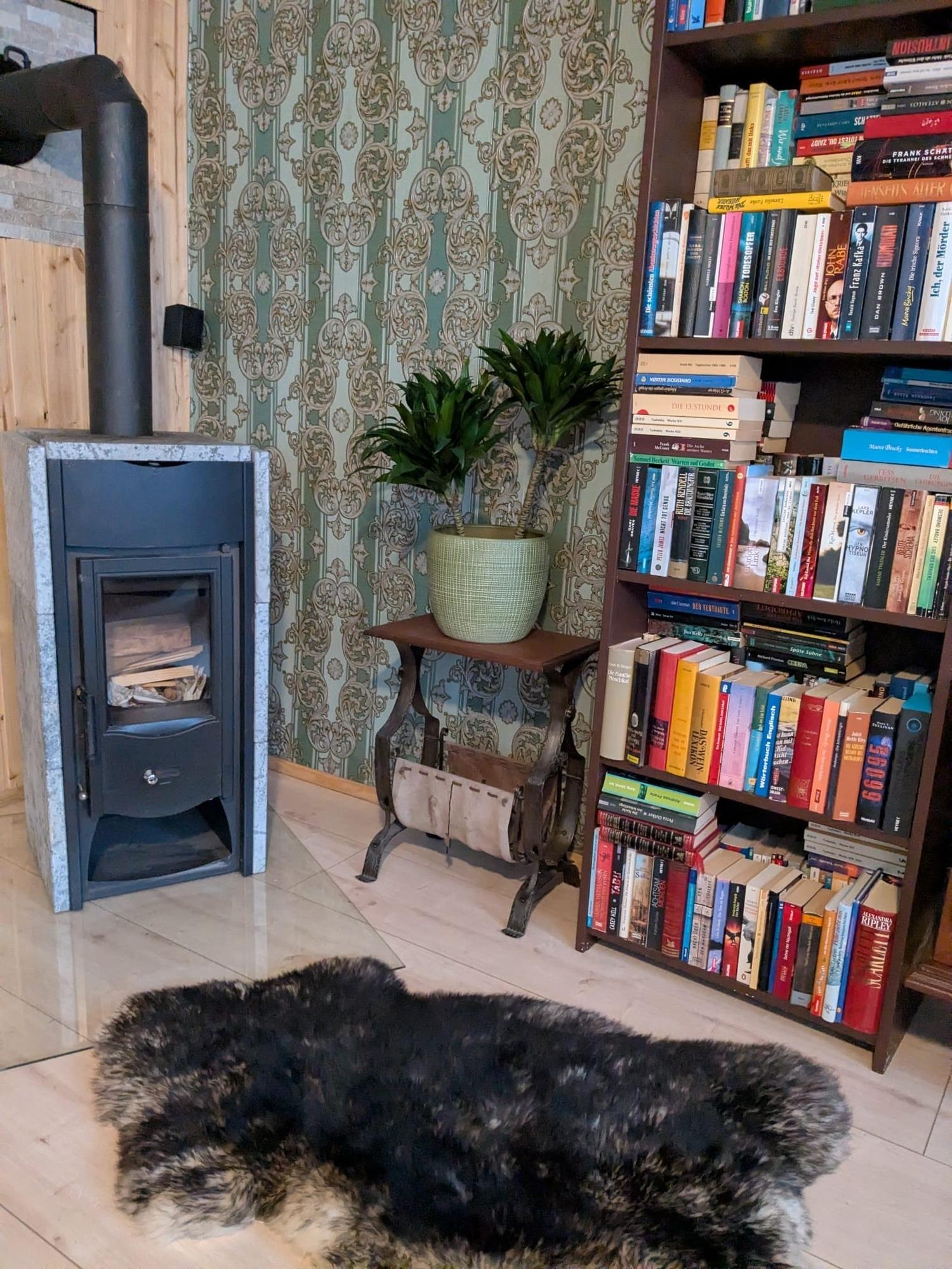 Der Wohnbereich mit gemütliche Couch und Leseecke lädt zum Verweilen ein. Zur Unterhaltung steht eine gut ausgestattete Bibliothek, Flachbildfernseher, DVD-Player sowie einen Plattenspieler mit Schallplatten, Radio mit CD und USB zu Verfügung.