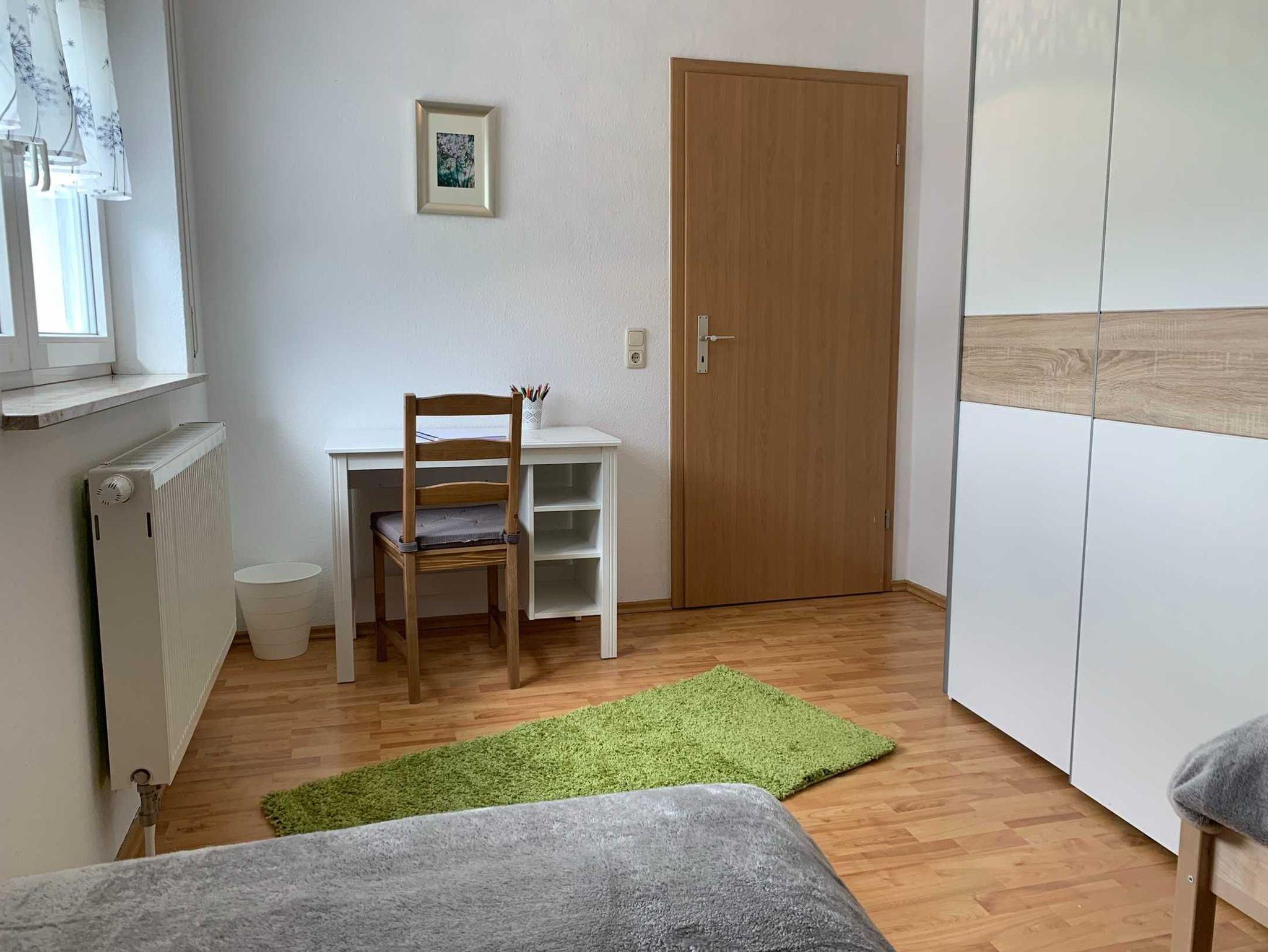 2 Einzelbetten 90 x 200 m , einen Kleiderschrank sowie ein Schreibtisch mit Stuhl . Auf Wunsch kann ein Reisebett für