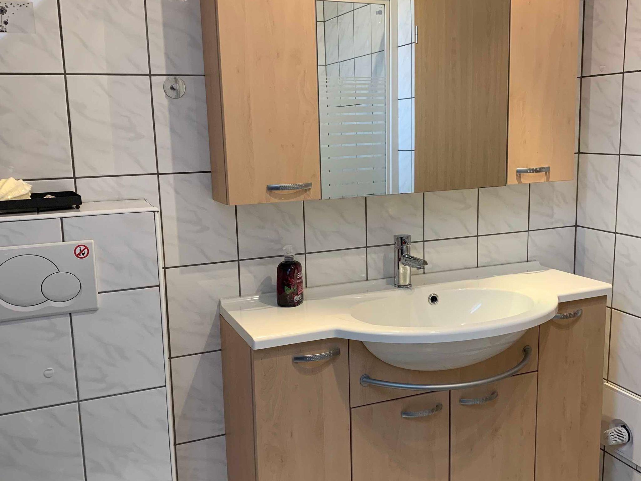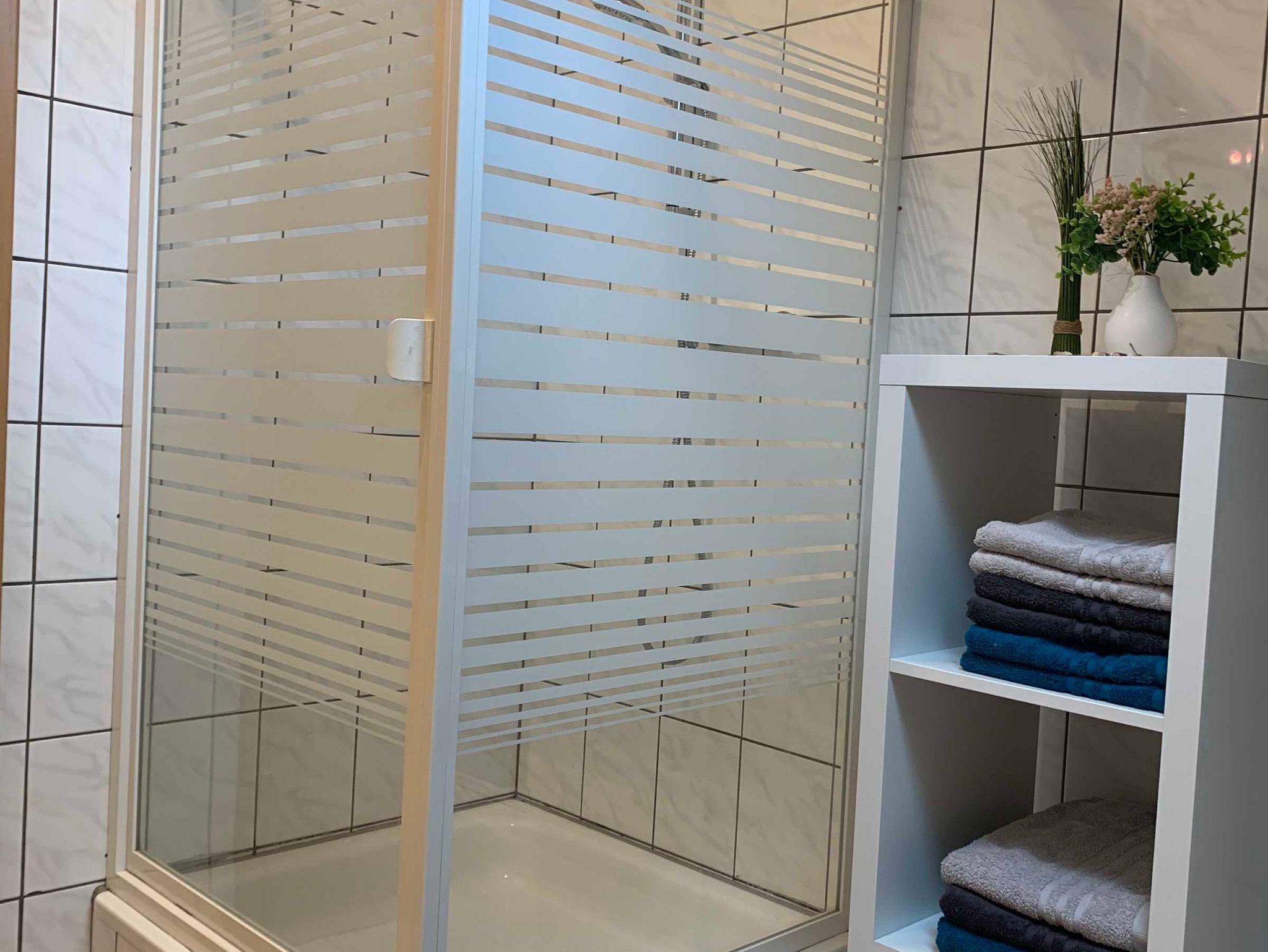 Das Badezimmer verfügt über eine Dusche/WC und Fön.