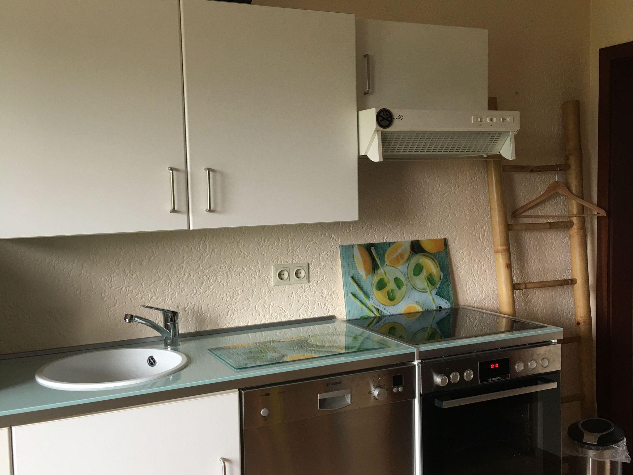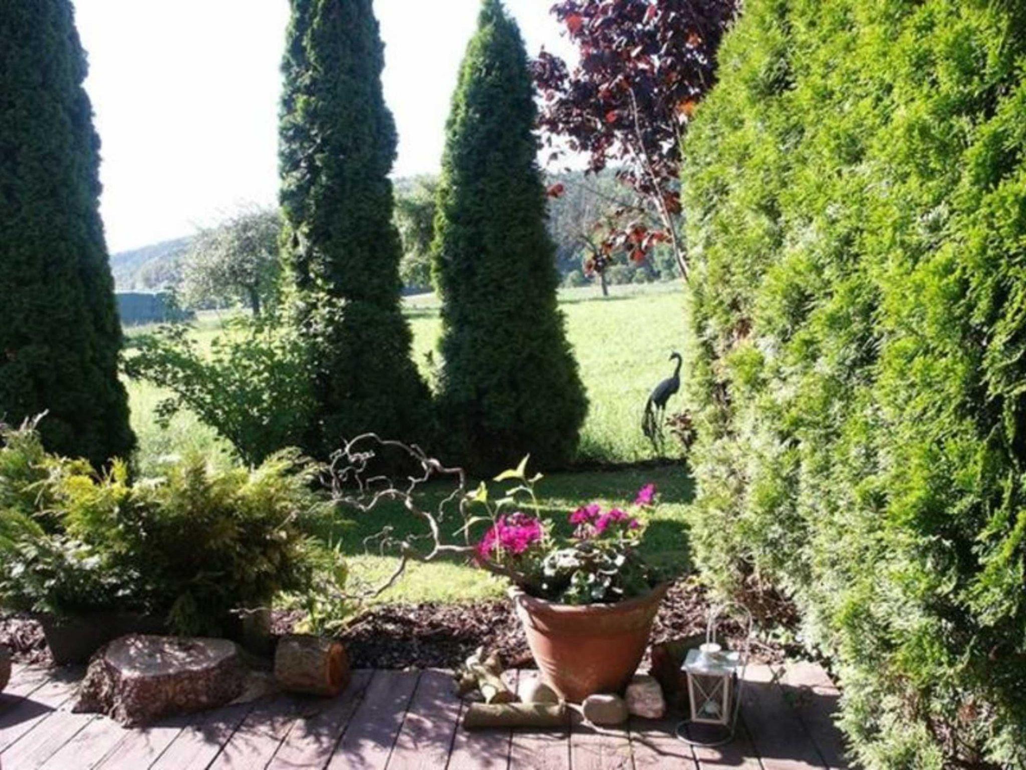 Die Wohnung ist komplett mit Parkettboden ausgelegt und gut ausgestattet. Vom Wohnraum gelangt man direkt zur Sonnenterrasse und zum Garten, in dem man sehr schön sitzen und den unverbauten Blick genießen kann. Hier kann man schon in der warmen Frühlingssonne angenehm draußen frühstücken. Die Wohnung hat ein separates Schlafzimmer mit einem komfortablen Bett. Die Gartenmöbel sind teilweise aus Teak und neben 2 Liegen gibt es einen Tisch und 2 Stühle.