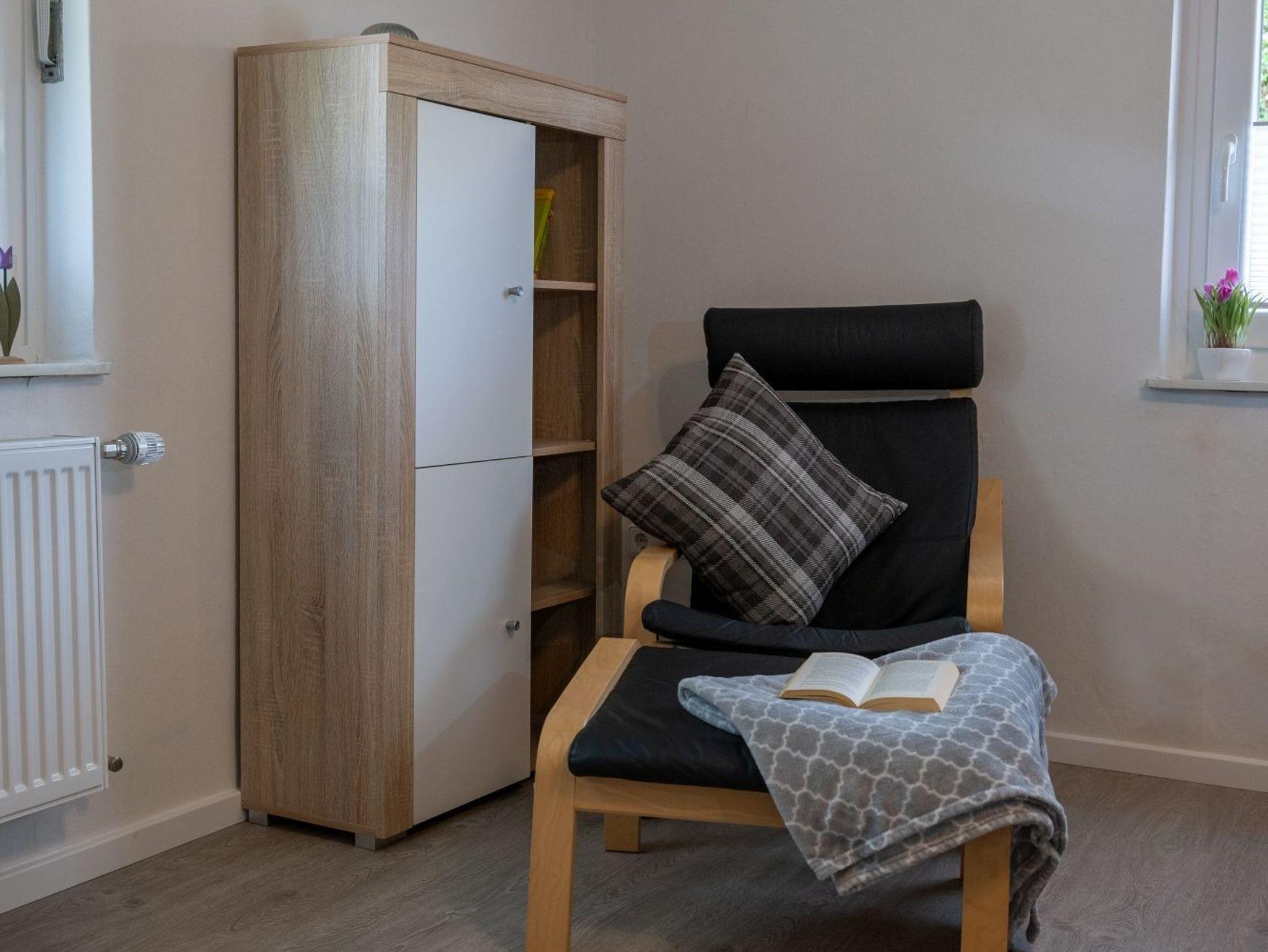 Im geräumigen Wohnzimmer mit Fernseher, Sat-Anschluss, Couch und Tisch stehen gemütlichen Spiele-Abenden nichts mehr im Wege. Auch eine große Brettspiele-Sammlung ist Teil der Einrichtung. Die große Couch kann zu dem noch als zusätzlicher Schlafplatz genutzt werden.