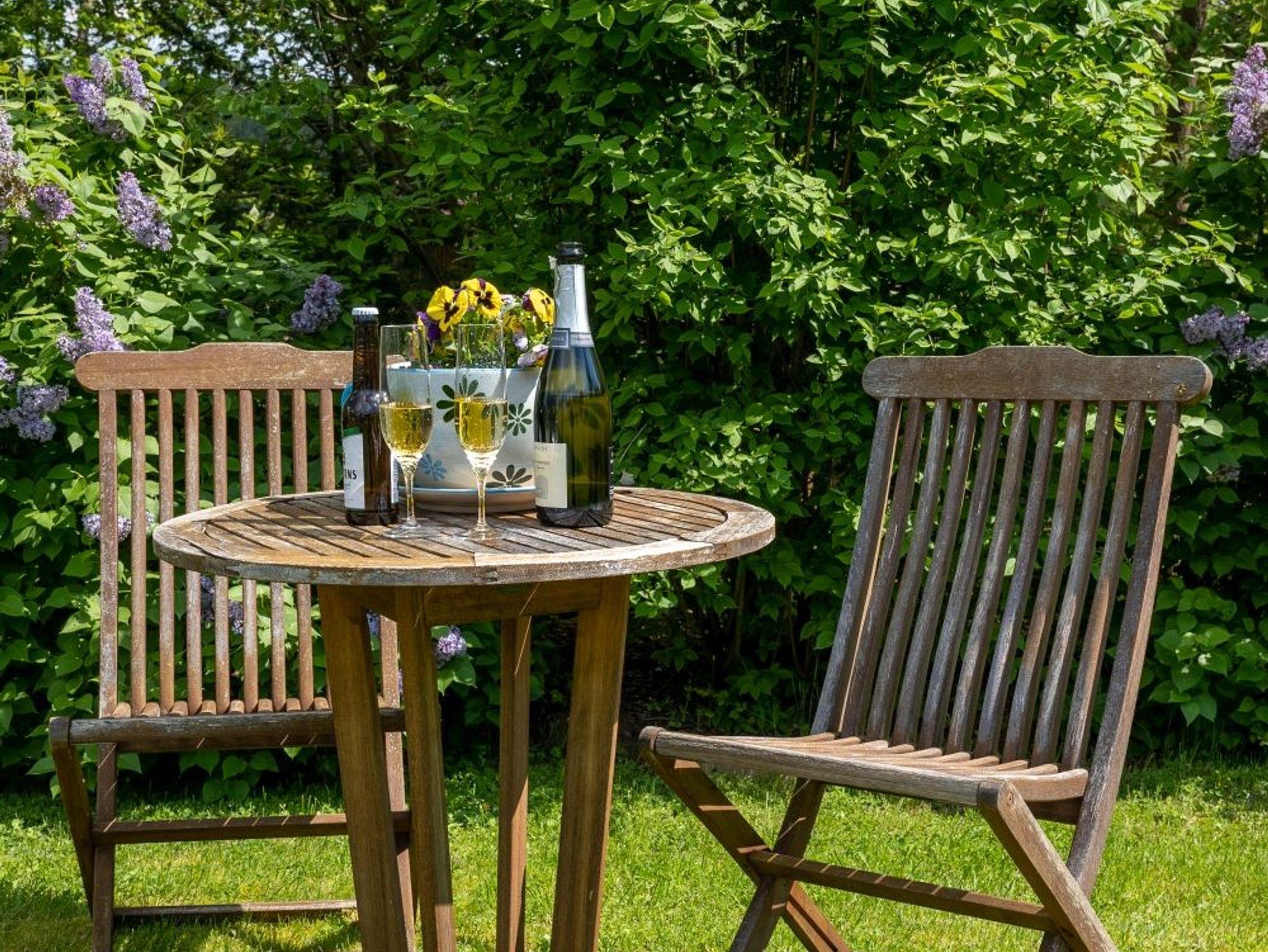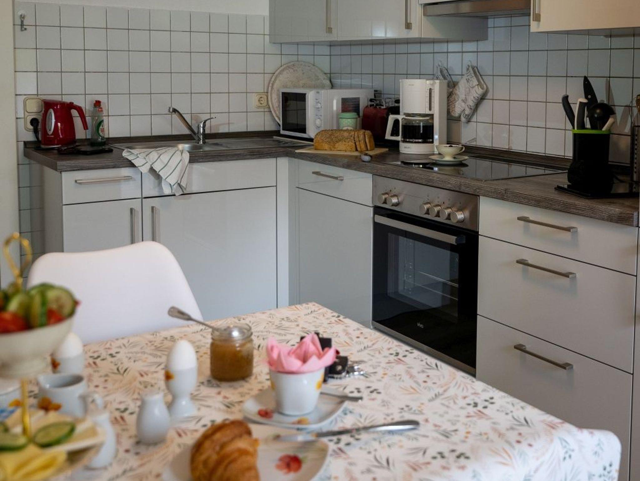 Die Küche mit Anrichte und Essbereich ist zusätzlich mit einem Ceranfeld, einem Backofen, einem Kühlschrank und einer Spüle sowie einer Spülmaschine ausgestattet. Mit Toaster, Kaffeemaschine, Wasserkocher und einem umfangreichen Teller-, Tassen-, Besteck- und Service-Set fehlt es Ihnen an nichts. Durch eine Terrassen-Tür besteht über die Küche ein Zugang in den Gartenbereich.