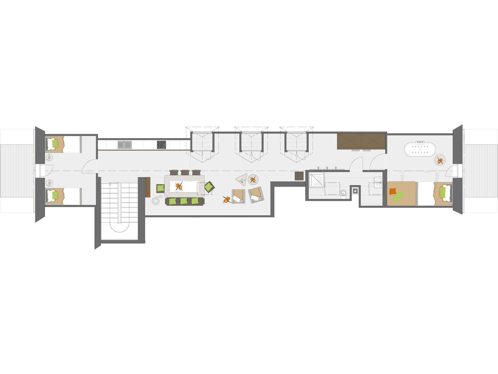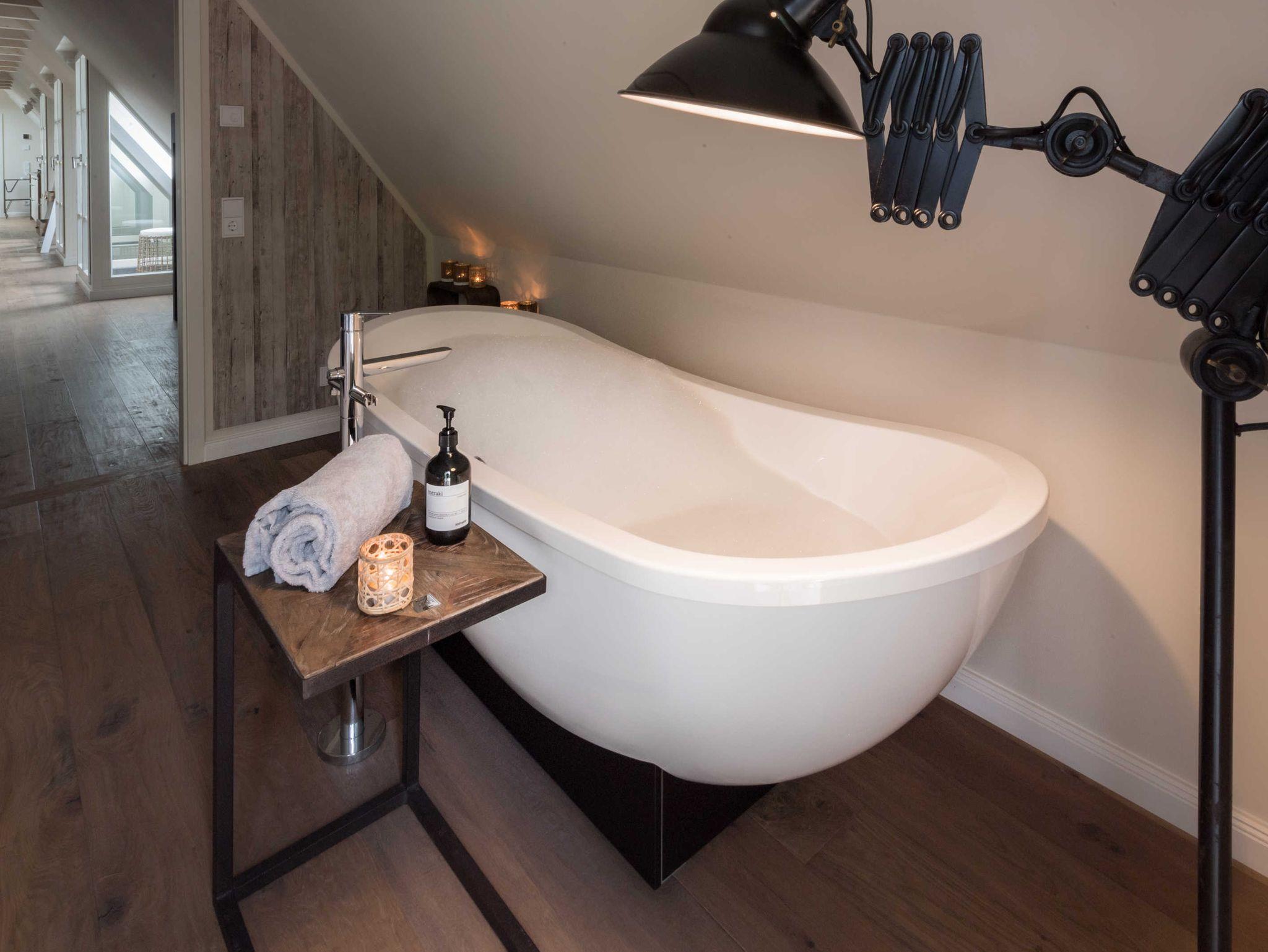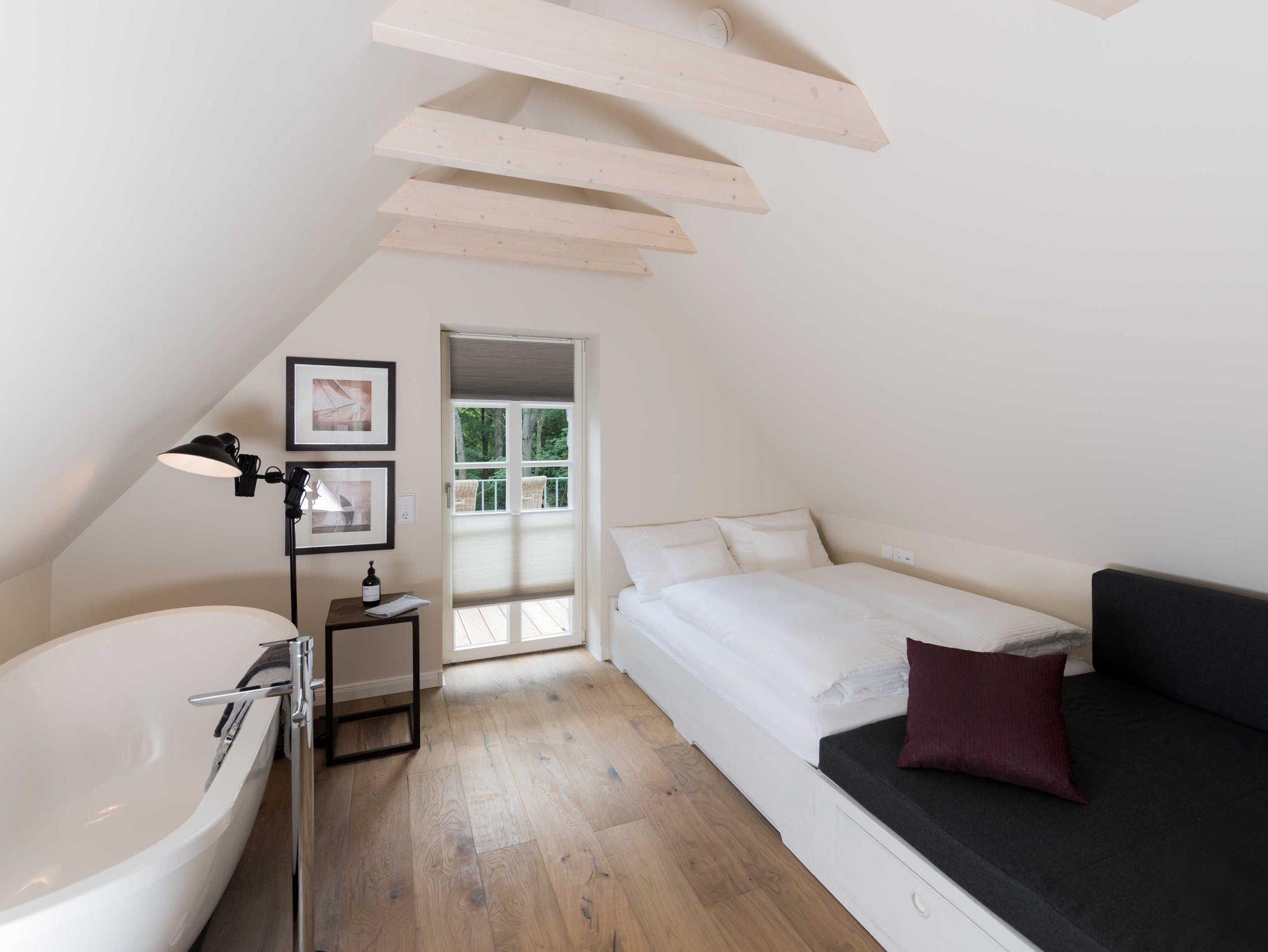 In zwei separaten Schlafzimmern finden insgesamt vier Personen Platz. Ein Schlafzimmer wartet mit zwei Einzel-Boxspringbetten auf. Im anderen Schlafzimmer kann man sich über eine freistehende Badewanne freuen - romantische Stunden in dem 1,40 Meter breiten Boxspringbett mit anschließendem Liegeplatz sind hier inklusive. Von beiden Schlafzimmern haben Sie Zugang auf je einen eigenen Holzbalkon.
