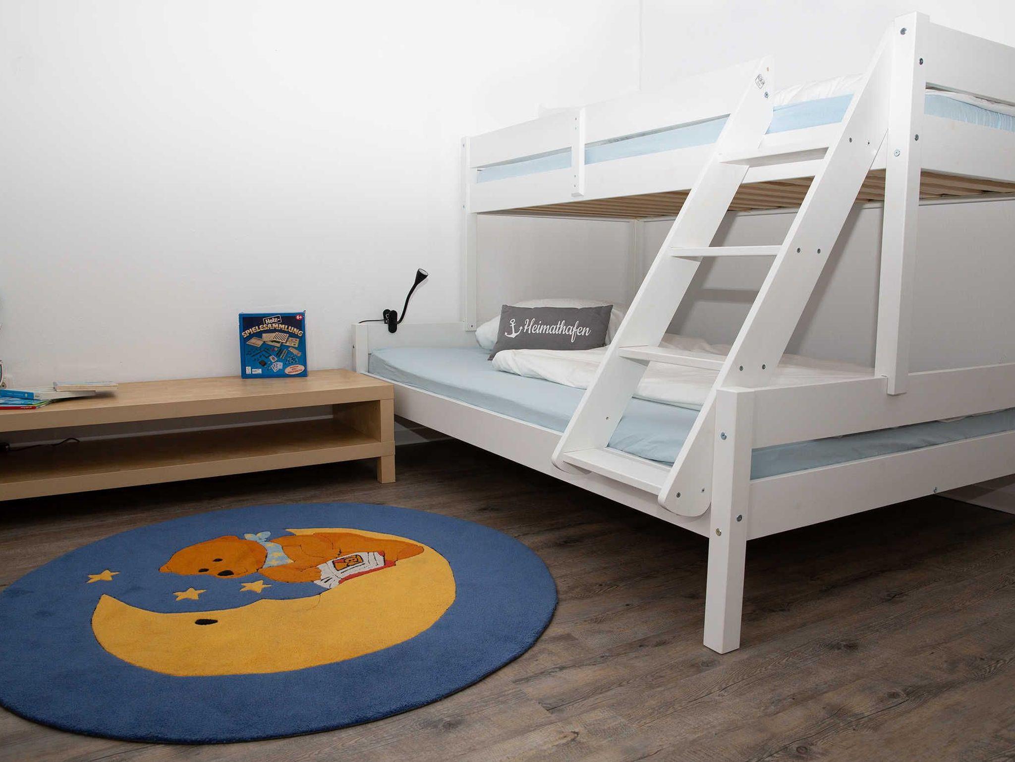 ? Ein Schlafzimmer mit einem Hochbett, das oben eine Liegefläche von 90x200 cm und unten 140x200 cm besitzt