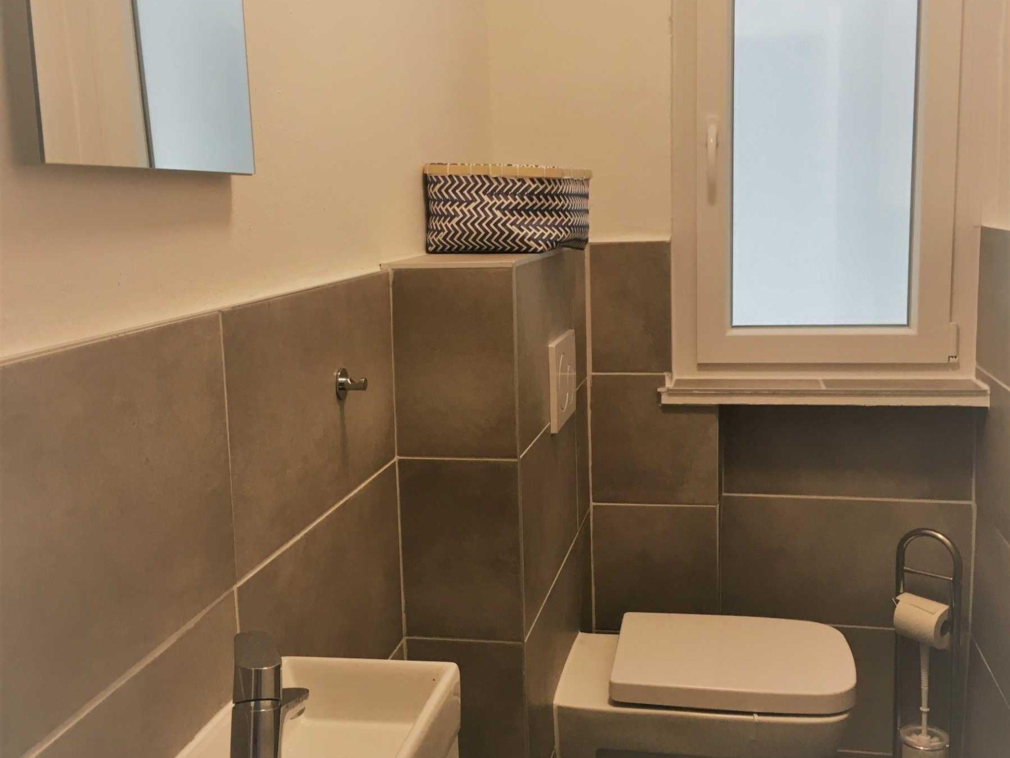 ? Das WC ist getrennt vom Dusch-Bad angeordnet und verfügt ebenfalls über ein kleines Waschbecken und Ablagemöglichkeiten