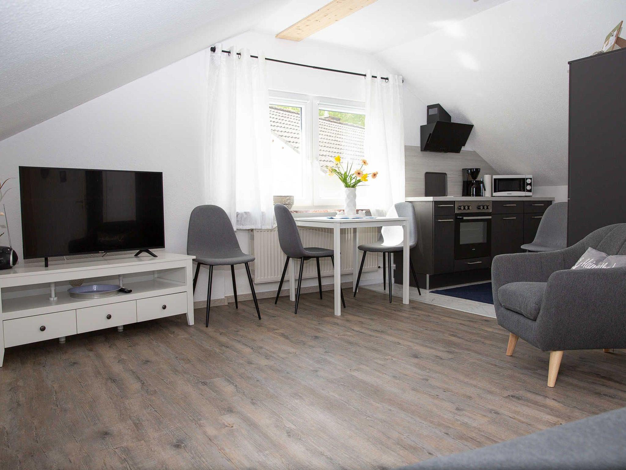 Die allergikerfreundliche Nichtraucher-Wohnung umfasst einen gemütlichen Wohn- und Essbereich mit direktem Zugang zur gut ausgestatteten Küchenzeile mit Geschirrspülmaschine.