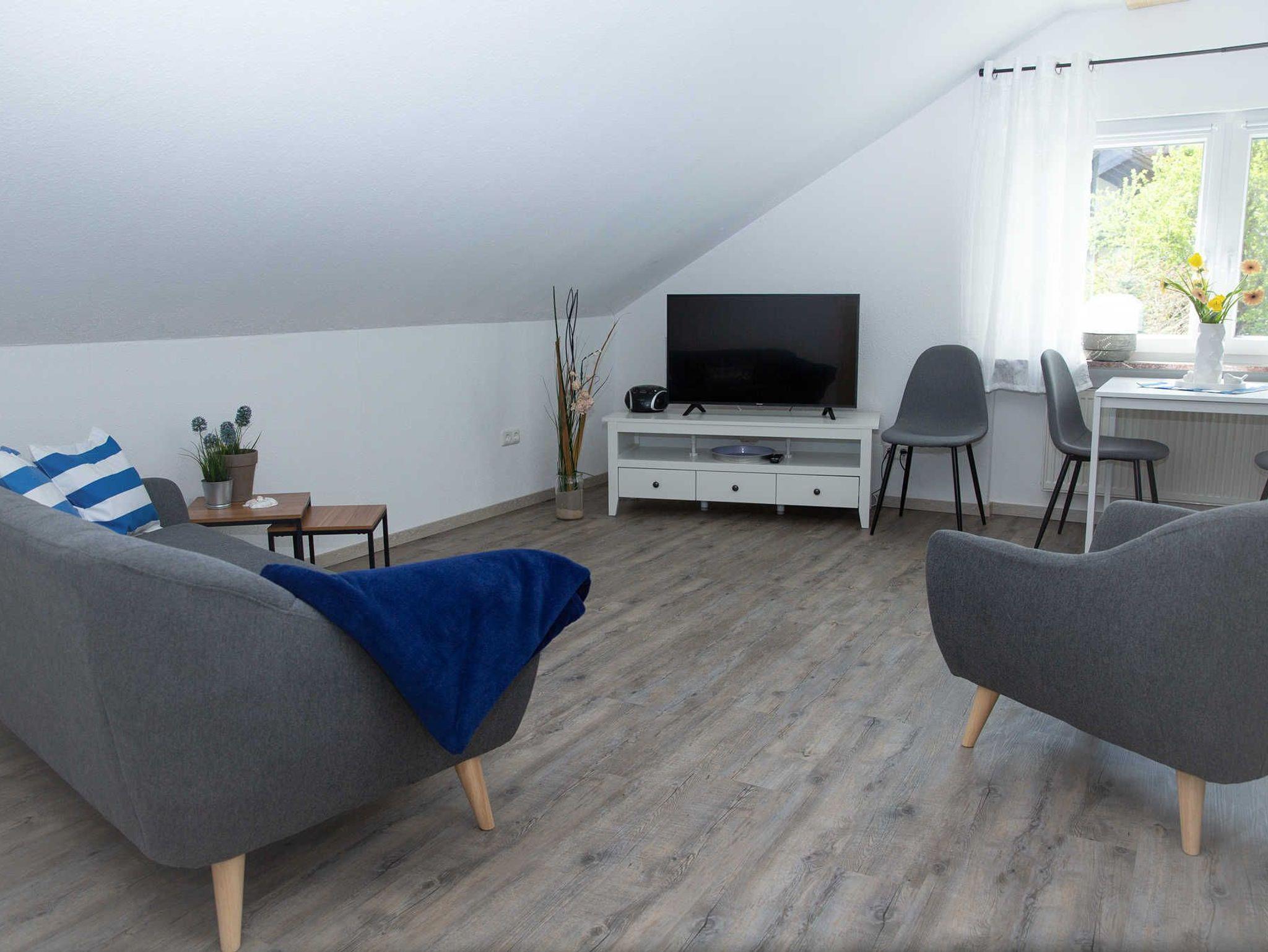 Unsere 55 qm große Ferienwohnung „Nord“ befindet sich im Dachgeschoss unseres Ferienhauses „Heimathafen“. Die allergikerfreundliche Nichtraucher-Wohnung umfasst einen gemütlichen Wohn- und Essbereich mit direktem Zugang zur gut ausgestatteten Küchenzeile mit Geschirrspülmaschine. Ein großer Fernseher sowie ein Radio mit CD und Bluetooth laden zum Entspannen ein.