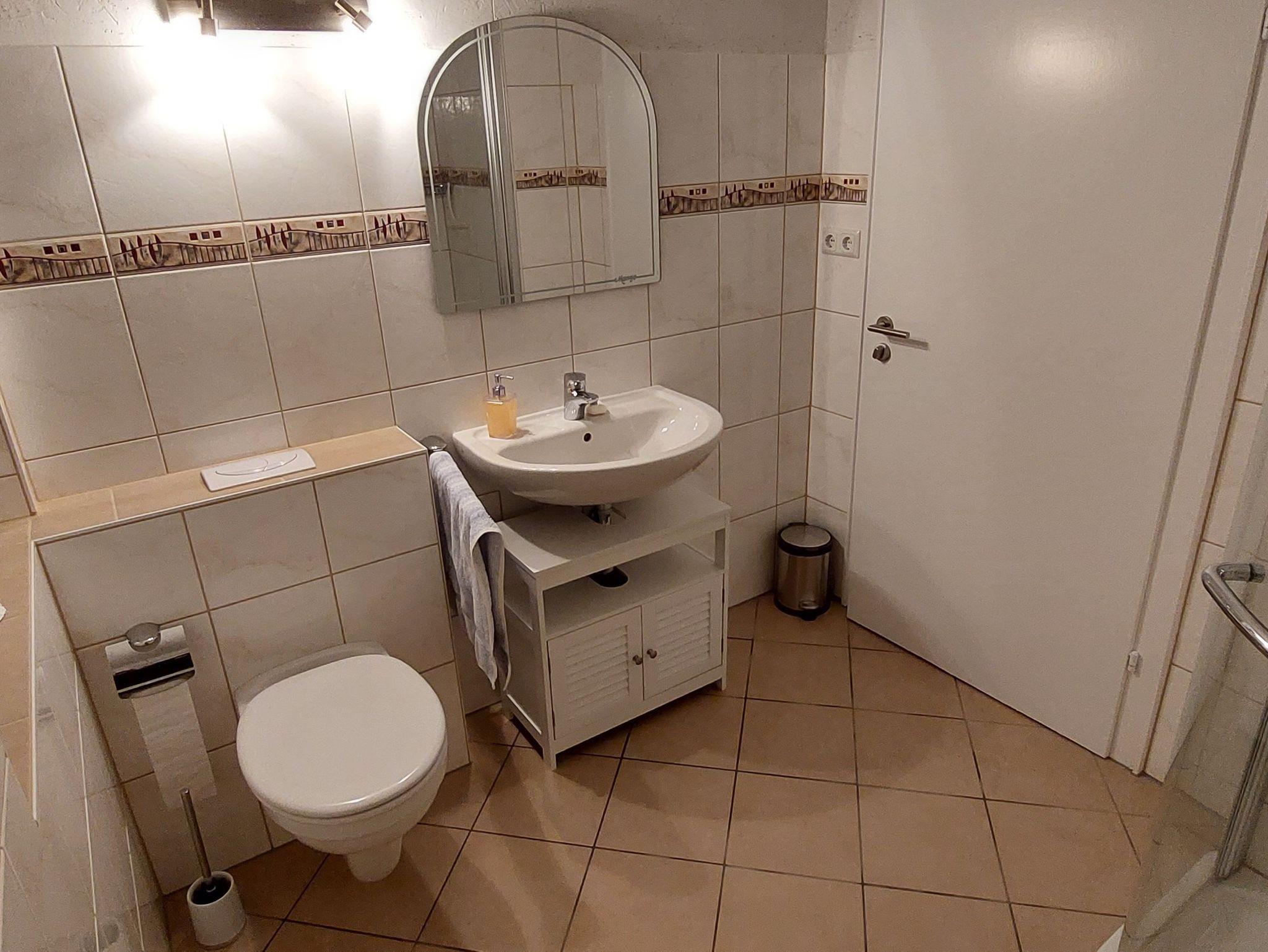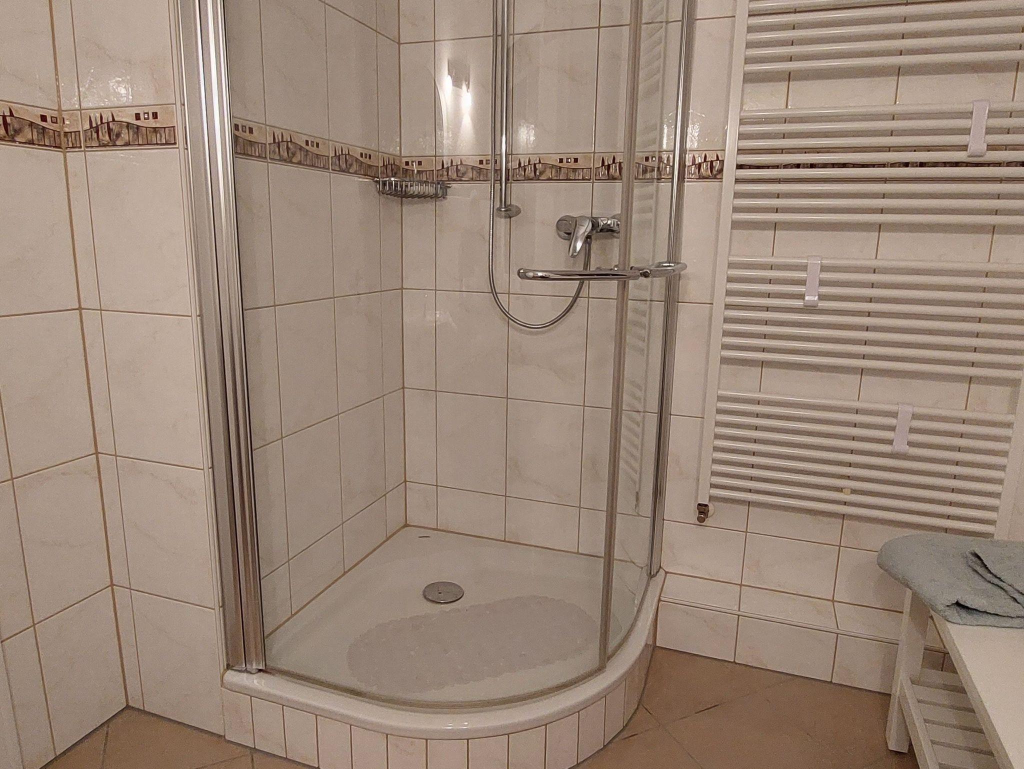 Dusche, WC, Waschbecken, Handtuchheizung, Waschbeckenunterschrank, Spiegel, Fön, Sitzbank