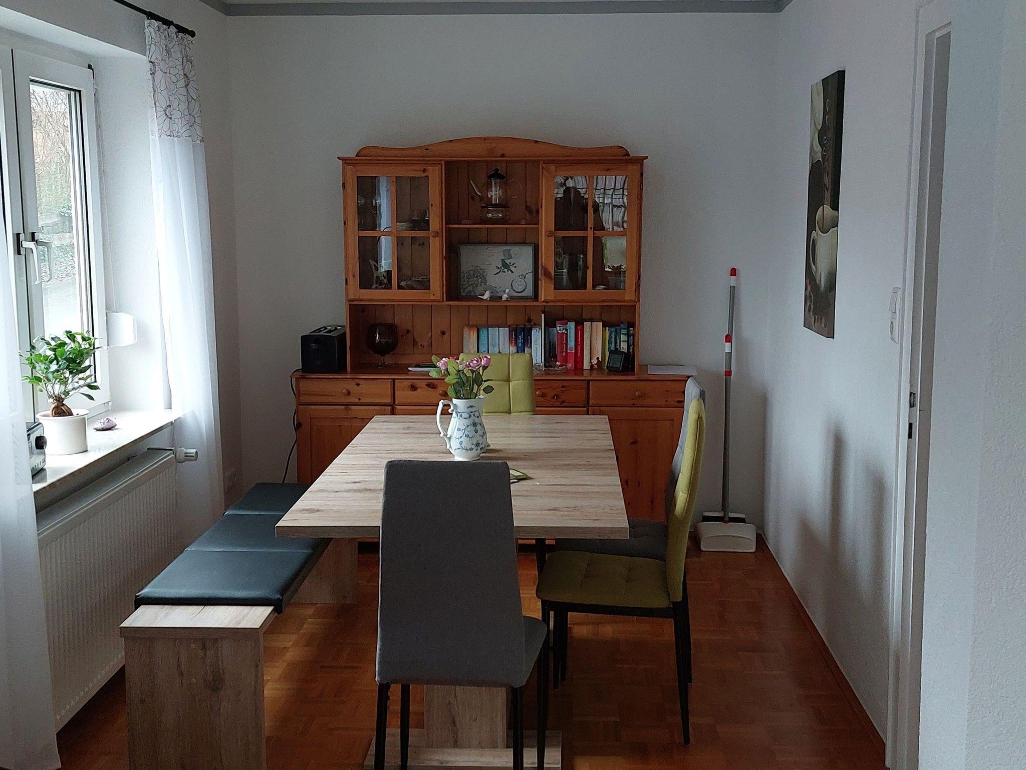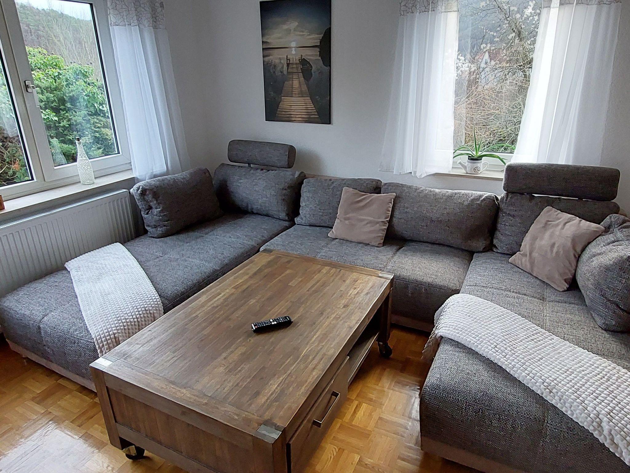 Große Couch, SAT-TV( Internetfähig), Radio, Couchtisch, Lowboard, integriertes Esszimmer mit großem Tisch, 8 Stühlen, Kinderhochstuhl und Highboard