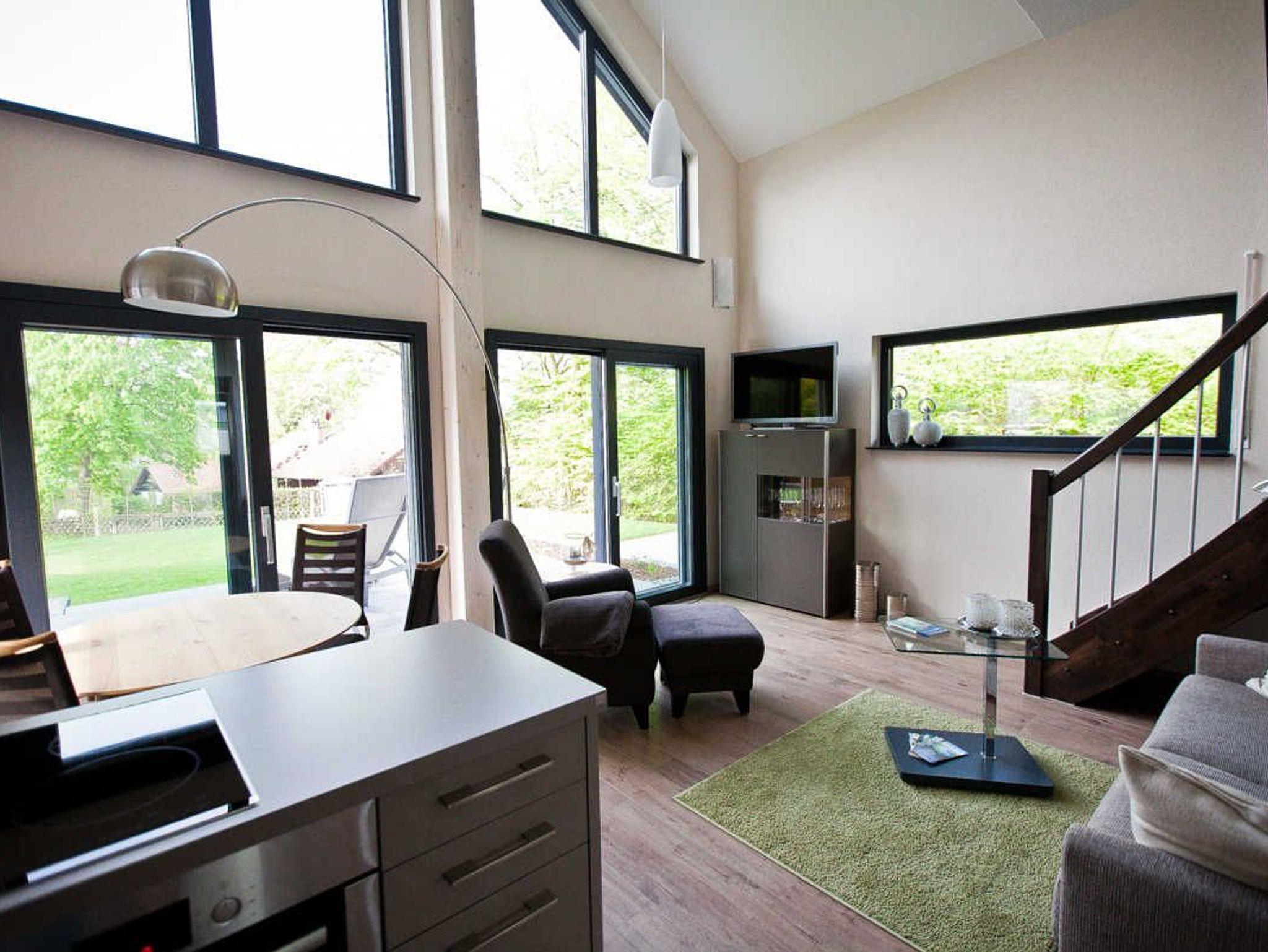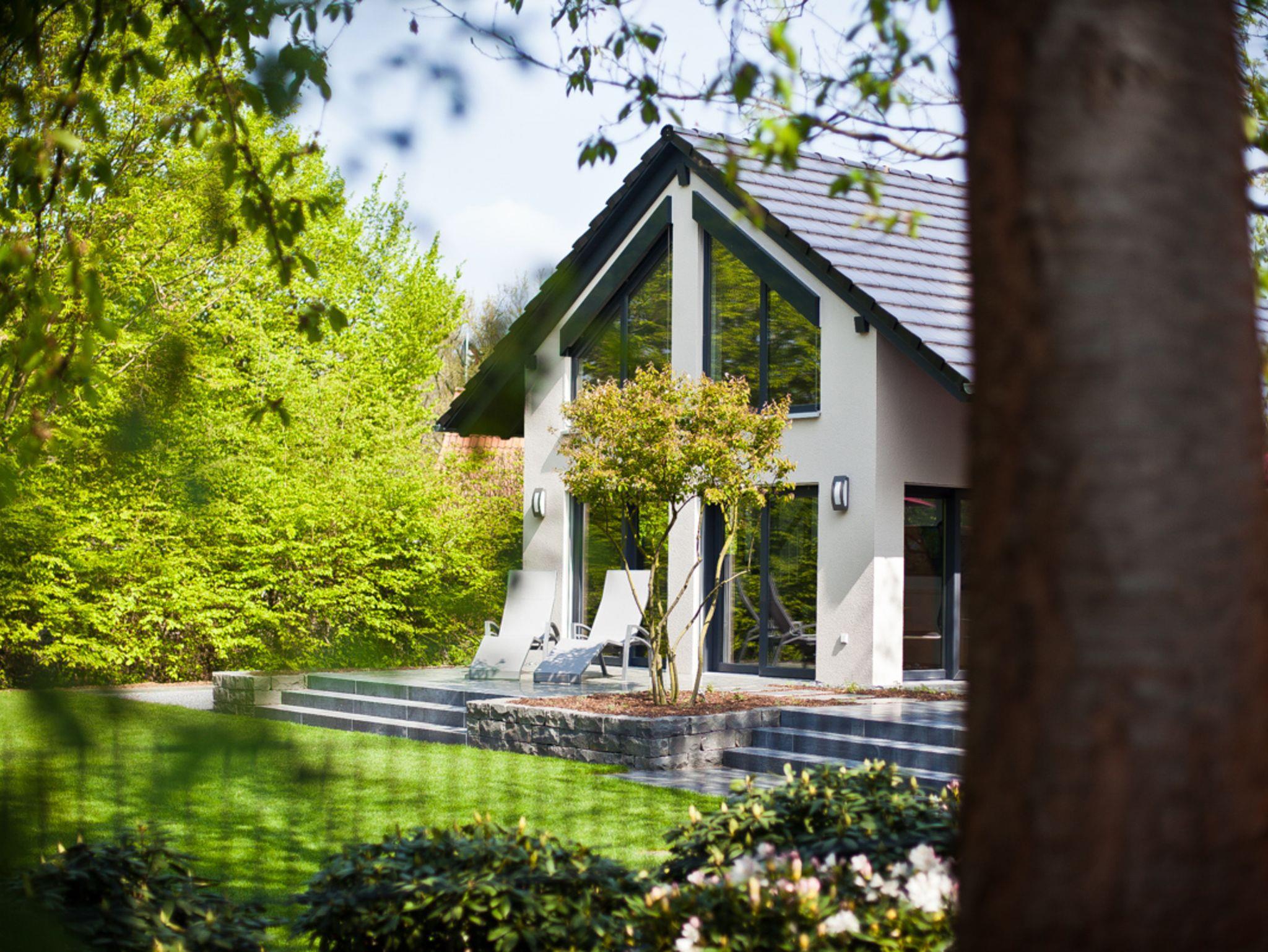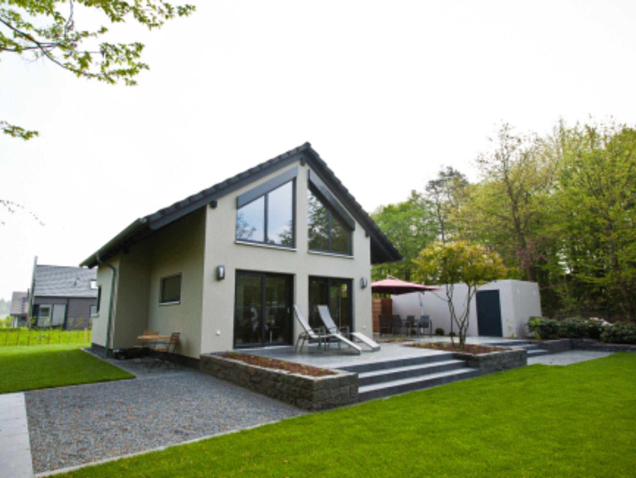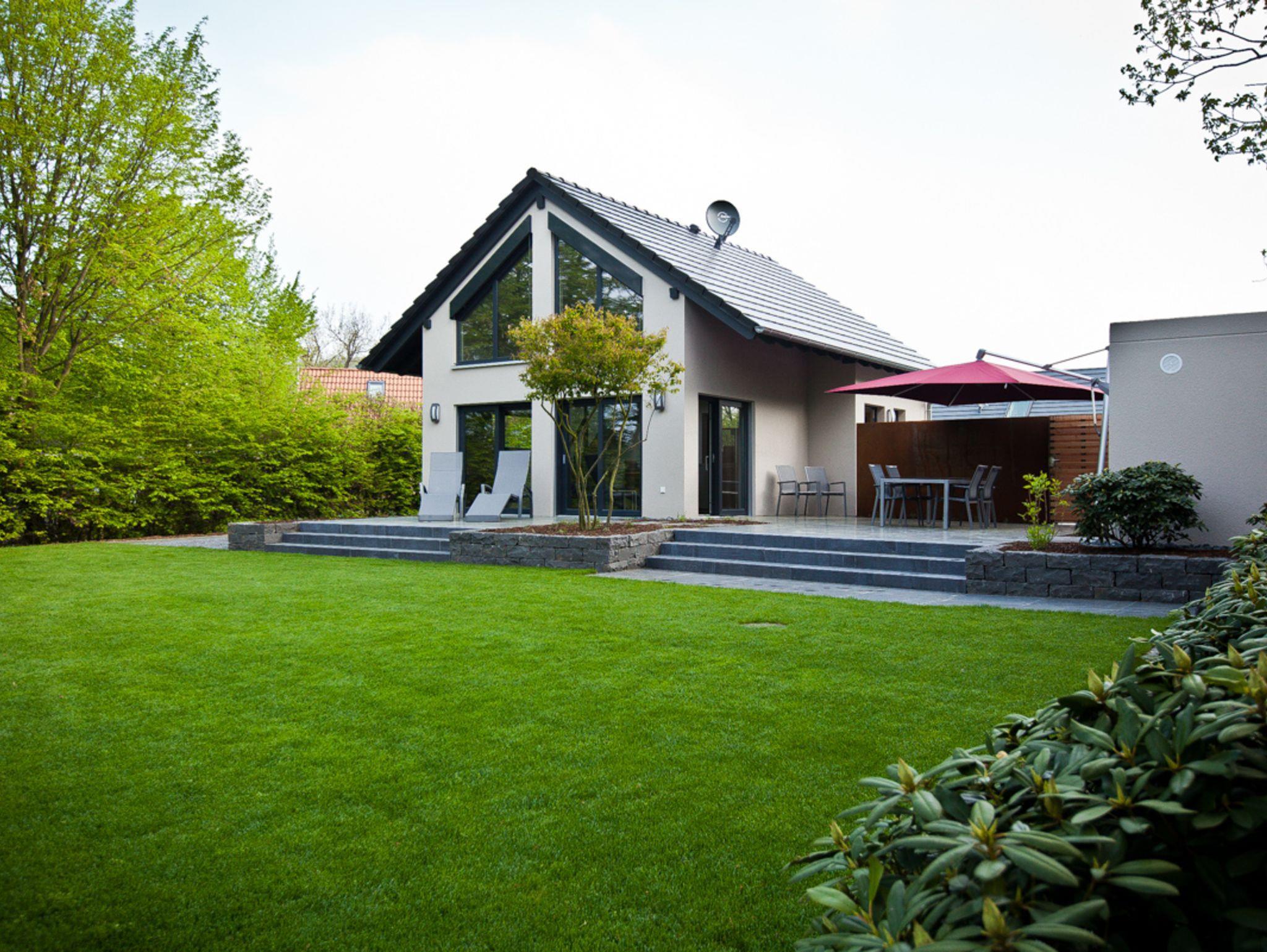 Das Ferienhaus bietet eine großzügige Außenanlage mit offener Einfriedung und einer frei stehenden Garage.