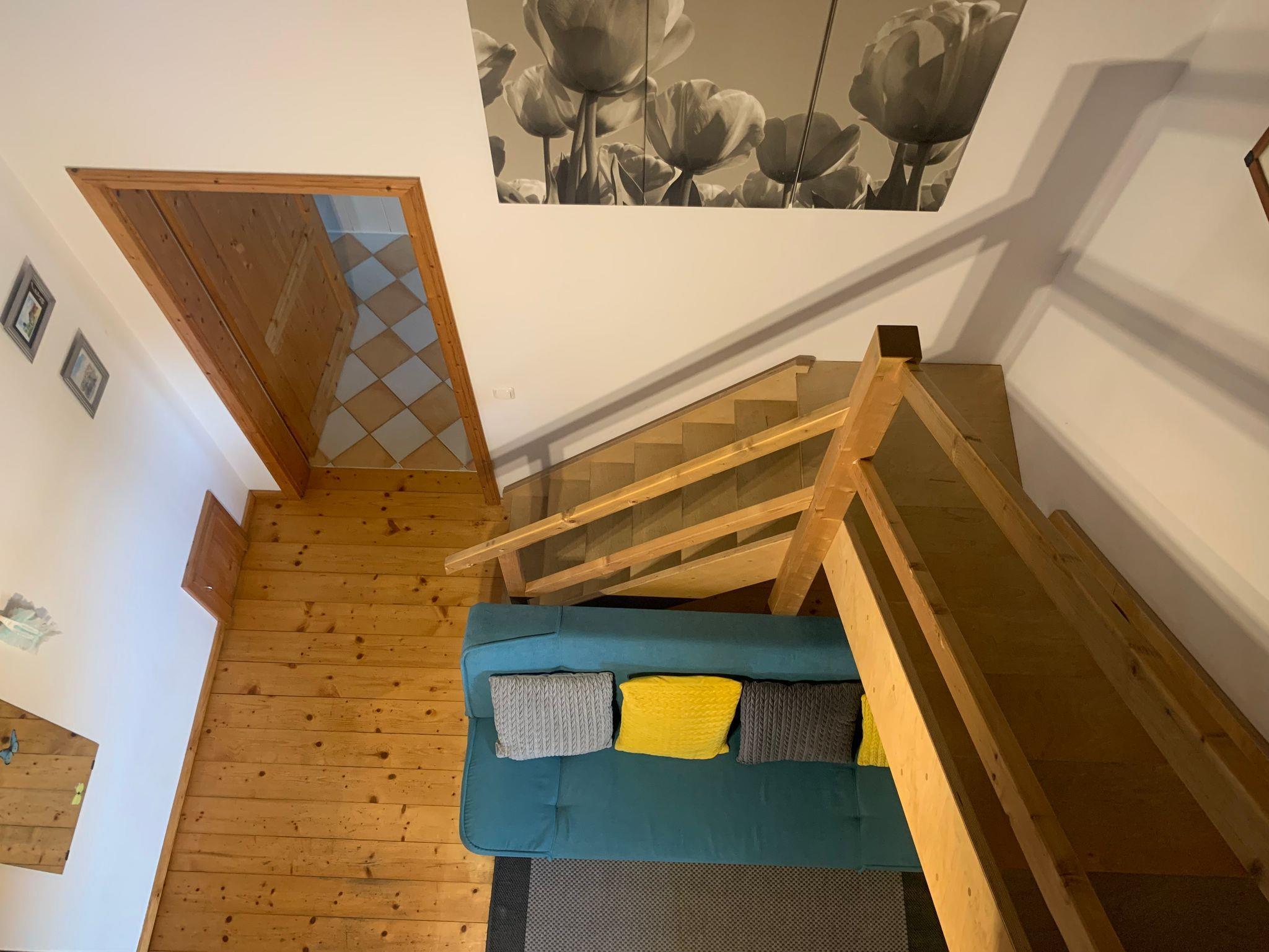 Die Wohnung liegt im 1. Stock und ist über eine Außentreppe erreichbar. Zur Ferienwohnung gehört ein eigener Freisitz mit Balkon. Die Wohnung ist konzipiert für maximal 4 Personen und hat insgesamt 4 Schlafmöglichkeiten. Es gibt ein Doppelbett in der Galerie, ein Einzelbett in der Küche, eine Schlafcouch im Wohnzimmer und ein Kinderbett. Der Wohn-/Schlafraum ist verbunden mit einer Galerie. Es gibt keine abgeschlossenen Zimmer. Die kleine Küche ist im Wohnraum mit integriert. Sie ist mit allen nötigen Geräten ausgestattet. Internet über freies WLAN.