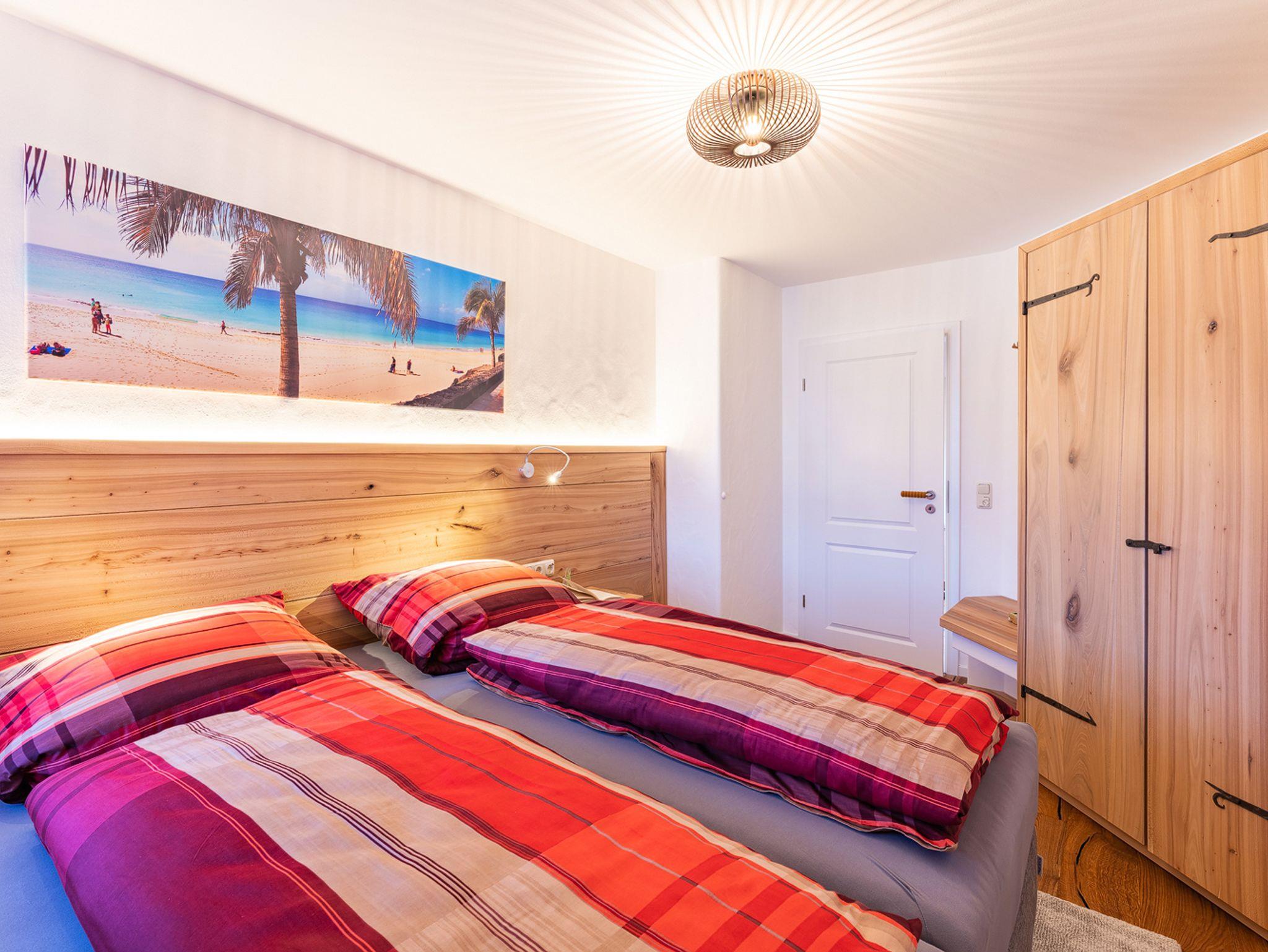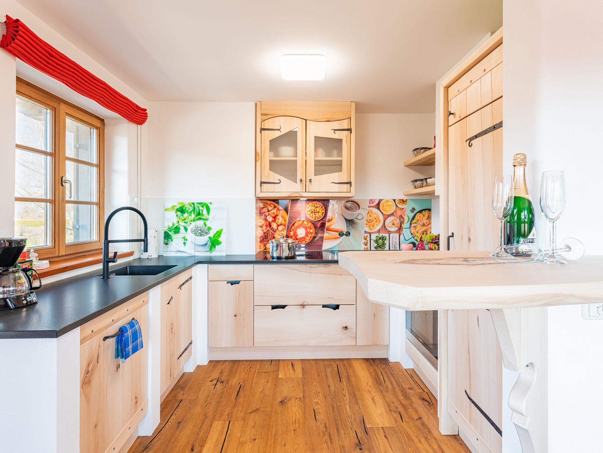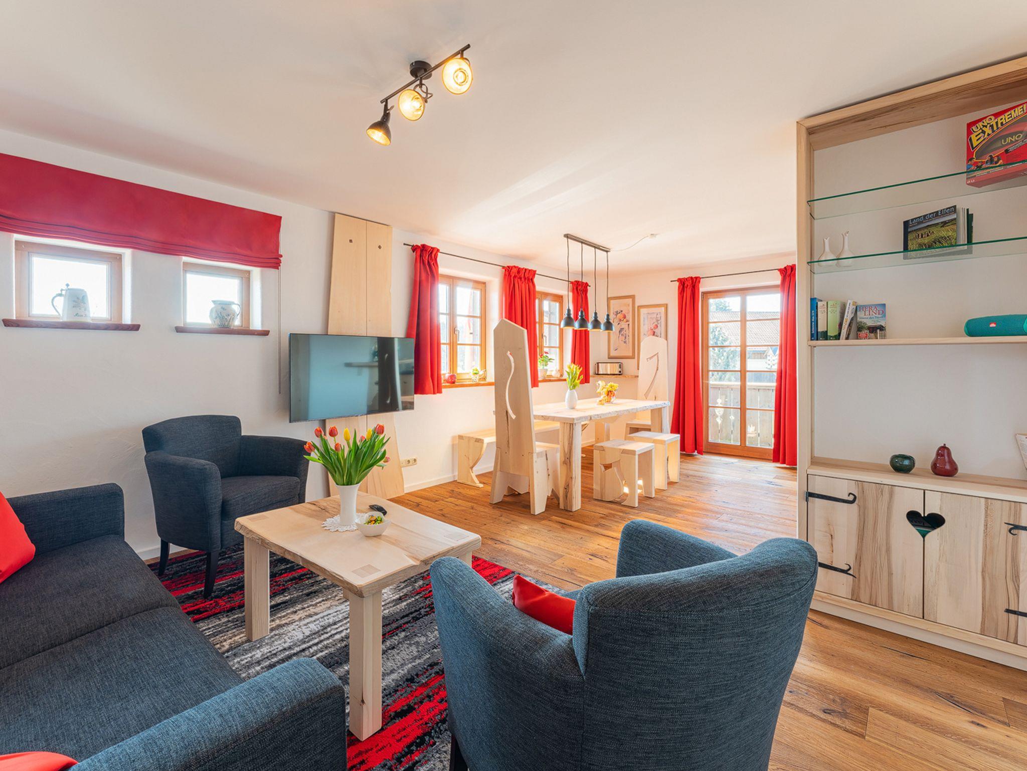 Die Ferienwohnung wurde im Frühjahr 2021 fertig gestellt und erfüllt viele Wohnwünsche. Sie ist modern, zeitgemäß und sehr gemütlich eingerichtet und spiegelt den Stil des Hausherrn perfekt wieder. Edle handgefertigte Holzmöbel und Böden mit bayerischen Touch erwarten den Gast. Die zwei Schlafzimmer sind mit Boxspringbetten ausgestattet. In den Schlafzimmern kann man die Doppelbetten sogar zu zwei Einzelbetten umfunktionieren. Das helle Tageslichtbad mit Dusche, WC, Waschtisch und kleinen Extras wird Sie begeistern. Stauraum für die Garderobe und dem restlichen Urlaubsgepäck sind großzügig vorhanden. Der Wohnraum ist gemütlich und stilvoll, natürlich mit großm TV und geht in den Essbereich und dann in die offene Küche über. Der große Esstisch läd zu gemütlicher Runde und Schlemmermenüs gleichermaßen ein. Und die Küche ist ein individueller Koch-Traum. Mit tollen Geräten und professionellem Zubehör vom Weinglas bis zum Profimesser. Mikrowelle, Geschirrspüle, Kühl/Gefrierkombination, Herd, Backofen und, und, und. Und wenn man mal nicht den tollen Ausblick vom Nord-Westbalkon genießen möchte, oder keine Lust zum selber Kochen hat, geht man einfach einen Stock tiefer und lässt sich kulinarisch im Restaurant vom Gastgeber und seinem Team verwöhnen.
