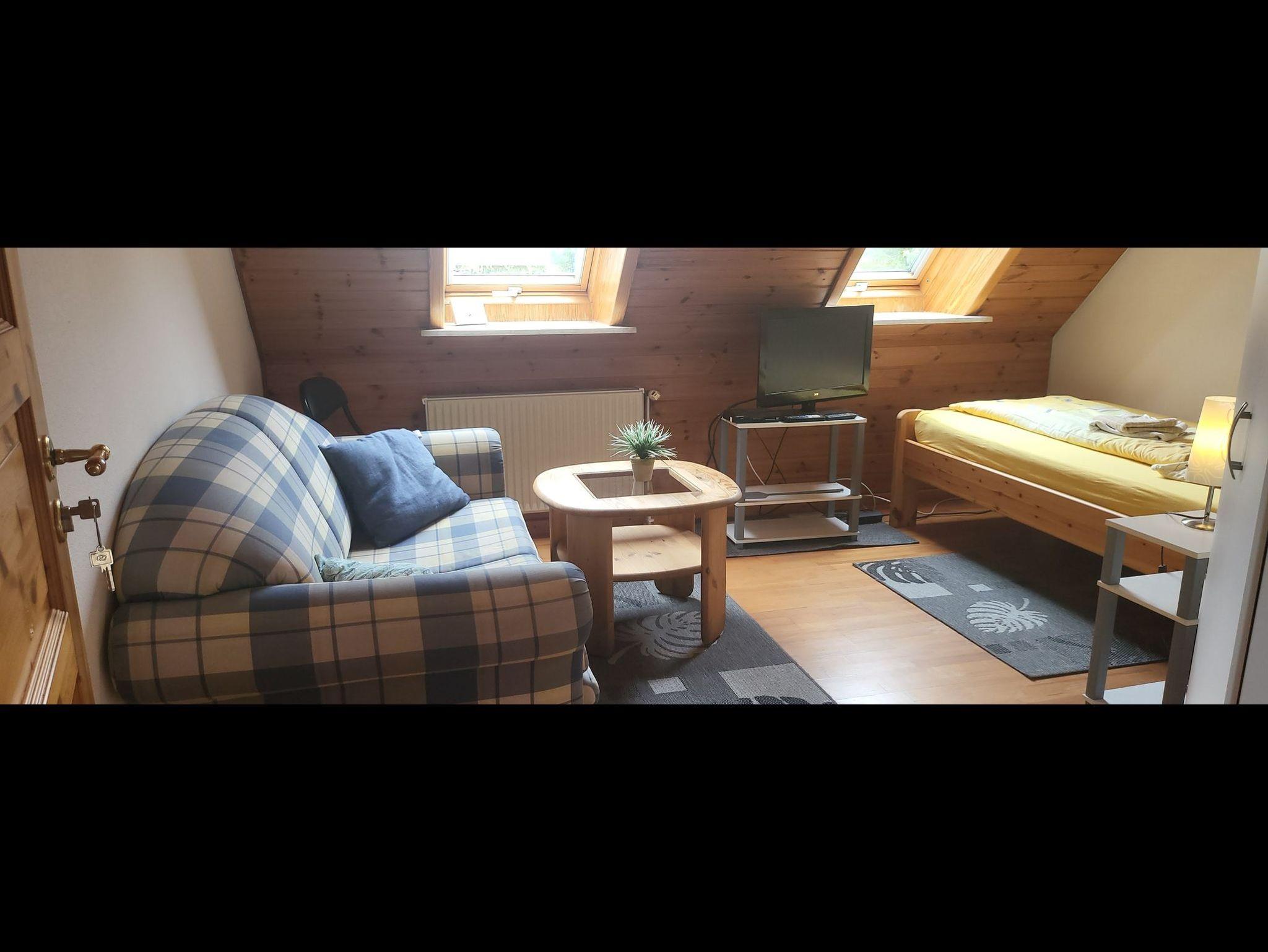 Monteurzimmer für Nichtraucher mit Einzelbett für 1 Person. Sessel, Tisch und Flachbild-TV.