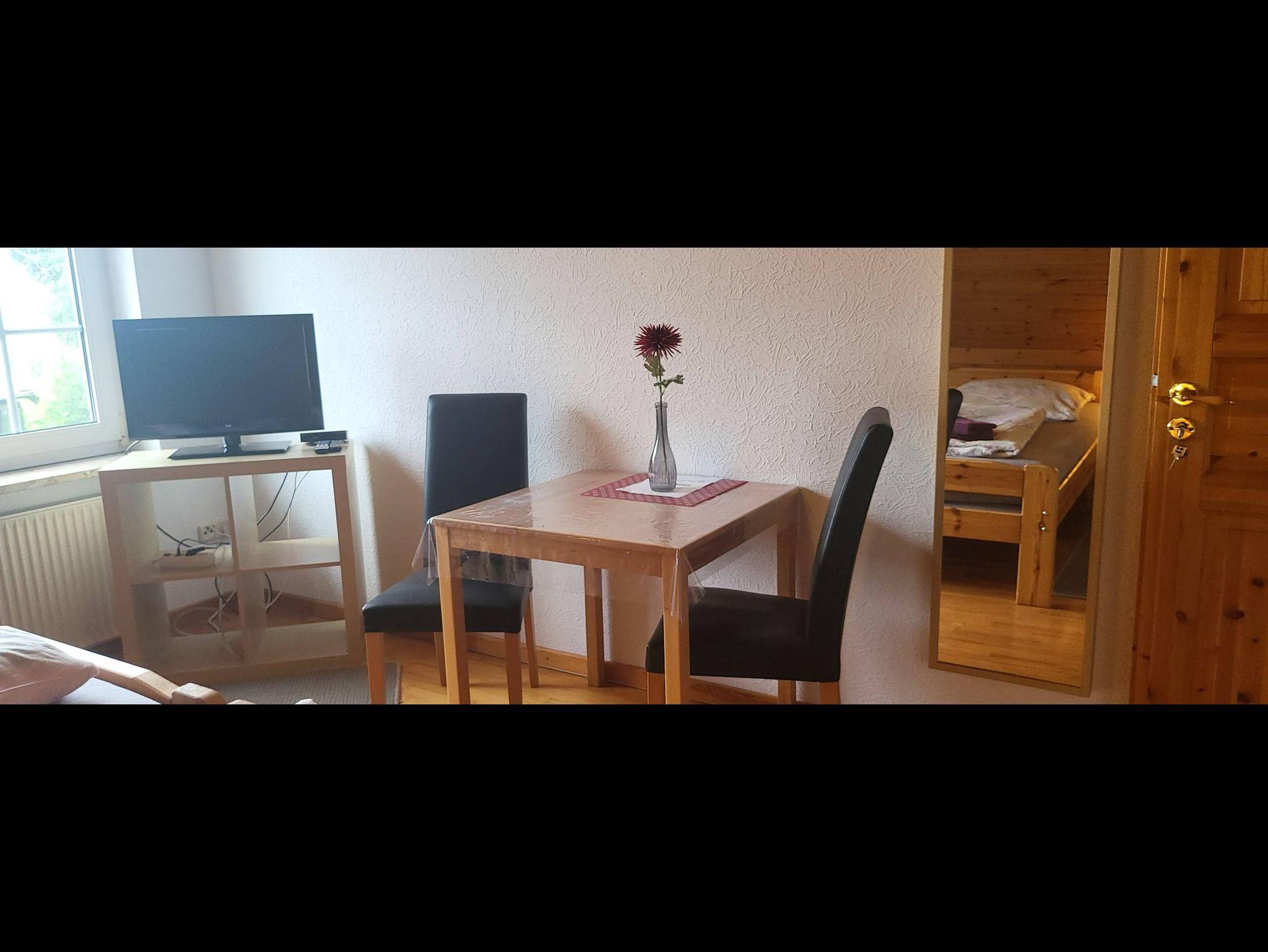 Monteurzimmer für Nichtraucher mit Doppelbett oder getrennt stehenden Betten für bis zu 2 Personen. Tisch mit Stühlen und Flachbild-TV.